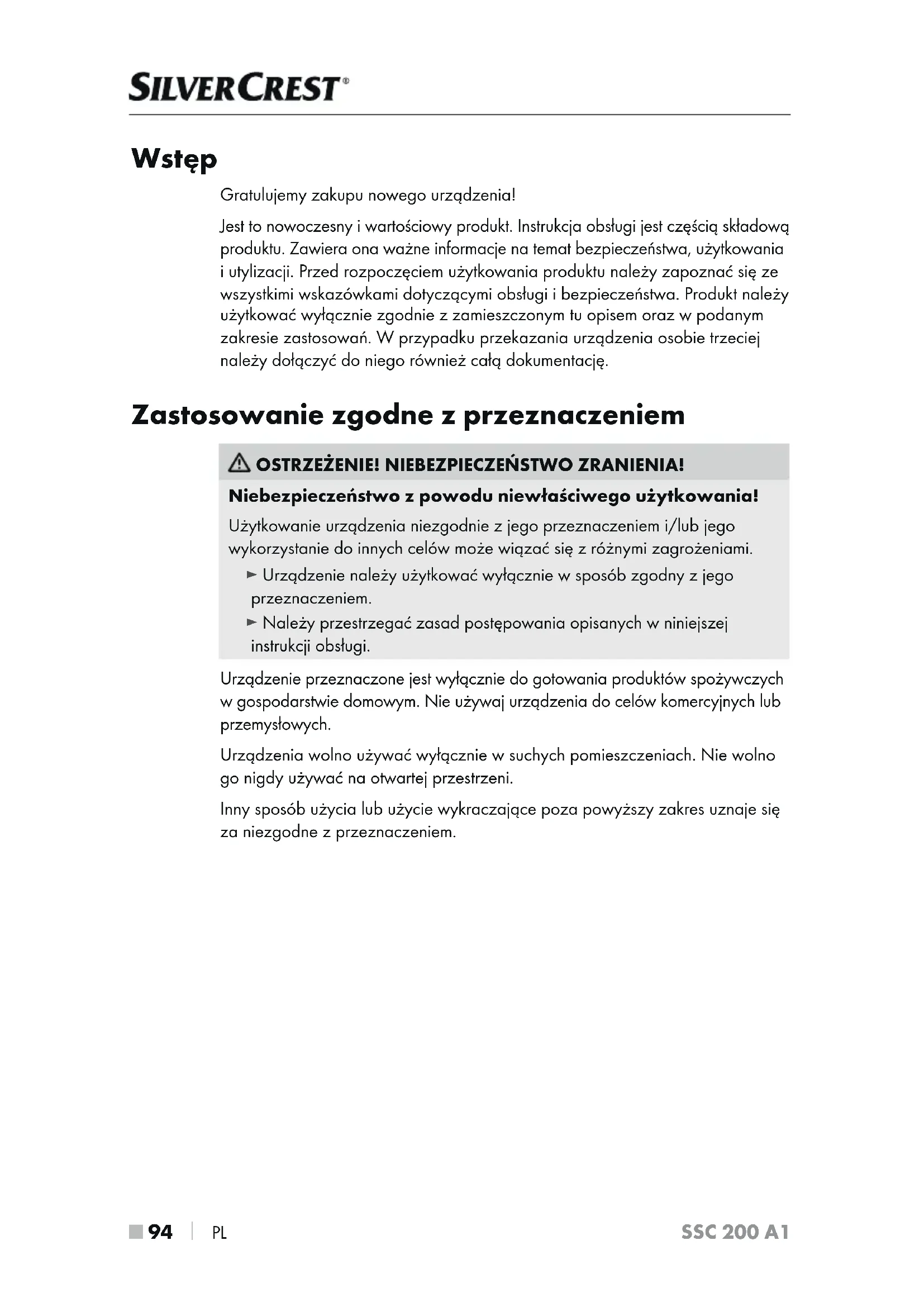 PL SSC 200 A1 Wstęp Gratulujemy zakupu nowego urządzenia! Jest to nowoczesny iwartościowy produkt. Instrukcja obsługi jest częścią składową produktu. Zawiera ona ważne informacje na temat bezpieczeństwa, użytkowania iutylizacji. Przed rozpoczęciem użytkowania produktu należy zapoznać się ze wszystkimi wskazówkami dotyczącymi obsługi ibezpieczeństwa. Produkt należy użytkować wyłącznie zgodnie zzamieszczonym tu opisem oraz wpodanym zakresie zastosowań. W przypadku przekazania urządzenia osobie trzeciej należy dołączyć do niego również całą dokumentację. Zastosowanie zgodne z przeznaczeniem OSTRZEŻENIE! NIEBEZPIECZEŃSTWO ZRANIENIA! Niebezpieczeństwo z powodu niewłaściwego użytkowania! Użytkowanie urządzenia niezgodnie z jego przeznaczeniem i/lub jego wykorzystanie do innych celów może wiązać się z różnymi zagrożeniami. ► Urządzenie należy użytkować wyłącznie w sposób zgodny z jego przeznaczeniem. ► Należy przestrzegać zasad postępowania opisanych wniniejszej instrukcji obsługi. Urządzenie przeznaczone jest wyłącznie do gotowania produktów spożywczych w gospodarstwie domowym. Nie używaj urządzenia do celów komercyjnych lub przemysłowych. Urządzenia wolno używać wyłącznie wsuchych pomieszczeniach. Nie wolno go nigdy używać na otwartej przestrzeni. Inny sposób użycia lub użycie wykraczające poza powyższy zakres uznaje się za niezgodne zprzeznaczeniem. IB_336973_SSC200A1_LB8.indb 94 07.07.2020 10:48:00PL