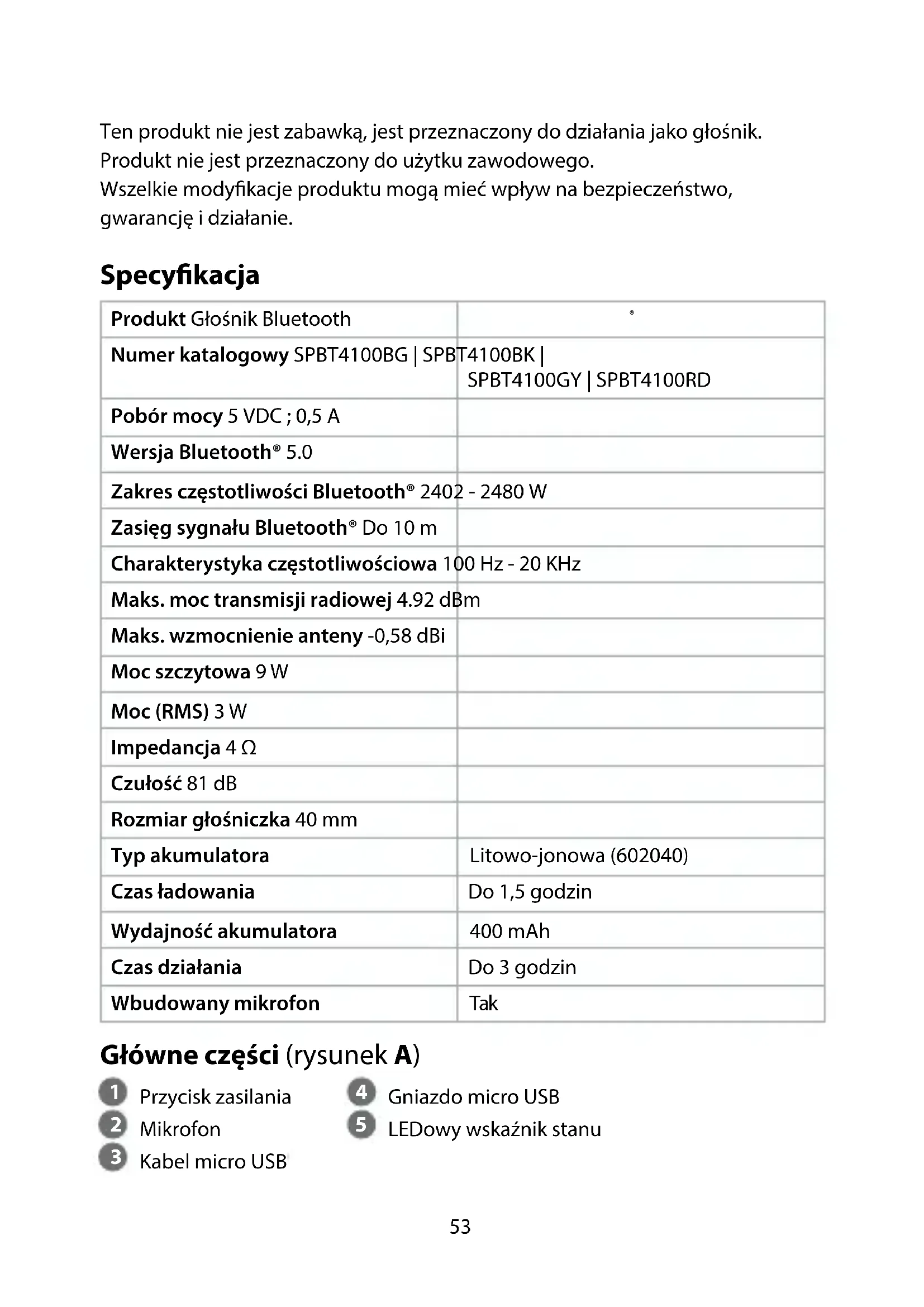 Pobór mocy 5 VDC ; 0,5 A Wersja Bluetooth® 5.0 Zakres częstotliwości Bluetooth® 2402 - 2480 W Zasięg sygnału Bluetooth® Do 10 m Charakterystyka częstotliwościowa 100 Hz - 20 KHz Maks. moc transmisji radiowej 4.92 dBm Maks. wzmocnienie anteny -0,58 dBi Moc szczytowa 9 W Moc (RMS) 3 W Impedancja 4 Ω Czułość 81 dB Rozmiar głośniczka 40 mm Typ akumulatora Litowo-jonowa (602040) Czas ładowania Do 1,5 godzin Wydajność akumulatora 400 mAh Czas działania Do 3 godzin Wbudowany mikrofon Tak Główne części (rysunek A)