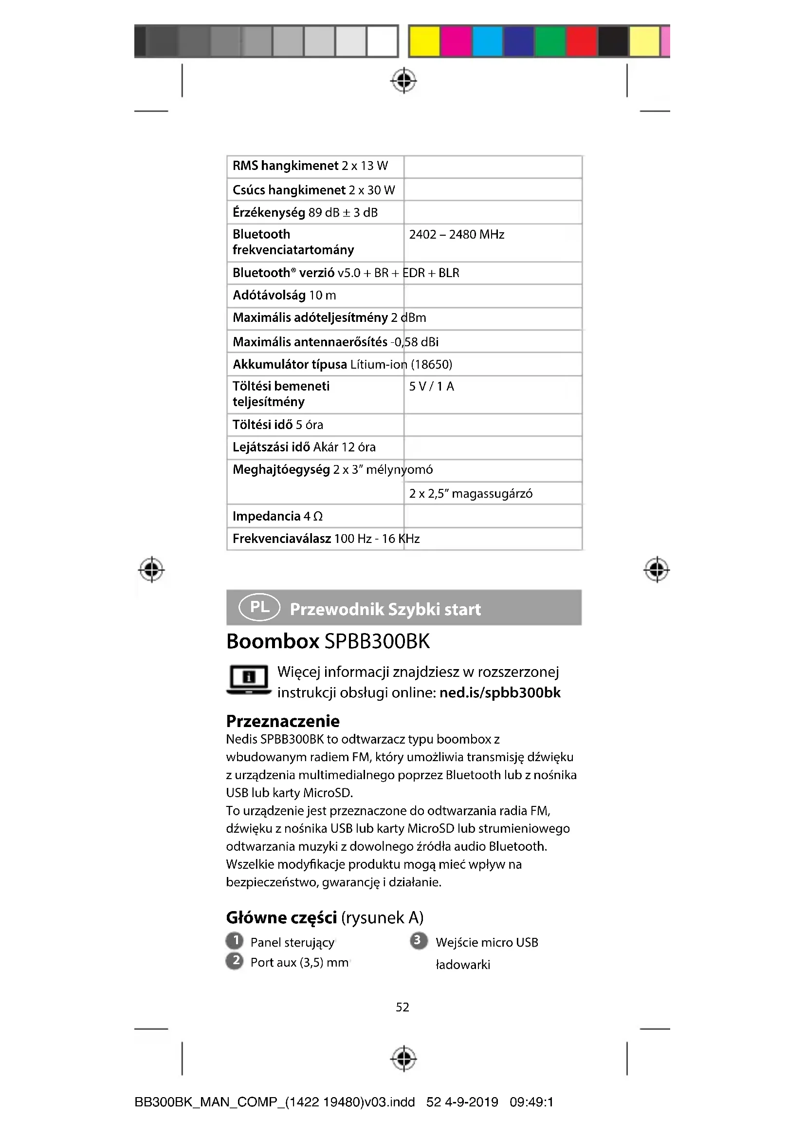 Specykacja Produkt Boombox Numer katalogowy SPBB300BK Wymiary (dł. x szer. x wys.) 444 x 158 x 199 mm Waga 2,6 kg Kanały Stereo SPBB300BK_MAN_COMP_(1422 19480)v03.indd 55 4-9-2019 09:49:1356 Wyjście audio RMS 2 x 13 W Szczytowe wyjście audio 2 x 30 W Czułość 89 dB ± 3 dB Zakres częstotliwości Bluetooth 2402 - 2480 MHz Wersja Bluetooth® v5.0 + BR + EDR + BLR Odległość transmisji 10 m Maksymalna moc transmisji 2 dBm Maksymalne wzmocnienie sygnału antenowego -0,58 dBi Typ akumulatora Litowo-jonowa (18650) Moc wejścia ładowania 5 V / 1 A Czas ładowania 5 godzin Czas odtwarzania Do 12 godzin Sterownik 2 x 3" głośnik niskotonowy 2 x 2.5" głośnik wysokotonowy Impedancja 4 Ω Charakterystyka częstotliwościowa 100 Hz - 16 KHz