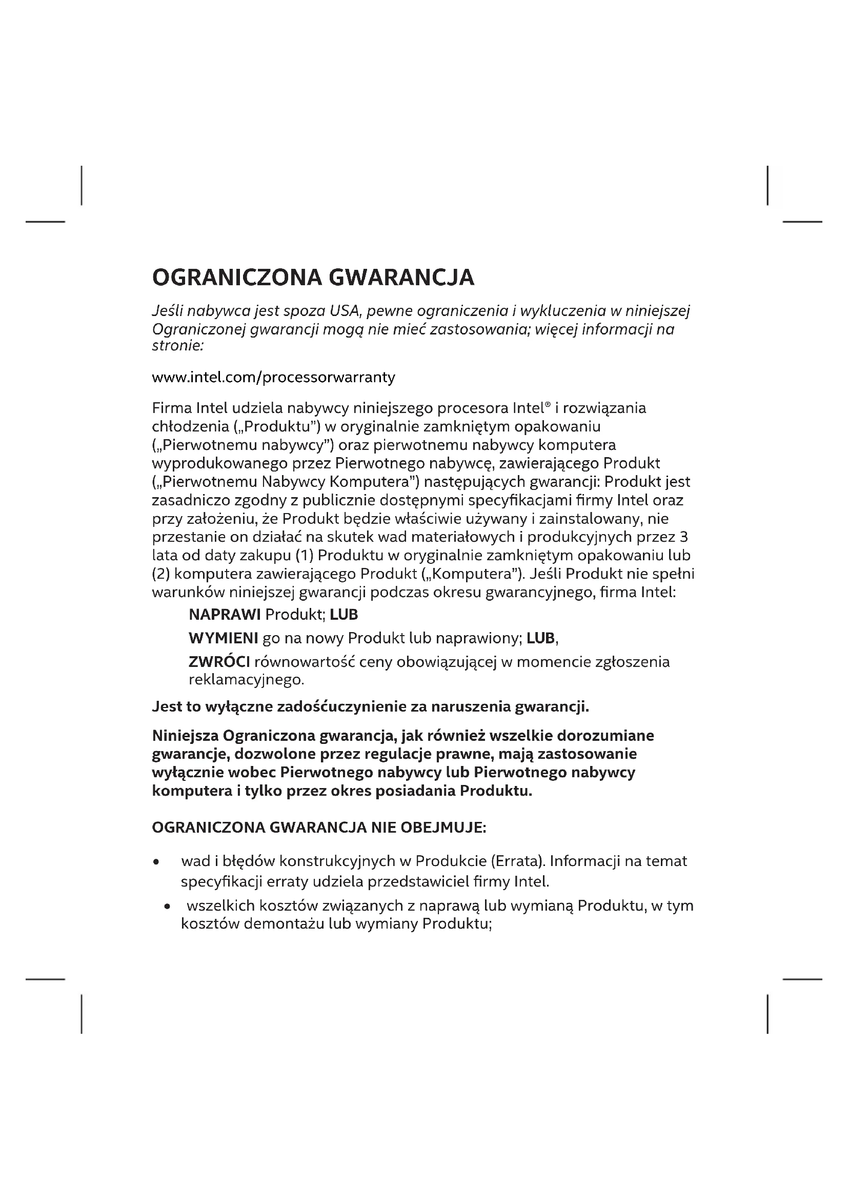 Odpowiedzialność rmy Intel wynikająca z niniejszej lub dowolnej innej gwarancji dorozumianej lub bezpośredniej ogranicza się do naprawy, wymiany lub zwrotu kosztów. W przypadku naruszenia gwarancji takie zadośćuczynienie jest jedynym i wyłącznym środkiem. W maksymalnym zakresie przewidzianym prawem rma Intel nie ponosi odpowiedzialności za żadne bezpośrednie, szczególne, przypadkowe ani wynikowe szkody, wynikające z wszelkich naruszeń gwarancji, ani w myśl żadnych innych teorii prawnych (łącznie z utratą zysków, przestojem, utratą wartości przedsiębiorstwa, uszkodzeniem lub wymianą sprzętu lub własności, ani żadnych kosztów usuwania skutków awarii, przeprogramowania lub odtwarzania programów lubdanych przechowywanych lub używanych w Komputerze), nawet jeśli rma Intel została poinformowana o możliwości wystąpienia takich szkód. W niektórych stanach (i jurysdykcjach) wykluczanie i ograniczanie odpowiedzialności za szkody przypadkowe i wynikowe jest niedozwolone, więc to ograniczenie może nie dotyczyć Nabywcy. Niniejsza gwarancja nadaje nabywcy określone prawa. Nabywca może mieć również inne prawa zależne od regionu i jurysdykcji. Strony zgadzają się, że Konwencja Narodów Zjednoczonych o umowach międzynarodowej sprzedaży towarów (1980) jest wyłączona i nie ma zastosowania do niniejszej Umowy. Wszelkie spory wynikające lub związane z niniejszą Ograniczoną gwarancją będą rozpatrywane przez następujące sądy i będą podlegać następującym przepisom (z wyjątkiem Chin kontynentalnych), bez względu na zasady koniktu praw: w przypadku USA i pozostałych części Ameryk, właściwym miejscem jest sąd stanu Delaware, (USA) lub sądy federalne w tym państwie, a właściwym prawem jest prawo obowiązujące w stanie Delaware. W przypadku krajów Azji i Pacyku właściwym miejscem jest Singapur, a właściwym prawem prawo obowiązujące w Singapurze. W przypadku Japonii właściwym miejscem jest Tokio, a właściwym prawem prawo obowiązujące w Japonii. Dla Europy i reszty świata właściwym miejscem jest Londyn, a właściwym prawem prawo Anglii i Walii. W przypadku niezgodności wersji angielskiej Ograniczonej gwarancji z wersją przetłumaczoną, rozstrzygające znaczenie będzie miała wersja angielska (z wyjątkiem wersji w języku chińskim uproszczonym).제한적 보증 미국 이외 지역에 소재하고 있는 소비자인 경우에는 본 제한적 보증의 일부 제한 및 예외 사항이 적용되지 않을 수도 있습니다. 다음 내용을 읽어 주십시오: www.intel.com/processorwarranty 인텔은 원래의 밀봉된 포장에 담겨 제공되는 이 인텔® 프로세서와 열 솔루션(“제품”) 의 구매자(“원 구매자”) 그리고 제품을 포함시켜 원 구매자가 제조한 컴퓨터 시스템의 원 구매자(“원 시스템 고객”)에 대해, 제품이 인텔에서 공개한 사양을 대체적으로 준수할 것이며, 제품을 올바르게 사용하고 설치할 경우 (1) 원래 밀봉된 포장에 담긴 제품 또는 (2) 제품이 포함된 컴퓨터 시스템(“컴퓨터 시스템”)의 구매일로부터 3년 동안 재료와 제조상 하자로 인한 작동 중지가 없을 것임을 보증합니다. 보증 기간 중 제품이 위 보증 내용을 준수하지 않을 경우 인텔은 다음 조치 중 하나를 선택합니다.