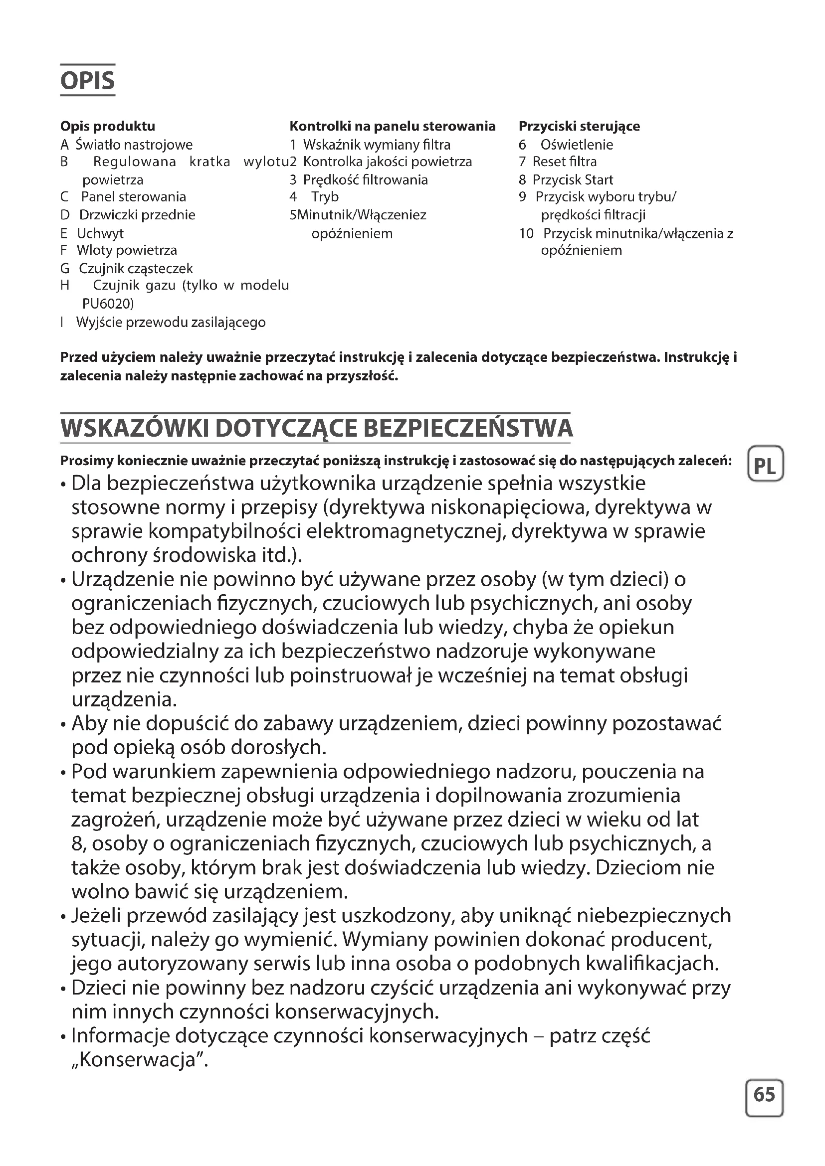 OPIS Opis produktu A Światło nastrojowe B Regulowana kratka wylotu powietrza C Panel sterowania D Drzwiczki przednie E Uchwyt F Wloty powietrza G Czujnik cząsteczek H Czujnik gazu (tylko w modelu PU6020) I Wyjście przewodu zasilającego Kontrolki na panelu sterowania 1 Wskaźnik wymiany ltra 2 Kontrolka jakości powietrza 3 Prędkość ltrowania 4 Tryb 5 Minutnik/Włączenie z opóźnieniem Przyciski sterujące 6 Oświetlenie 7 Reset ltra 8 Przycisk Start 9 Przycisk wyboru trybu/ prędkości ltracji 10 Przycisk minutnika/włączenia z opóźnieniem Przed użyciem należy uważnie przeczytać instrukcję i zalecenia dotyczące bezpieczeństwa. Instrukcję i zalecenia należy następnie zachować na przyszłość.