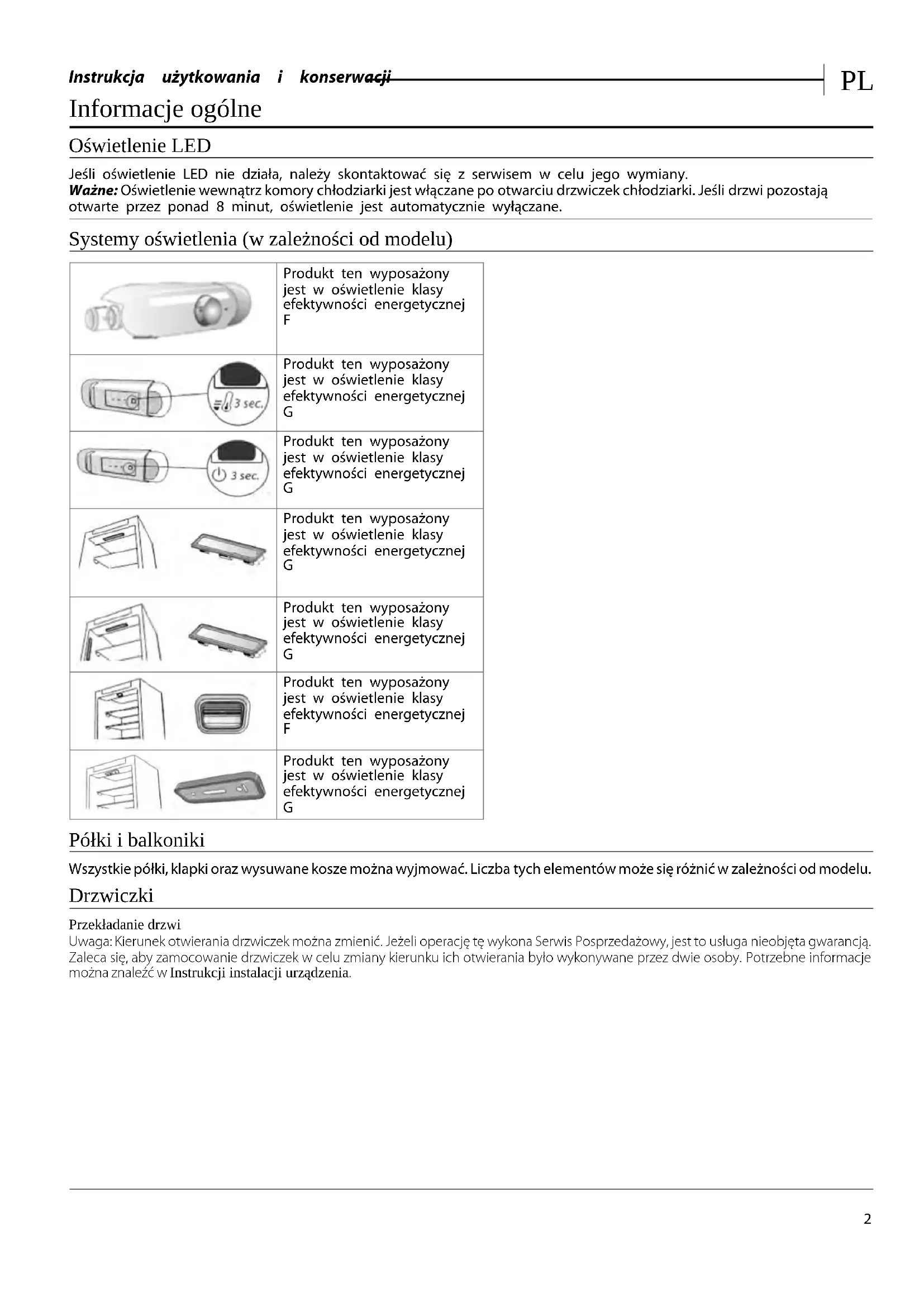 Informacje ogólne Oświetlenie LED Jeśli oświetlenie LED nie działa, należy skontaktować się z serwisem w celu jego wymiany. Ważne: Oświetlenie wewnątrz komory chłodziarki jest włączane po otwarciu drzwiczek chłodziarki. Jeśli drzwi pozostają otwarte przez ponad 8 minut, oświetlenie jest automatycznie wyłączane. Systemy oświetlenia (w zależności od modelu) Produkt ten wyposażony jest w oświetlenie klasy efektywności energetycznej