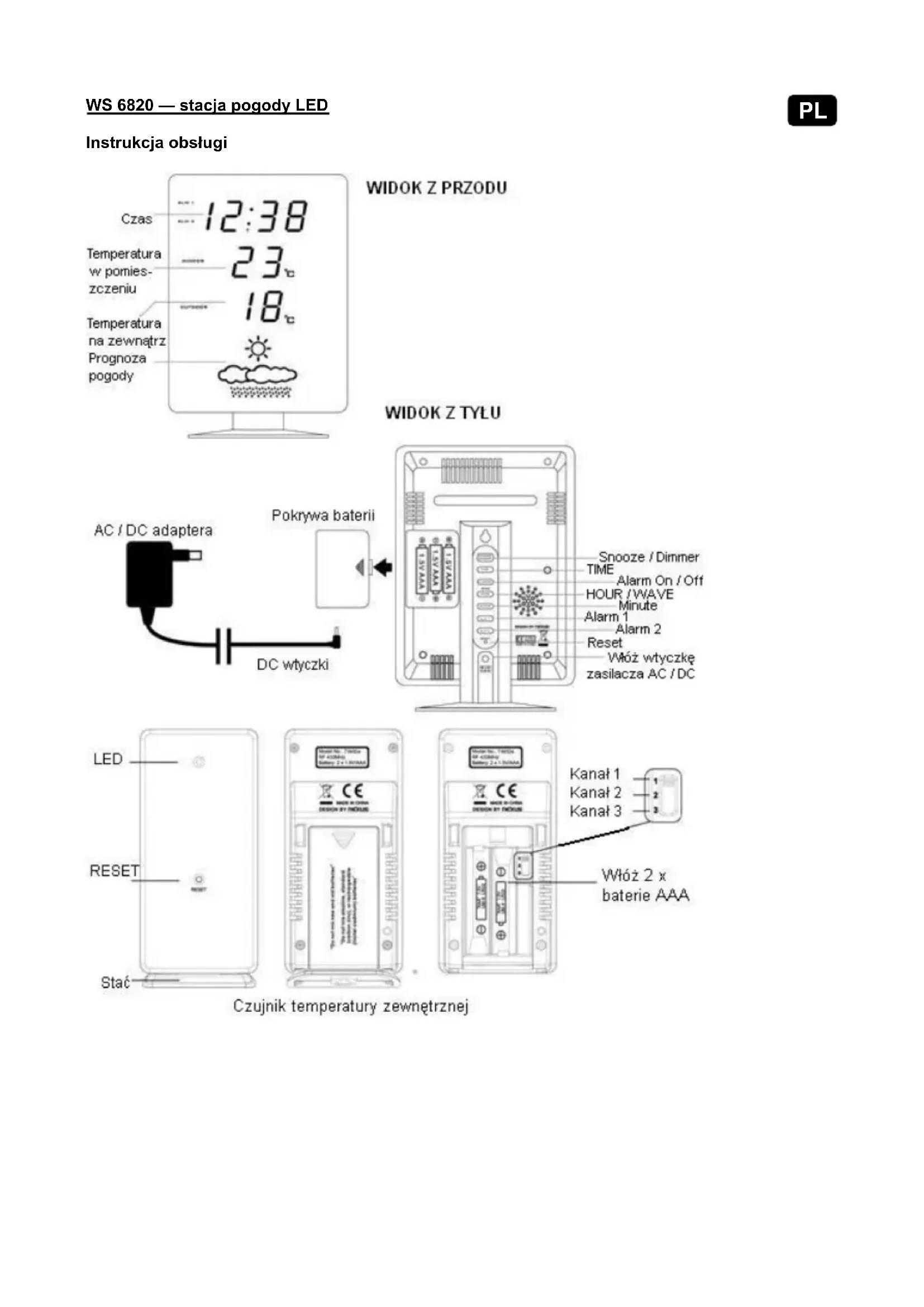 - w poruszających się pojazdach Stację należy ustawić w miejscu z optymalnym sygnałem, tzn. blisko okna i z dala od powierzchni metalowych lub urządzeń elektrycznych. SZYBKA KONFIGURACJA Krok 1 Włożyć adapter AC/DC do dowolnego gniazdka domowego AC. Następnie podłączyć wtyczkę zasilającą z tyłu stacji. Krok 2 Otworzyć pokrywę baterii z tyłu stacji i włożyć 3 baterie AAA (nie dołączone) do komory baterii, zwracając uwagę na prawidłową polaryzację +/-. Założyć pokrywę baterii. Krok 3 Stacja i nadajnik zewnętrzny powinny znajdować się blisko siebie. Otworzyć pokrywę baterii z tyłu nadajnika zewnętrznego. Upewniwszy się, że przełącznik wyboru kanału z tyłu nadajnika zewnętrznego znajduje się w położeniu 1 (położenie górne), włożyć 2 baterie AAA (nie dołączone) do komory baterii, zwracając uwagę na prawidłową polaryzację +/-. Założyć pokrywę baterii. W ciągu kilku sekund stacja otrzyma sygnał danych z nadajnika zewnętrznego. Uwaga: Stacja otrzymuje sygnały tylko z jednego nadajnika zewnętrznego. Należy pamiętać, że maksymalny zakres przekazu nadajnika zewnętrznego wynosi 100 m, bez żadnych przeszkód. Rzeczywisty zakres przekazu zależy od tego, czy na ścieżce sygnału znajdują się jakiekolwiek przeszkody. Każda przeszkoda (dach, ściany, podłogi, sufity, grube drzewa, itd.) będą zmniejszały zakres sygnału o połowę. Uchwyt należy zamocować na dole nadajnika zewnętrznego jako podstawę lub z tyłu w celu jego montażu na ścianie. Następnie umieścić nadajnik zewnętrzny w suchym i zacienionym miejscu na zewnątrz. Krok 4 Usunąć ochronną naklejkę na przedzie stacji. Stacja jest teraz gotowa do pracy. Po otrzymaniu danych o temperaturze na zewnątrz z nadajnika, stacja rozpocznie wyszukiwanie sygnału czasu DCF. Może to potrwać całą noc. Jeśli stacja nie pobierze sygnału czasu DCF, zegar należy ustawić ręcznie. Podczas odbioru sygnału czasu DCF termometr nie dokonuje pomiarów temperatury. Przełącza się na niski poziom jasności i powróci do wysokiego poziomu jasności dopiero po odbiorze sygnału czasu DCF. Po pierwszej instalacji odczyty temperatury ustabilizują się i staną się bardziej dokładne po około 30 minutach. Baterie zastępcze Jeśli stacja nie jest podłączona do źródła zasilania lub zasilanie zostanie przerwane, będzie ona zasilana przez baterie zastępcze. Wyświetlacz LED jest wyłączony, ale czas i czas alarmu pozostają zapisane (również w przypadku awarii zasilania). Również funkcje alarmu pracują w normie.