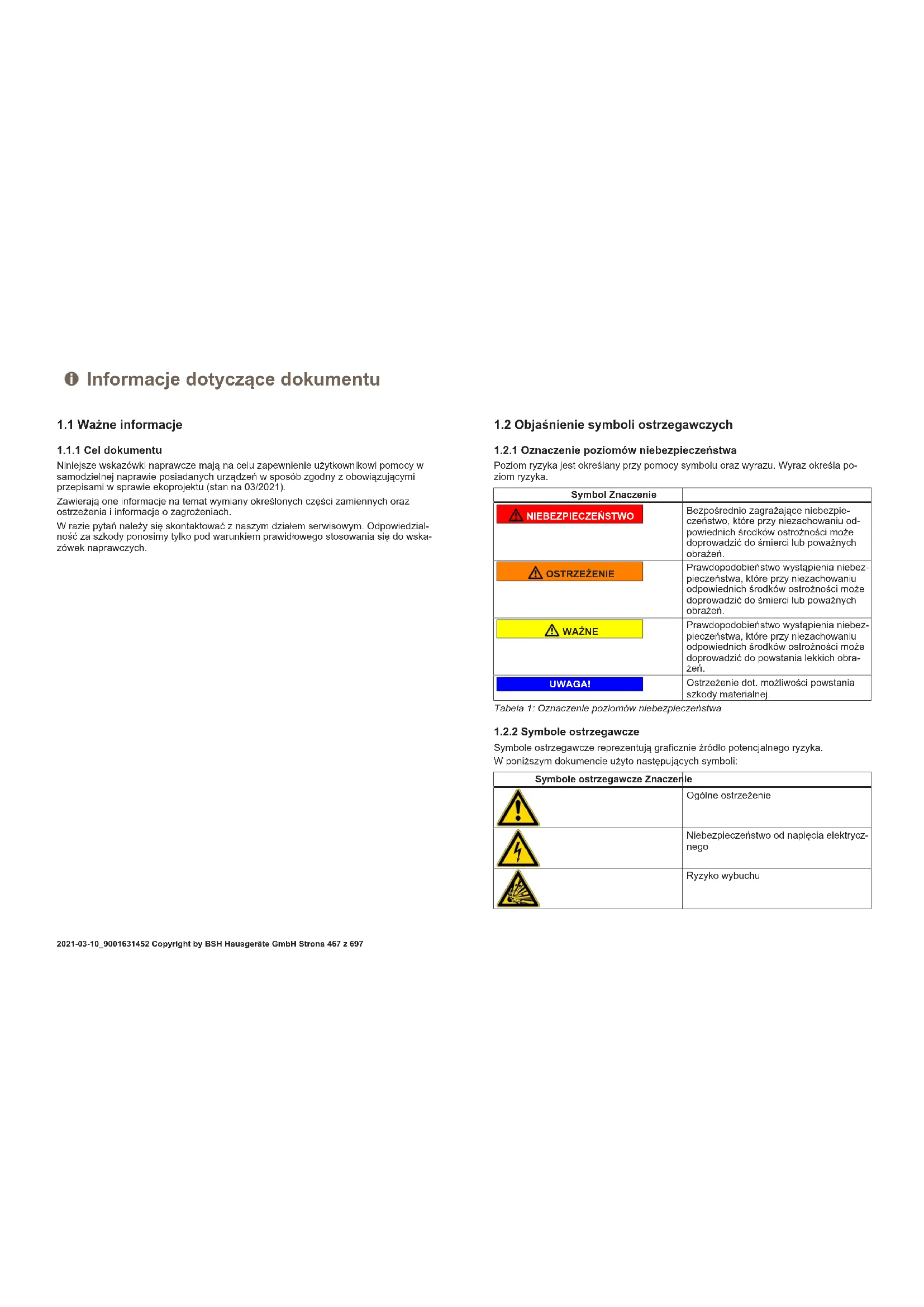 Poniższe symbole są używane w dokumentacji: Symbol Znaczenie Identyfikacja specjalnej wskazówki (tekst lub grafika) Identyfikacja prostej wskazówki (tylko tekst) Identyfikacja linku do pliku wideo Identyfikacja narzędzi Identyfikacja wstępnych warunków Identyfikacja warunku (jeżeli) Identyfikacja rezultatu Start Identyfikacja przycisku [00123456] Identyfikacja numeru materiału Status Identyfikacja wyświetlanego tekstu / ko- munikatu (na wyświetlaczu) Tabela3: Ogólne symbole Informacje dotyczące dokumentu 2021-03-10_9001631452 Copyright by BSH Hausgeräte GmbH Strona468z697Bezpieczeństwo