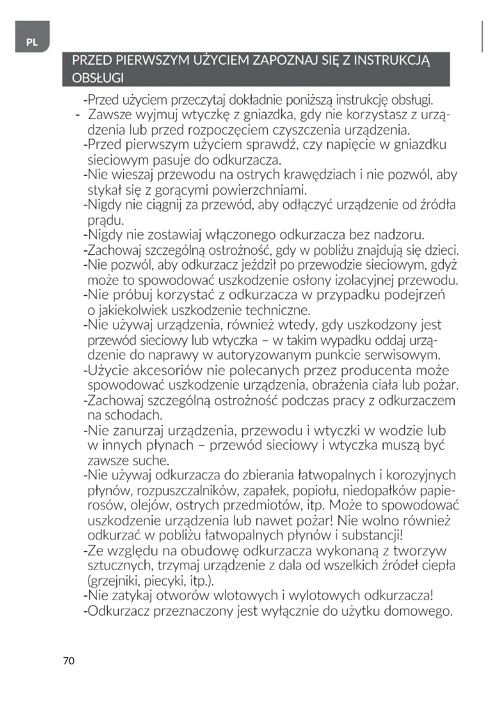 Odkurzacz przeznaczony jest wyłącznie do użytku domowego.71