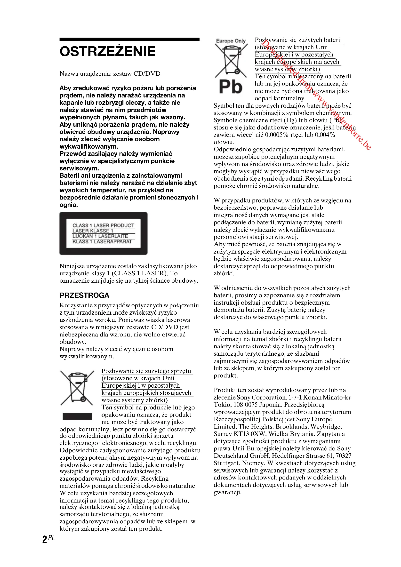 OSTRZEŻENIE Nazwa urządzenia: zestaw CD/DVDAby zredukować ryzyko pożaru lub porażenia prądem, nie należy narażać urządzenia na kapanie lub rozbryzgi cieczy, a także nie należy stawiać na nim przedmiotów wypełnionych płynami, takich jak wazony.Aby uniknąć porażenia prądem, nie należy otwierać obudowy urządzenia. Naprawy należy zlecać wyłącznie osobom wykwalifikowanym.Przewód zasilający należy wymieniać wyłącznie w specjalistycznym punkcie serwisowym.Baterii ani urządzenia z zainstalowanymi bateriami nie należy narażać na działanie zbyt wysokich temperatur, na przykład na bezpośrednie działanie promieni słonecznych i ognia.Niniejsze urządzenie zostało zaklasyfikowane jako urządzenie klasy 1 (CLASS 1 LASER). To oznaczenie znajduje się na tylnej ściance obudowy. PRZESTROGA Korzystanie z przyrządów optycznych w połączeniu z tym urządzeniem może zwiększyć ryzyko uszkodzenia wzroku. Ponieważ wiązka laserowa stosowana w niniejszym zestawie CD/DVD jest niebezpieczna dla wzroku, nie wolno otwierać obudowy.Naprawy należy zlecać wyłącznie osobom wykwalifikowanym.Pozbywanie się zużytego sprzętu (stosowane w krajach Unii Europejskiej i w pozostałych krajach europejskich stosujących własne systemy zbiórki)Ten symbol na produkcie lub jego opakowaniu oznacza, że produkt nie może być traktowany jako odpad komunalny, lecz powinno się go dostarczyć do odpowiedniego punktu zbiórki sprzętu elektrycznego i elektronicznego, w celu recyklingu. Odpowiednie zadysponowanie zużytego produktu zapobiega potencjalnym negatywnym wpływom na środowisko oraz zdrowie ludzi, jakie mogłyby wystąpić w przypadku niewłaściwego zagospodarowania odpadów. Recykling materiałów pomaga chronić środowisko naturalne. W celu uzyskania bardziej szczegółowych informacji na temat recyklingu tego produktu, należy skontaktować się z lokalną jednostką samorządu terytorialnego, ze służbami zagospodarowywania odpadów lub ze sklepem, w którym zakupiony został ten produkt.Pozbywanie się zużytych baterii (stosowane w krajach Unii Europejskiej i w pozostałych krajach europejskich mających własne systemy zbiórki)Ten symbol umieszczony na baterii lub na jej opakowaniu oznacza, że nie może być ona traktowana jako odpad komunalny.Symbol ten dla pewnych rodzajów baterii może być stosowany w kombinacji z symbolem chemicznym. Symbole chemiczne rtęci (Hg) lub ołowiu (Pb) stosuje się jako dodatkowe oznaczenie, jeśli bateria zawiera więcej niż 0,0005% rtęci lub 0,004% ołowiu.Odpowiednio gospodarując zużytymi bateriami, możesz zapobiec potencjalnym negatywnym wpływom na środowisko oraz zdrowie ludzi, jakie mogłyby wystąpić w przypadku niewłaściwego obchodzenia się z tymi odpadami. Recykling baterii pomoże chronić środowisko naturalne.W przypadku produktów, w których ze względu na bezpieczeństwo, poprawne działanie lub integralność danych wymagane jest stałe podłączenie do baterii, wymianę zużytej baterii należy zlecić wyłącznie wykwalifikowanemu personelowi stacji serwisowej.Aby mieć pewność, że bateria znajdująca się w zużytym sprzęcie elektrycznym i elektronicznym będzie właściwie zagospodarowana, należy dostarczyć sprzęt do odpowiedniego punktu zbiórki.W odniesieniu do wszystkich pozostałych zużytych baterii, prosimy o zapoznanie się z rozdziałem instrukcji obsługi produktu o bezpiecznym demontażu baterii. Zużytą baterię należy dostarczyć do właściwego punktu zbiórki.W celu uzyskania bardziej szczegółowych informacji na temat zbiórki i recyklingu baterii należy skontaktować się z lokalną jednostką samorządu terytorialnego, ze służbami zajmującymi się zagospodarowywaniem odpadów lub ze sklepem, w którym zakupiony został ten produkt.Produkt ten został wyprodukowany przez lub na zlecenie Sony Corporation, 1-7-1 Konan Minato-ku Tokio, 108-0075 Japonia. Przedsiębiorcą wprowadzającym produkt do obrotu na terytorium Rzeczypospolitej Polskiej jest Sony Europe Limited, The Heights, Brooklands, Weybridge, Surrey KT13 0XW, Wielka Brytania. Zapytania dotyczące zgodności produktu z wymaganiami prawa Unii Europejskiej należy kierować do Sony Deutschland GmbH, Hedelfinger Strasse 61, 70327 Stuttgart, Niemcy. W kwestiach dotyczących usług serwisowych lub gwarancji należy korzystać z adresów kontaktowych podanych w oddzielnych dokumentach dotyczących usług serwisowych lub gwarancji. Downloaded from www.vandenborre.be3