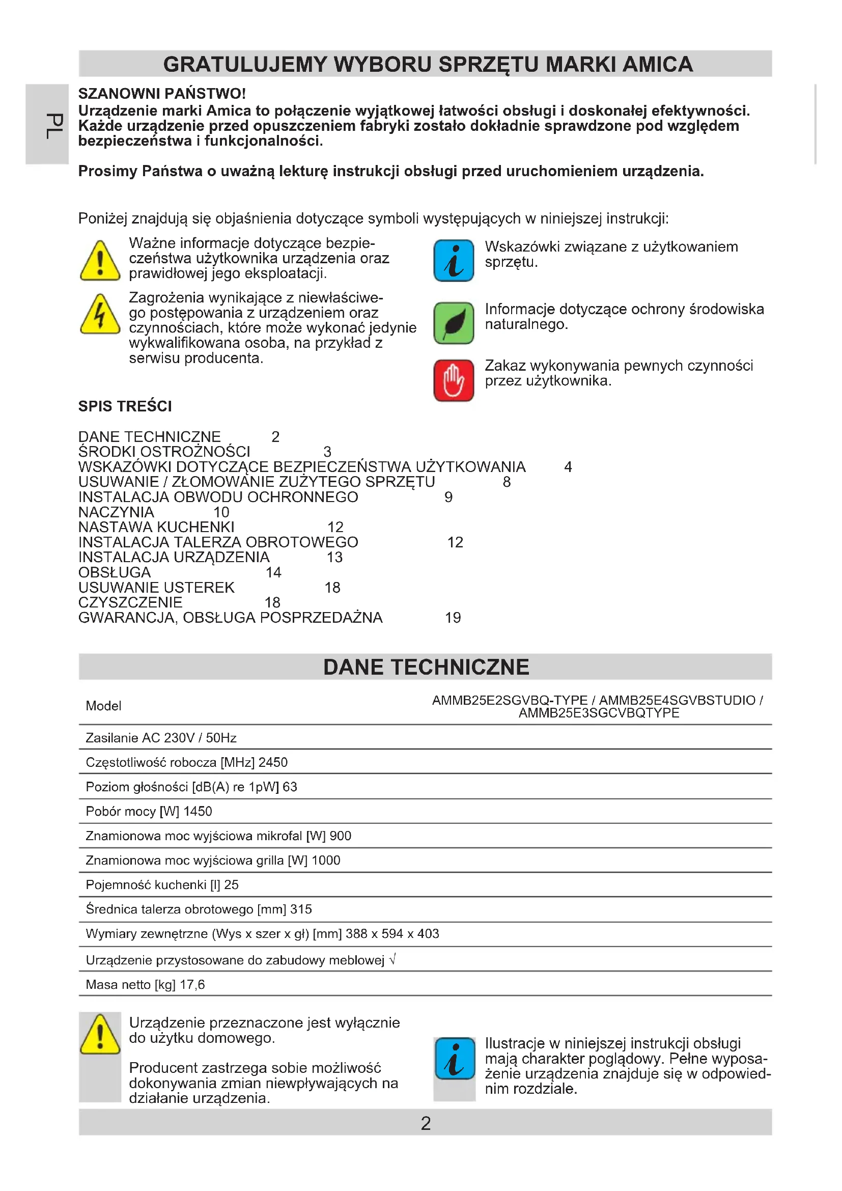 Ilustracje w niniejszej instrukcji obsługi mają charakter poglądowy. Pełne wyposa- żenie urządzenia znajduje się w odpowied- nim rozdziale. ModelAMMB25E2SGVBQ-TYPE / AMMB25E4SGVBSTUDIO / AMMB25E3SGCVBQTYPEZasilanie AC 230V / 50HzCzęstotliwość robocza [MHz] 2450Poziom głośności [dB(A) re 1pW] 63Pobór mocy [W] 1450Znamionowa moc wyjściowa mikrofal [W] 900Znamionowa moc wyjściowa grilla [W] 1000Pojemność kuchenki [l] 25Średnica talerza obrotowego [mm] 315Wymiary zewnętrzne (Wys x szer x gł) [mm] 388 x 594 x 403Urządzenie przystosowane do zabudowy meblowej √Masa netto [kg] 17,6 DANE TECHNICZNE SPISTREŚCI DANE TECHNICZNE 2