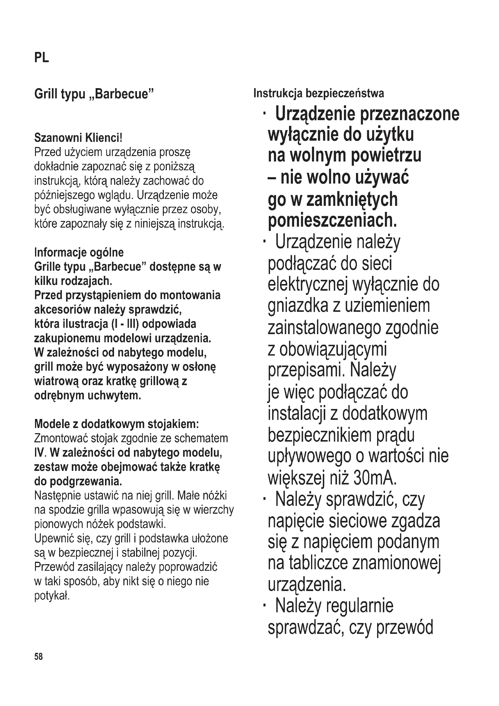 zapobiega nadmiernemu dymieniu i ułatwia późniejsze czyszczenie. ∙ Podczas używania urządzenia poziom wody w komorze grilla zawsze musi znajdować się pomiędzy oznaczeniami Min. i Max. – Wskaźnik poziomu wody - Minimum – Wskaźnik poziomu wody - Maximum Poziom wody powinien zawsze utrzymywać się powyżej oznaczenia „Min”. Wodę należy dolewać z odpowiednim wyprzedzeniem, pamiętając, aby nie zetknęła się ona z elementem grzejnym. Ostrzeżenie: Przed przystąpieniem do dolewania wody, odłączyć grilla od zasilania. ∙ Każdorazowo przed użyciem grilla sprawdzić, czy element grzejny jest prawidłowo włożony do komory grilla i obudowy. ∙ Nie pozostawiać włączonego urządzenia bez nadzoru. ∙ Należy pamiętać, że podczas pracy urządzenia obudowa oraz element grzejny osiągają bardzo wysokie temperatury. Nie dotykać elementu grzejnego nawet po wyłączeniu. Odczekać aż ostygnie – w przeciwnym razie istnieje poważne niebezpieczeństwo oparzenia. ∙ Aby zapobiec groźbie porażenia prądem, nie dopuszczać by element grzejny i przewód zasilający były zanurzane w płynach lub miały jakąkolwiek styczność z cieczami. ∙ Należy uważać, aby przewód zasilający nie dotykał żadnych gorących elementów. ∙ Wtyczkę należy wyjmować z gniazdka każdorazowo: - przed dolewaniem wody do komory grilla; - po zakończeniu pracy; - w przypadku stwierdzenia awarii urządzenia; - i przed przystąpieniem do czyszczenia. ∙ Stosowanie przedłużacza w szpuli może spowodować przerwy w przepływie prądu i możliwość przegrzanie się przewodu. Dlatego bezwzględnie należy rozwijać cały przedłużacz. Sprawdzić, czy przedłużacz jest przeznaczony do użytku na zewnątrz wg informacji producenta. ∙ Ostrzeżenie: Nie przenosić grilla, kiedy jest używany. Przed przenoszeniem, przewożeniem i składaniem grilla, upewnić się, czy już odpowiednio ostygł. Po użyciu grilla wylać pozostałą w nim wodę. ∙ Grilla nie należy przechowywać na zewnątrz ani w innym miejscu, w którym byłby on narażony na skrajne temperatury lub wysoki poziom wilgoci. ∙ Za szkody wynikłe z nieprawidłowego używania sprzętu lub użytkowania niezgodnego z instrukcją obsługi odpowiedzialność ponosi wyłącznie użytkownik. ∙ Grill typu „Barbecue” przeznaczony jest do użytku domowego, a nie przemysłowego. ∙ Aby zachować bezpieczeństwo, wszelkie naprawy tego elektrycznego urządzenia oraz przewodu zasilającego62 104 x 142 mm muszą być wykonywane przez nasz serwis. W przypadku konieczności wykonania naprawy, należy skontaktować się telefonicznie lub elektronicznie (zob. załącznik) z działem obsługi klienta. ∙ Niniejszy wyrób zgodny jest z obowiązującymi w UE przepisami dotyczącymi oznakowania produktu. Element grzejny Puszka przyłączeniowa zawiera przycisk bezpieczeństwa. Włożyć element grzejny do komory grilla. Przycisk bezpieczeństwa aktywuje się automatycznie, jeśli element grzejny został prawidłowo założony. W przeciwnym przypadku urządzenie się nie włączy. Przed użyciem urządzenia po raz pierwszy ∙ Całkowicie zdjąć wszelkie elementy opakowania. ∙ Umyć kratkę i komorę grilla ciepłą wodą z płynem do mycia naczyń, po czym wytrzeć dokładnie do sucha. ∙ Składanie grilla: ∙ Włożyć element grzejny do komory grilla. ∙ Na górze umieścić siatkę grilla. ∙ W razie potrzeby można zamontować dodatkowe akcesoria, zgodnie ze schematem. ∙ Napełnić komorę grilla wodą do oznaczenia „Max”. ∙ Włożyć wtyczkę do gniazdka elektrycznego. ∙ Rozgrzewać grill przez około 10 minut bez żywności na kratce grilla. Dzięki temu pozbywamy się charakterystycznego zapachu, który wydobywa się przy pierwszym włączeniu nowego grilla (ponieważ może wydobywać się także dym). Grillowanie ∙ Napełnić komorę grilla wodą do oznaczenia „Max”. ∙ Modelezregulowanąwysokością: Przygotowując delikatne produkty umieścić kratkę grilla na najwyższym poziomie. ∙ Włożyć wtyczkę do gniazdka elektrycznego. ∙ Modele z termostatem: Przekręcić gałkę termostatu do końca w kierunku zgodnym z ruchem wskazówek zegara. Zapali się wskaźnik świetlny i element grzejny włączy się. ∙ Po około 10 minutach element grzejny osiągnie temperaturę odpowiednią do grillowania. ∙ Grill może także służyć do utrzymywania wysokiej temperatury dania: przekręcając gałkętermostatu z powrotem, okresy włączania się elementu grzejnego skracają się do minimum. ∙ Ostrzeżenie: Aby zapobiec nadmiernemu gromadzeniu się ciepła i uszkodzeniu urządzenia, żywność umieszczać bezpośrednio na kratce grilla. Nie umieszczać żadnych rzeczy (takich jak: aluminiowa folia, naczynia, czy też inne przedmioty) pomiędzy żywnością a elementem grzejnym.104 x 142 mm