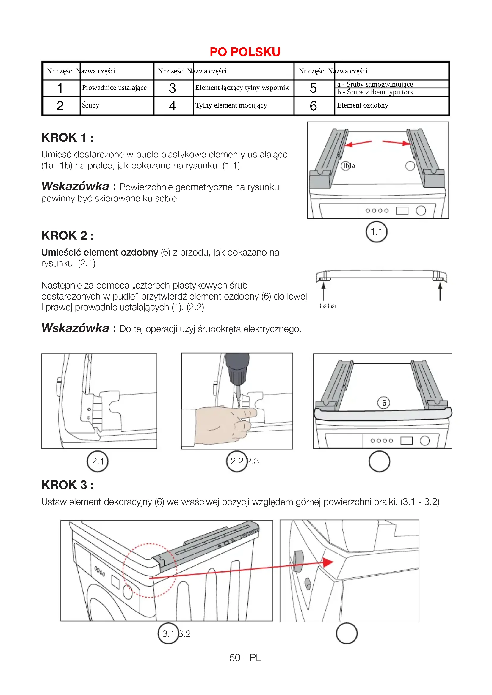 Utilizzare cacciaviti elettrici solo durante il collegamento delle viti. 4a50 - PL KROK 1 : Umieść dostarczone w pudle plastykowe elementy ustalające (1a -1b) na pralce, jak pokazano na rysunku. (1.1) Wskazówka : Powierzchnie geometryczne na rysunku powinny być skierowane ku sobie. KROK 2 : Umieścić element ozdobny (6) z przodu, jak pokazano na rysunku. (2.1) Następnie za pomocą „czterech plastykowych śrub dostarczonych w pudle” przytwierdź element ozdobny (6) do lewej i prawej prowadnic ustalających (1). (2.2) Wskazówka : Do tej operacji użyj śrubokręta elektrycznego. KROK 3 : Ustaw element dekoracyjny (6) we właściwej pozycji względem górnej powierzchni pralki. (3.1 - 3.2) Nr części Nazwa części Prowadnice ustalające ŚrubyNr części Nazwa części Element łączący tylny wspornik Tylny element mocującyNr części Nazwa części