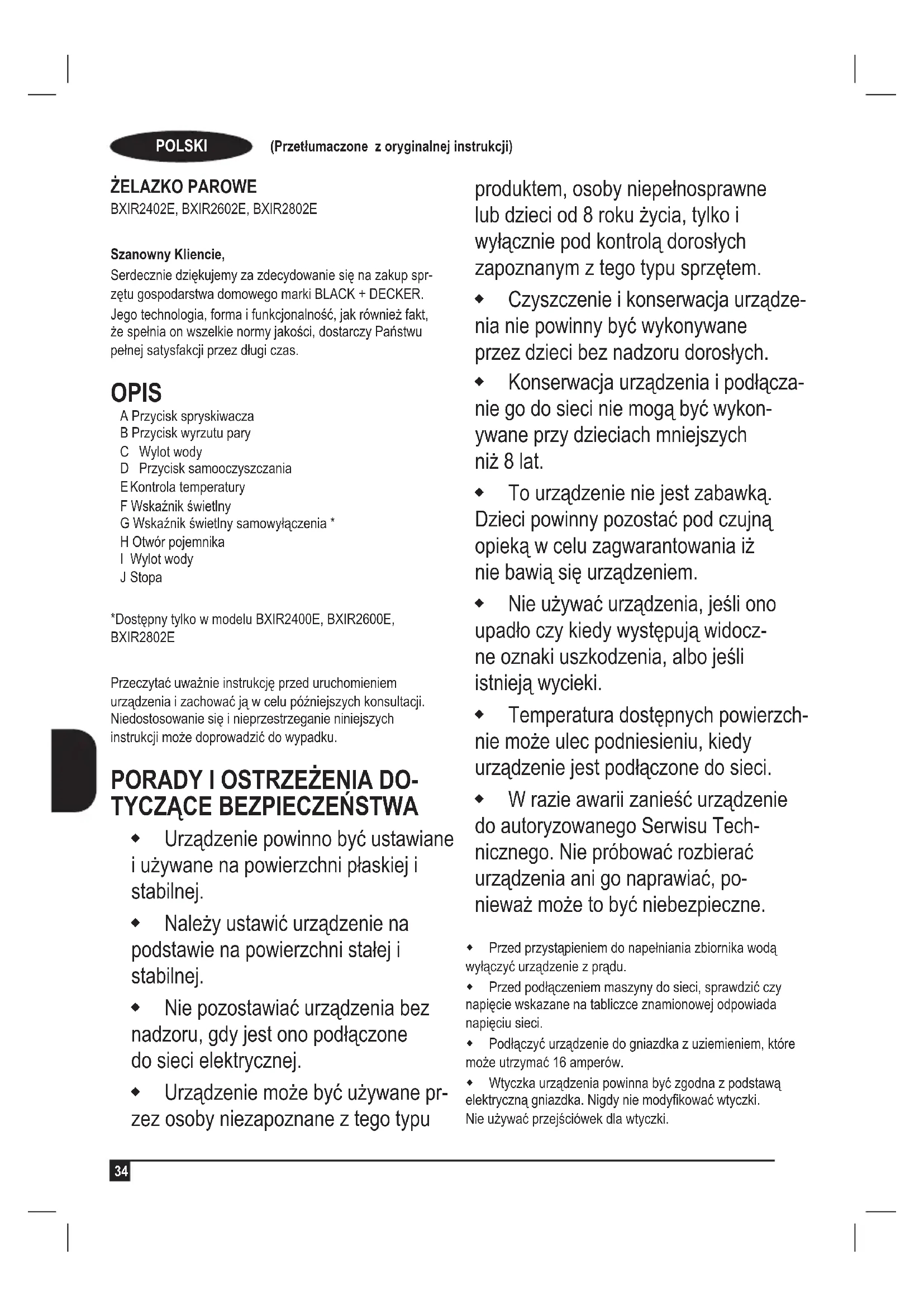 Szanowny Kliencie, Serdecznie dziękujemy za zdecydowanie się na zakup spr- zętu gospodarstwa domowego marki BLACK + DECKER. Jego technologia, forma i funkcjonalność, jak również fakt, że spełnia on wszelkie normy jakości, dostarczy Państwu pełnej satysfakcji przez długi czas. OPIS A Przycisk spryskiwacza B Przycisk wyrzutu pary C Wylot wody D Przycisk samooczyszczania E Kontrola temperatury F Wskaźnik świetlny G Wskaźnik świetlny samowyłączenia * H Otwór pojemnika I Wylot wody J Stopa *Dostępny tylko w modelu BXIR2400E, BXIR2600E, BXIR2802E Przeczytać uważnie instrukcję przed uruchomieniem urządzenia i zachować ją w celu późniejszych konsultacji. Niedostosowanie się i nieprzestrzeganie niniejszych instrukcji może doprowadzić do wypadku.
