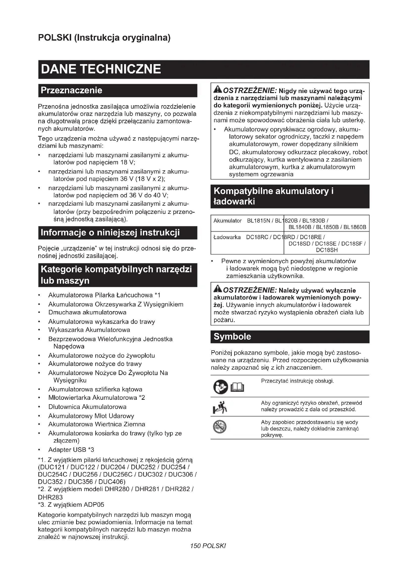 - 36V–40Vmaxadapter MÄRKUS:Mõnednimekirjasloetletudtarvikudvõi- vad kuuluda standardvarustusse ning need on lisatud tööriistapakendisse.Needvõivadriigitierineda. 149 EESTI150 POLSKI POLSKI (Instrukcja oryginalna) DANE TECHNICZNE Przeznaczenie Przenośnajednostkazasilającaumożliwiarozdzielenie akumulatoróworaznarzędzialubmaszyny,copozwala nadługotrwałąpracędziękiprzełączaniuzamontowa- nych akumulatorów. Tegourządzeniamożnaużywaćznastępującyminarzę- dziamilubmaszynami:
