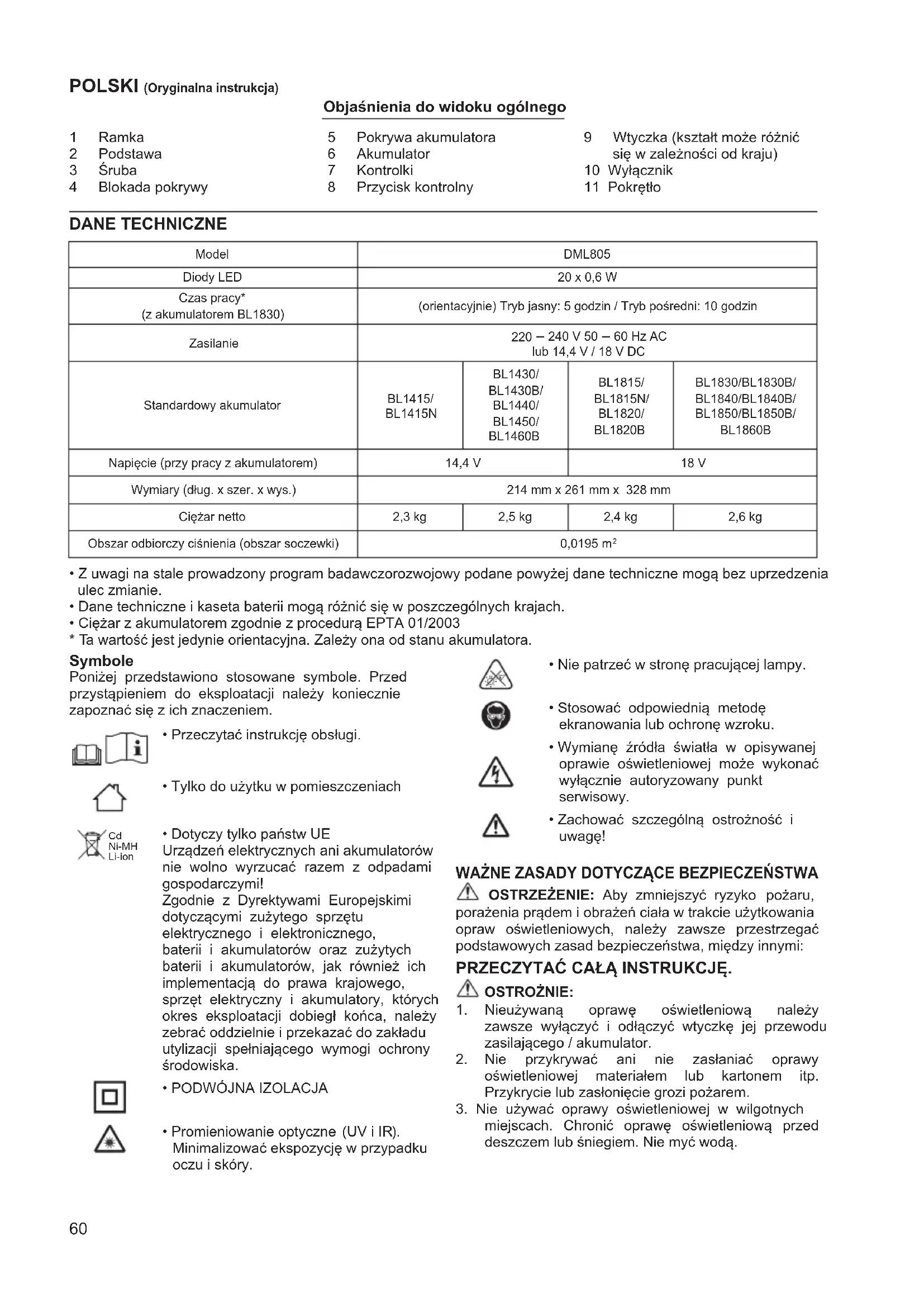 - Ta wartość jest jedynie orientacyjna. Zależy ona od stanu akumulatora. 1 Ramka 2 Podstawa 3 Śruba 4 Blokada pokrywy 5 Pokrywa akumulatora 6 Akumulator 7 Kontrolki 8 Przycisk kontrolny 9 Wtyczka (kształt może różnić się w zależności od kraju) 10 Wyłącznik 11 Pokrętło DANE TECHNICZNE61