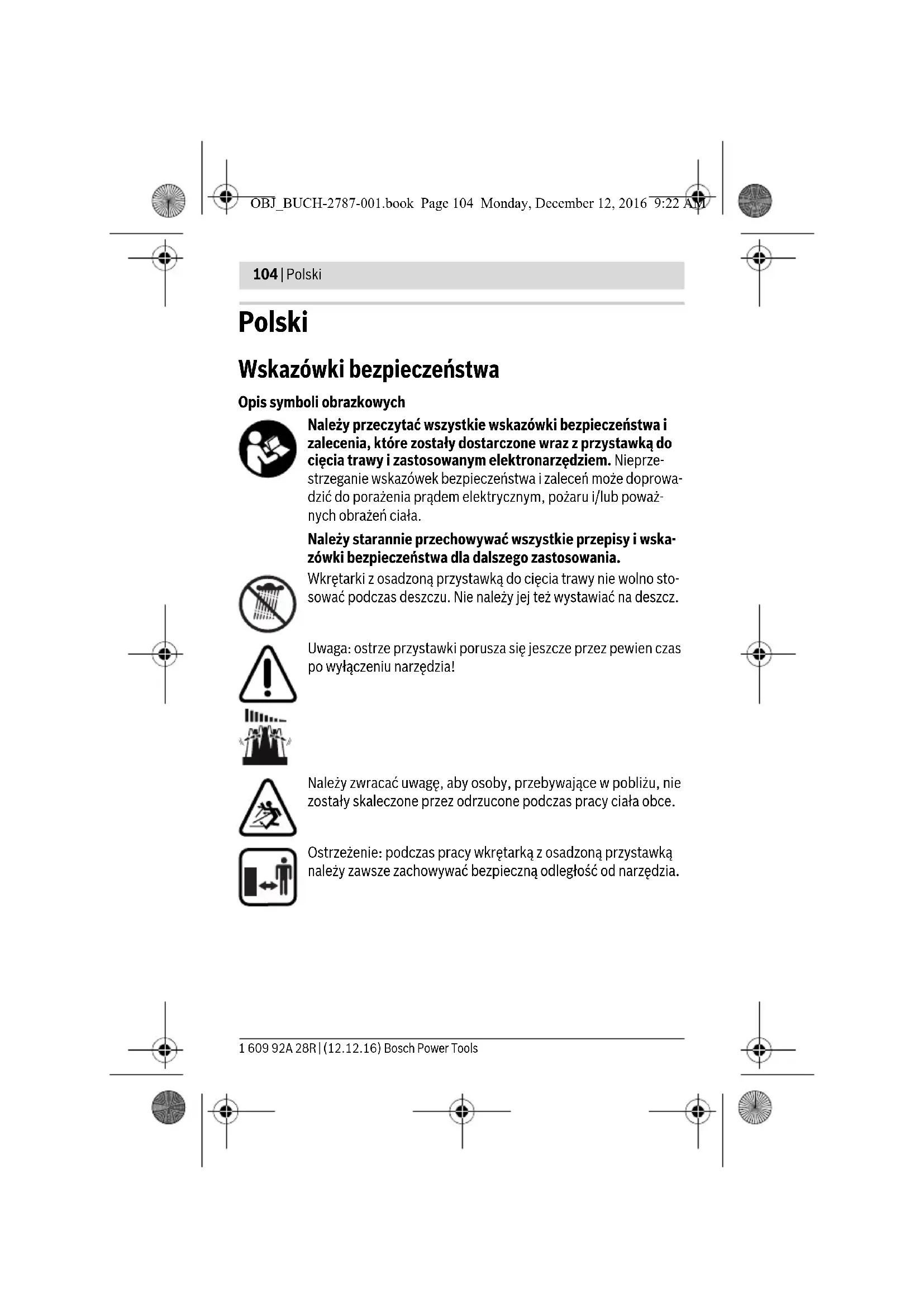 Denizli Tel.: 0258 2620666 Bulut Elektrik İstasyon Cad. No: 52/B Devlet Tiyatrosu Karşısı Elazığ Tel.: 0424 2183559 Körfez Elektrik Sanayi Çarşısı 770 Sok. No: 71 Erzincan Tel.: 0446 2230959 Ege Elektrik İnönü Bulvaro No: 135 Muğla Makasarası Fethiye Fethiye Tel.: 0252 6145701 Değer İş Bobinaj İsmetpaşa Mah. İlk Belediye Başkan Cad. 5/C Şahinbey Gaziantep Tel.: 0342 2316432 Çözüm Bobinaj İsmetpaşa Mah. Eski Şahinbey Belediyesi altı Cad. No: 3/C Gaziantep Tel.: 0342 2319500 OBJ_BUCH-2787-001.book Page 102 Monday, December 12, 2016 9:22 AMTürkçe | 103 Bosch Power Tools 1 609 92A 28R | (12.12.16) Onarım Bobinaj Raifpaşa Cad. No: 67 İskenderun Hatay Tel.: 0326 6137546 Günşah Otomotiv Beylikdüzü Sanayi Sit. No: 210 Beylikdüzü İstanbul Tel.: 0212 8720066 Aygem 10021 Sok. No: 11 AOSB Çiğli İzmir Tel.: 0232 3768074 Sezmen Bobinaj Ege İş Merkezi 1201/4 Sok. No: 4/B Yenişehir İzmir Tel.: 0232 4571465 Ankaralı Elektrik Eski Sanayi Bölgesi 3. Cad. No: 43 Kayseri Tel.: 0352 3364216 Asal Bobinaj Eski Sanayi Sitesi Barbaros Cad. No: 24 Samsun Tel.: 0362 2289090 Üstündağ Elektrikli Aletler Nusretiye Mah. Boyacılar Aralığı No: 9 Tekirdağ Tel.: 0282 6512884 Tasfiye Çim makası başlığı, aksesuar ve ambalaj malzemesi çevre dostu tasfiye ama- cıyla bir geri kazanım merkezine yollanmalıdır. Çim makası başlığını evsel çöplerin içine atmayın! Değişiklik haklarımız saklıdır. OBJ_BUCH-2787-001.book Page 103 Monday, December 12, 2016 9:22 AM1 609 92A 28R | (12.12.16) Bosch Power Tools 104 | Polski Polski Wskazówki bezpieczeństwa Opis symboli obrazkowych Należy przeczytać wszystkie wskazówki bezpieczeństwa i zalecenia, które zostały dostarczone wraz z przystawką do cięcia trawy i zastosowanym elektronarzędziem. Nieprze- strzeganie wskazówek bezpieczeństwa i zaleceń może doprowa- dzić do porażenia prądem elektrycznym, pożaru i/lub poważ- nych obrażeń ciała. Należy starannie przechowywać wszystkie przepisy i wska- zówki bezpieczeństwa dla dalszego zastosowania. Wkrętarki z osadzoną przystawką do cięcia trawy nie wolno sto- sować podczas deszczu. Nie należy jej też wystawiać na deszcz. Uwaga: ostrze przystawki porusza się jeszcze przez pewien czas po wyłączeniu narzędzia! Należy zwracać uwagę, aby osoby, przebywające w pobliżu, nie zostały skaleczone przez odrzucone podczas pracy ciała obce. Ostrzeżenie: podczas pracy wkrętarką z osadzoną przystawką należy zawsze zachowywać bezpieczną odległość od narzędzia. OBJ_BUCH-2787-001.book Page 104 Monday, December 12, 2016 9:22 AMPolski | 105 Bosch Power Tools 1 609 92A 28R | (12.12.16) Wskazówki dotyczące bezpiecznej obsługi wkrętarek wyposażonych w przystawkę do cięcia trawy Niniejsza wkrętarka z zamontowaną przy- stawką do cięcia trawy nie może być obsłu- giwana przez dzieci lub osoby ograniczone fizycznie, emocjonalnie, lub psychicznie, a także przez osoby z niewystarczającym do- świadczeniem i/lub niedostateczną wiedzą. Nie wolno używać przystawki do cięcia tra- wy ani wkrętarki z zamontowaną przystaw- kę do cięcia trawy, gdy w pobliżu znajdują się inne osoby lub zwierzęta domowe. Należy pilnować, aby dzieci nie bawiły się przystawką do cięcia trawy ani wkrętarką z zamontowaną przystawką do cięcia trawy. Nieużywaną w danym momencie przystawkę należy zdejmować z wkrętarki. Należy zwrócić uwagę, aby nieużywane w danym momencie ostrze zabezpieczyć osłoną. Należy kontrolować, czy osłona wchodząca w skład przystawki do cięcia trawy znajduje się w nienagannym stanie. Osłona ma za zadanie ochronę operatora przed przypadkowym kontaktem z ostrzem. Należy stale dbać o ostrość i czystość ostrza. O wiele rzadziej dochodzi do zakleszczenia się ostrza, jeżeli jest ono starannie utrzymane. Zadbane narzędzia łatwiej się też prowadzi. Narzędzia nie należy używać do cięcia drewna, kamienia, betonu, ani przewodów. Spowoduje to stępienie ostrza i może prowadzić do jego za- blokowania się w materiale. OBJ_BUCH-2787-001.book Page 105 Monday, December 12, 2016 9:22 AM1 609 92A 28R | (12.12.16) Bosch Power Tools 106 | Polski Podczas pracy przy użyciu wkrętarki z osadzoną przystawką należy zawsze stosować okulary ochronne, nosić stabilne obuwie i długie spodnie. Unikać nienaturalnych pozycji ciała i zachować stabilność podczas pracy. W każdej chwili należy utrzymywać równowagę, przede wszystkim podczas pracy na wzniesieniach lub nasypach. Bezpieczna postawa i odpowiednia pozycja ciała zapewniają lepszą kontrolę nad wkrętarką z zamontowaną przystawką do cięcia trawy w sytuacjach nie- przewidzianych. Podczas stosowania lub przenoszenia przystawki do cięcia trawy nie wolno biec. W przypadku poślizgnięcia lub upadku istnieje ryzyko dozna- nia obrażeń ciała. Wyłączyć włącznik/wyłącznik, ustawić przełącznik kierunku obro- tów w pozycji środkowej i przesunąć przełącznik blokady w dół: – przed przystąpieniem do jakichkolwiek prac przy wkrętarce (takich jak np. wymiana przystawki itp.), a także podczas jej przenoszenia, trans- portu i przechowywania, – podczas demontażu przystawki, – przed przystąpieniem do usuwania zablokowanego materiału, – przed przystąpieniem do kontroli, czyszczenia lub innych prac przy wkrętarce z osadzoną przystawką, – po kolizji z innym elementem. Wkrętarkę oraz przystawkę należy skon- trolować pod kątem uszkodzeń i ewentualnie oddać do naprawy, – gdy narzędzie zachowuje się w nietypowy sposób, np. zaczyna wibro- wać. Wkrętarkę i przystawkę należy natychmiast dokładnie skontrolo- wać. Wkrętarkę z osadzoną przystawką można włączać dopiero po upew- nieniu się, że ostrze znajduje się w bezpiecznej odległości od rąk i nóg. Konieczna jest należyta konserwacja elektronarzędzia oraz przy- stawki. Należy kontrolować, czy ruchome części urządzenia dzi
