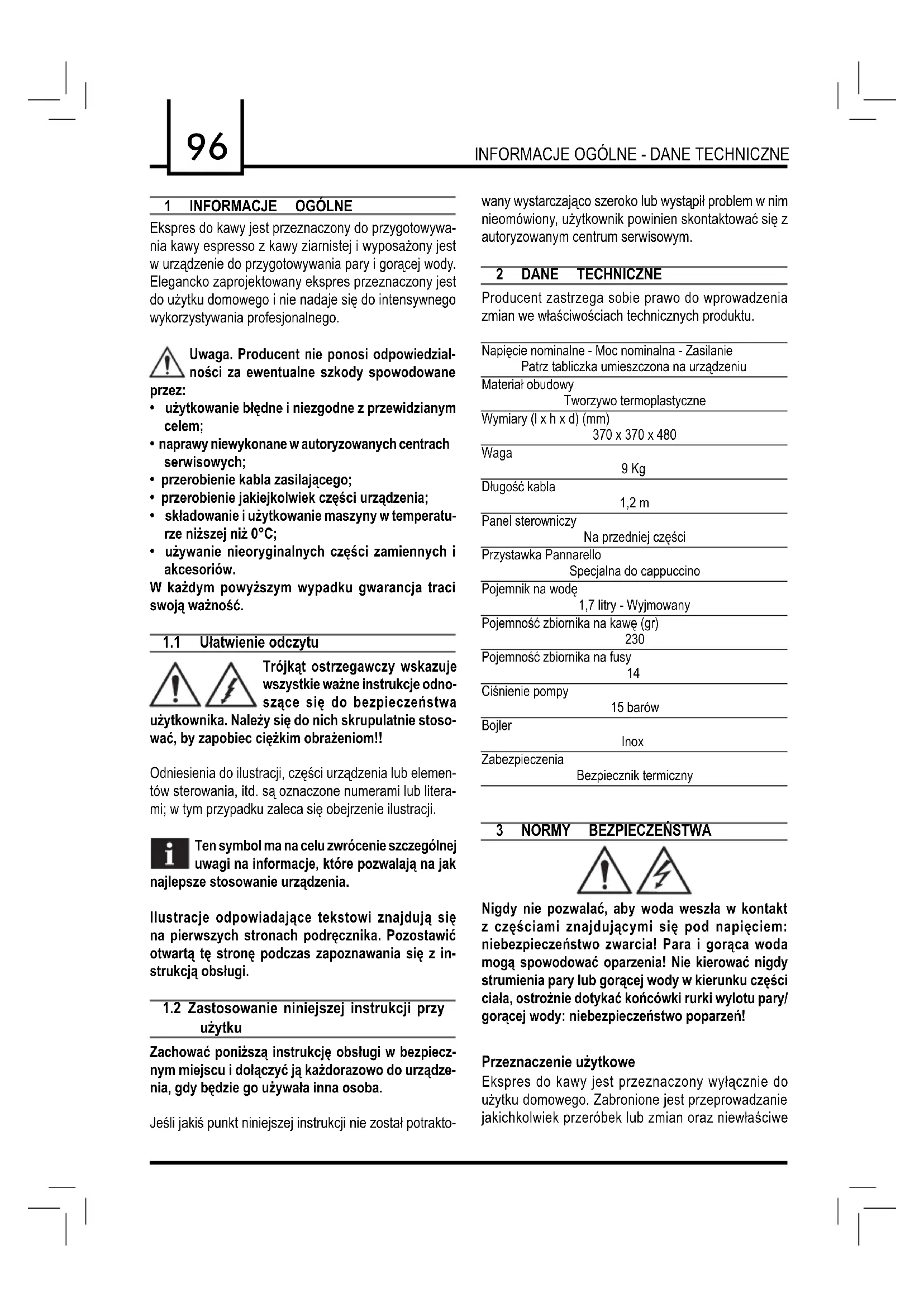 użytku Zachować poniższą instrukcję obsługi w bezpiecz- nym miejscu i dołączyć ją każdorazowo do urządze- nia, gdy będzie go używała inna osoba. Jeśli jakiś punkt niniejszej instrukcji nie został potrakto- wany wystarczająco szeroko lub wystąpił problem w nim nieomówiony, użytkownik powinien skontaktować się z autoryzowanym centrum serwisowym. 2 DANE TECHNICZNE Producent zastrzega sobie prawo do wprowadzenia zmian we właściwościach technicznych produktu. Napięcie nominalne - Moc nominalna - Zasilanie Patrz tabliczka umieszczona na urządzeniu Materiał obudowy Tworzywo termoplastyczne Wymiary (l x h x d) (mm) 370 x 370 x 480 Waga 9 Kg Długość kabla 1,2 m Panel sterowniczy Na przedniej części Przystawka Pannarello Specjalna do cappuccino Pojemnik na wodę 1,7 litry - Wyjmowany Pojemność zbiornika na kawę (gr)