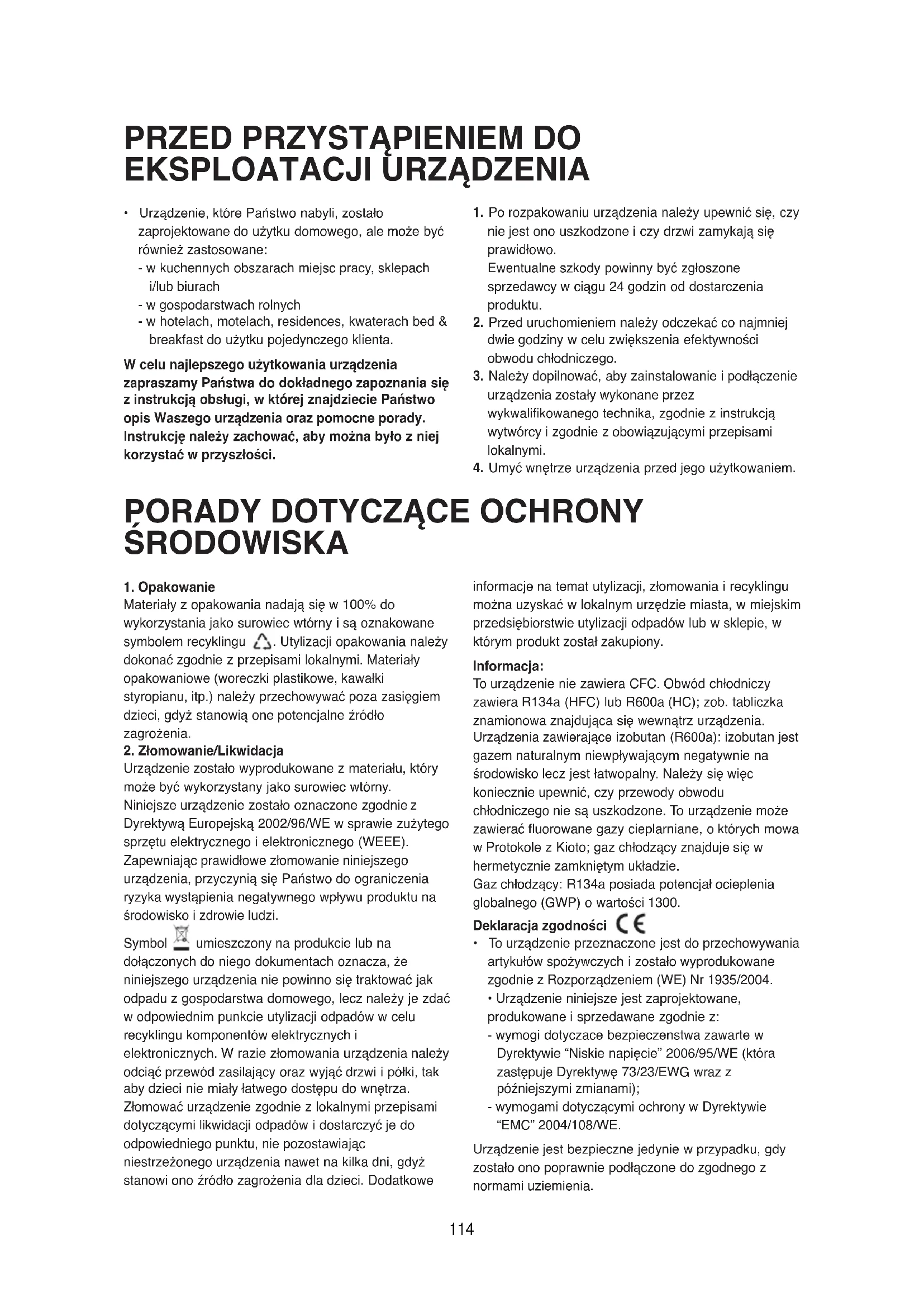 Dyrektywą Europejską 2002/96/WE w sprawie zużytego sprzętu elektrycznego i elektronicznego (WEEE). Zapewniając prawidłowe złomowanie niniejszego urządzenia, przyczynią się Państwo do ograniczenia ryzyka wystąpienia negatywnego wpływu produktu na środowisko i zdrowie ludzi. Symbol umieszczony na produkcie lub na dołączonych do niego dokumentach oznacza, że niniejszego urządzenia nie powinno się traktować jak odpadu z gospodarstwa domowego, lecz należy je zdać w odpowiednim punkcie utylizacji odpadów w celu recyklingu komponentów elektrycznych i elektronicznych. W razie złomowania urządzenia należy odciąć przewód zasilający oraz wyjąć drzwi i półki, tak aby dzieci nie miały łatwego dostępu do wnętrza. Złomować urządzenie zgodnie z lokalnymi przepisami dotyczącymi likwidacji odpadów i dostarczyć je do odpowiedniego punktu, nie pozostawiając niestrzeżonego urządzenia nawet na kilka dni, gdyż stanowi ono źródło zagrożenia dla dzieci. Dodatkowe informacje na temat utylizacji, złomowania i recyklingu można uzyskać w lokalnym urzędzie miasta, w miejskim przedsiębiorstwie utylizacji odpadów lub w sklepie, w którym produkt został zakupiony. Informacja: To urządzenie nie zawiera CFC. Obwód chłodniczy zawiera R134a (HFC) lub R600a (HC); zob. tabliczka znamionowa znajdująca się wewnątrz urządzenia. Urządzenia zawierające izobutan (R600a): izobutan jest gazem naturalnym niewpływającym negatywnie na środowisko lecz jest łatwopalny. Należy się więc koniecznie upewnić, czy przewody obwodu chłodniczego nie są uszkodzone. To urządzenie może zawierać fluorowane gazy cieplarniane, o których mowa w Protokole z Kioto; gaz chłodzący znajduje się w hermetycznie zamkniętym układzie. Gaz chłodzący: R134a posiada potencjał ocieplenia globalnego (GWP) o wartości 1300. Deklaracja zgodności