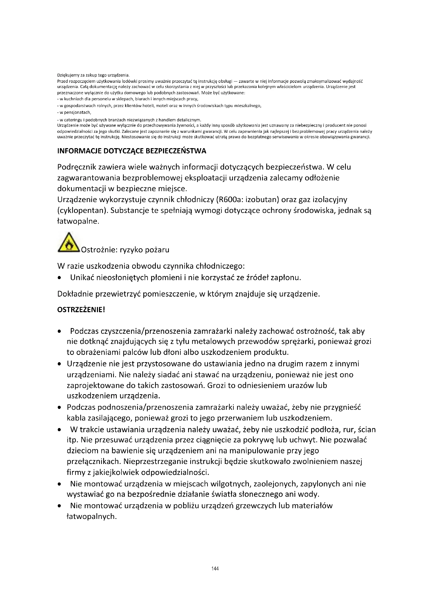 - Nie należy utylizować urządzenia przez spalenie. Należy uważać, żeby nie uszkodzić obwodu chłodniczego/rur urządzenia podczas transportu i użytkowania. W przypadku stwierdzenia uszkodzeń nie narażać urządzenia na kontakt z ogniem lub 145potencjalnymi źródłami zapłonu. Przewietrzyć pomieszczenie, w którym znajduje się urządzenie.