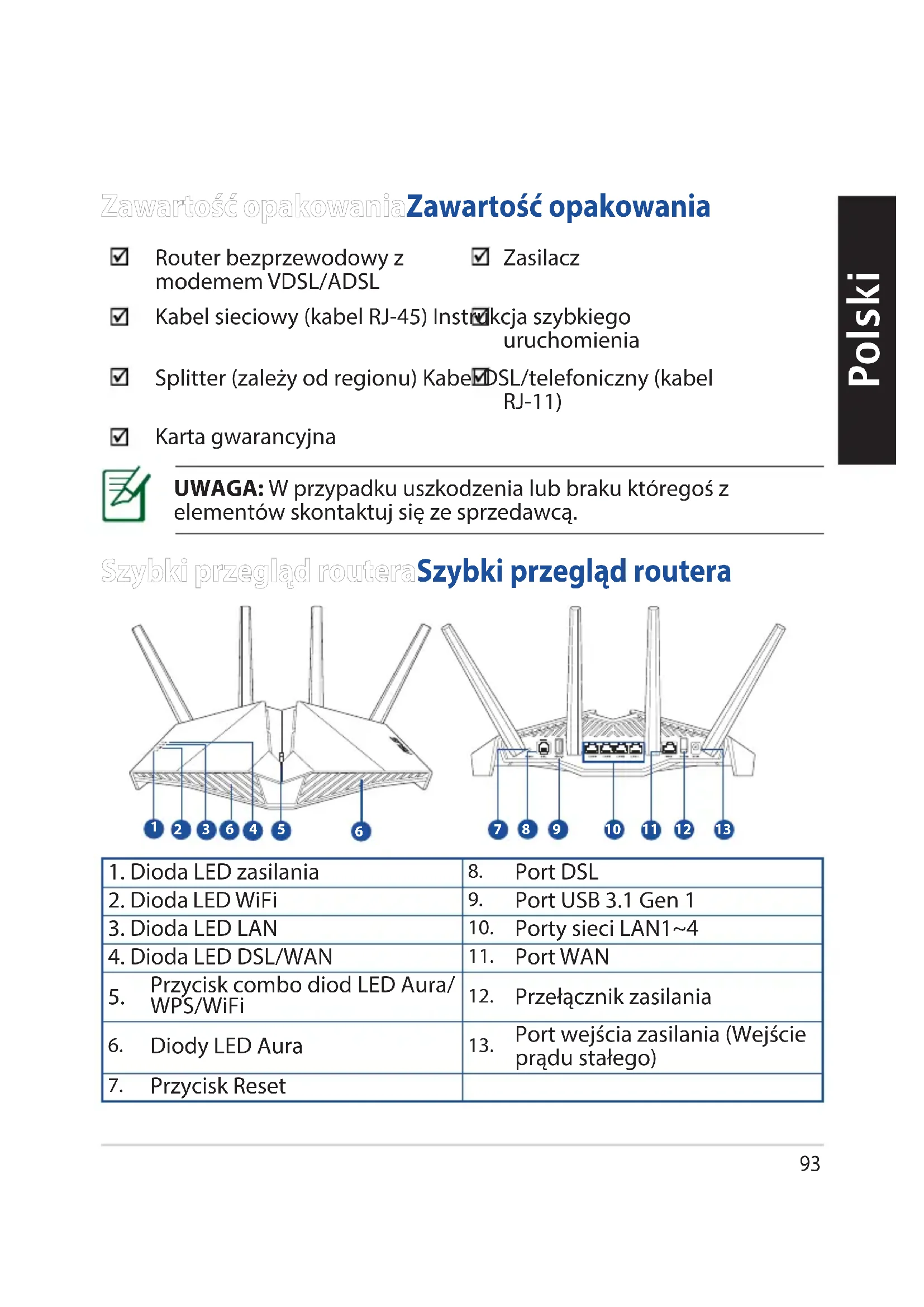 - Pode obter o manual online em https://www.asus.com/support93 Polski Szybki przegląd routeraSzybki przegląd routera UWAGA: W przypadku uszkodzenia lub braku któregoś z elementów skontaktuj się ze sprzedawcą. Zawartość opakowaniaZawartość opakowania Router bezprzewodowy z modemem VDSL/ADSL Zasilacz Kabel sieciowy (kabel RJ-45) Instrukcja szybkiego uruchomienia Splitter (zależy od regionu) Kabel DSL/telefoniczny (kabel RJ-11) Karta gwarancyjna