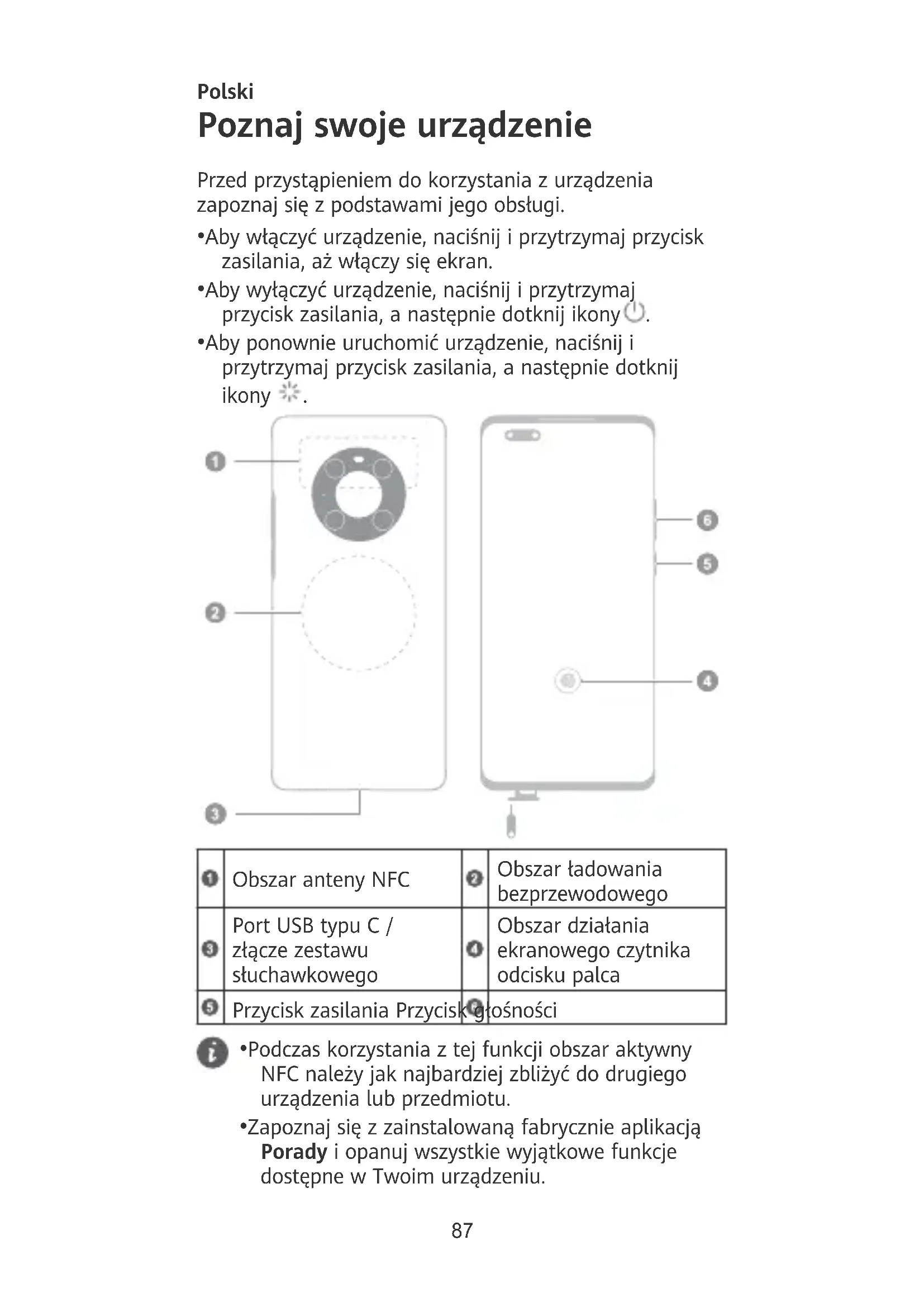 - Zapoznaj się z zainstalowaną fabrycznie aplikacją Porady i opanuj wszystkie wyjątkowe funkcje dostępne w Twoim urządzeniu. 87Wprowadzenie