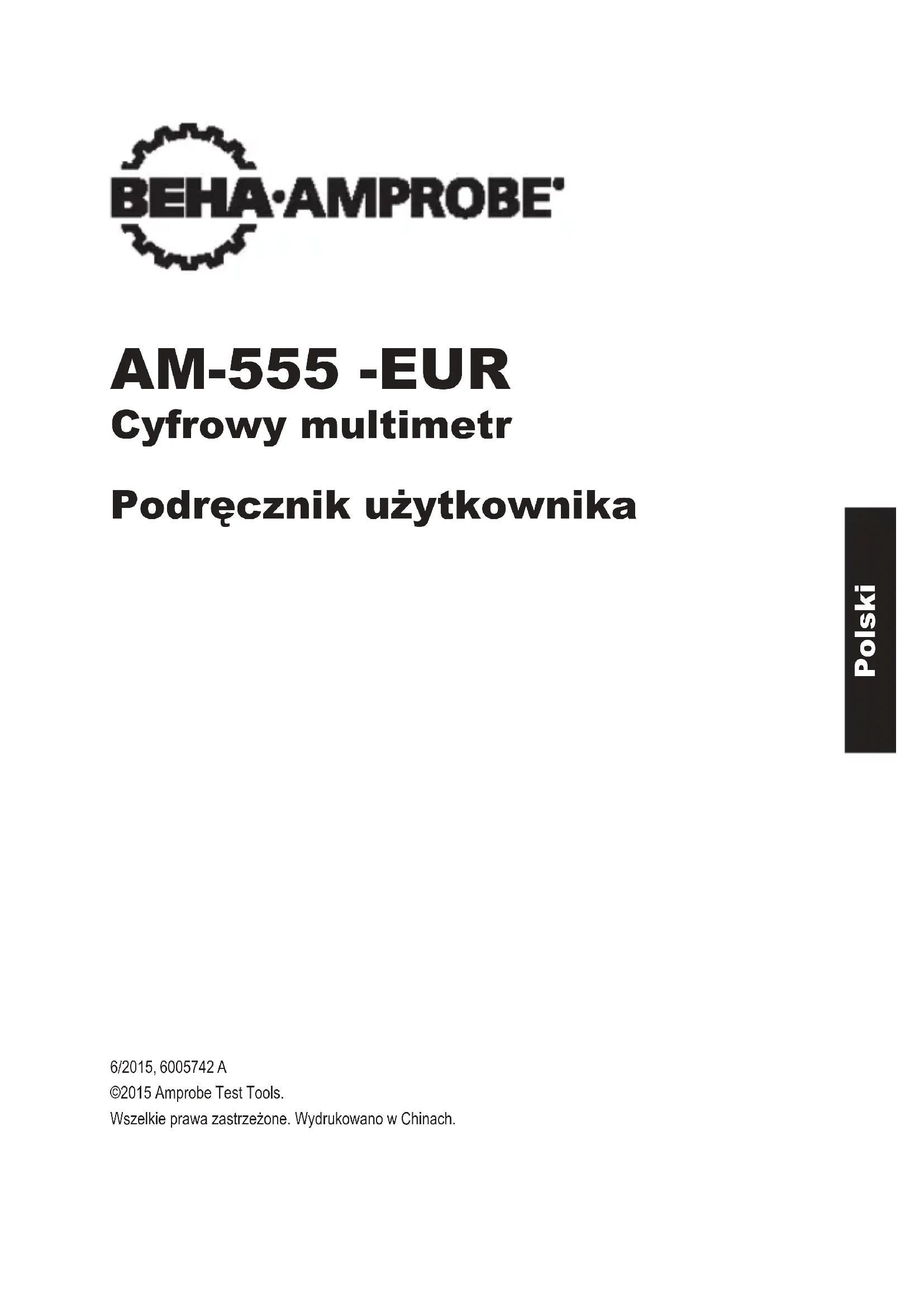 Cyfrowy multimetr Podręcznik użytkownika 6/2015, 6005742 A ©2015 Amprobe Test Tools. Wszelkie prawa zastrzeżone. Wydrukowano w Chinach. PolskiOgraniczona gwarancja i ograniczenie odpowiedzialności Posiadany produkt Amprobe będzie wolny od wad materiałowych i defektów wytwarzania w ciągu jednego roku od daty zakupienia, chyba że, okres ten zostanie zmieniony przez lokalne prawo. Ta gwarancja nie obejmuje bezpieczników, usuwalnych baterii lub uszkodzeń spowodowanych wypadkiem, zaniedbaniem, nieprawidłowym używaniem, zmianami, zanieczyszczeniem lub nienormalnymi warunkami działania albo obsługi. Sprzedawcy nie są upoważnieni do przedłużania wszelkich innych gwarancji w imieniu Amprobe. Aby uzyskać usługę w okresie gwarancji należy zwrócić produkt z dowodem zakupienia do autoryzowanego punktu serwisowego Amprobe lub do dostawcy albo dystrybutora Amprobe. Szczegółowe informacje znajdują się w części Naprawa. TA GWARANCJA TO JEDYNE ZADOŚĆUCZYNIENIE UŻYTKOWNIKA. WSZELKIE INNE GWARANCJE - WYRAŻONE, DOROZUMIANE ALBO USTAWOWE - WŁĄCZNIE Z DOROZUMIANYMI GWARANCJAMI DOPASOWANIA DO OKREŚLONEGO CELU ALBU PRZYDATNOŚCI HANDLOWEJ, SĄ NINIEJSZYM ODRZUCANE. PRODUCENT NIE ODPOWIADA ZA WSZELKIE SPECJALNE, NIEBEZPOŚREDNIE, PRZYPADKOWE ALBO WYNIKOWE SZKODY LUB STRATY, POWSTAŁE Z JAKIEJKOLWIEK PRZYCZYNY LUB LUB ZASTOSOWANYCH TEORII. Ponieważ w niektórych stanach lub krajach nie zezwala się na wyłączenia albo ograniczenia dorozumianej gwarancji albo przypadkowych lub wynikowych szkód, to ograniczenie odpowiedzialności może nie dotyczyć użytkownika. Naprawa Wszelkie narzędzia testowe zwrócone do naprawy gwarancyjnej lub naprawy niegwarancyjnej albo do kalibracji, powinny być zaopatrzone w:nazwę użytkownika, nazwę rmy, adres, numer telefoniczny i dowód zakupienia. Dodatkowo należy dołączyć krótki opis problemu lub wymaganej naprawy i testy wykonane miernikiem. Opłaty za naprawy niegwarancyjne lub wymiany powinny być wykonywane czekiem, przekazem pieniężnym, kartą kredytową z datą ważności lub zleceniem wykonania płatnym dla Amprobe. Naprawy i wymiany gwarancyjne - Wszystkie kraje Przed zażądaniem naprawy należy przeczytać oświadczenie dotyczące gwarancji i sprawdzić baterię. W okresie obowiązywania gwarancji, wszelkie uszkodzone narzędzia testowe można zwracać do dystrybutora Amprobe w celu ich wymiany na taki sam lub podobny produkt. Listę najbliższych dystrybutorów można sprawdzić w części “Where to Buy (Gdzie kupić)”, pod adresem www.Amprobe.com. Dodatkowo, w Stanach Zjednoczonych i w Kanadzie, urządzenia do naprawy i wymiany gwarancyjnej, można także wysyłać do Centrum serwisowego Amprobe (sprawdź adres poniżej). Naprawa i wymiana niegwarancyjna - Stanych Zjednoczone i Kanada Urządzenia do naprawy i wymiany niegwarancyjnej w Stanach Zjednoczonych i Kanadzie, powinny być wysyłane do Centrum serwisowego Amprobe. Informacje o cenach bieżących napraw i wymian można uzyskać telefonicznie w Amprobe lub w punkcie zakupu. USA: Kanadzie: Amprobe Amprobe Everett, WA 98203 Mississauga, ON L4Z 1X9 Tel.: 877-AMPROBE (267-7623) Tel.: 905-890-7600 Naprawy i wymiany niegwarancyjne - Europa Urządzenia nie objęte gwarancją w krajach europejskich, można wymienić u dystrybutora Amprobe za nominalną opłatą. Listę najbliższych dystrybutorów można sprawdzić w części “Where to Buy (Gdzie kupić)”, pod adresem www.Beha-Amprobe.com. Amprobe Europe* Beha-Amprobe In den Engematten 14 79286 Glottertal, Niemcy Tel.: +49 (0) 7684 8009 - 0 www.Beha-Amprobe.com *(Tylko korespondencja - pod tym adresem nie są wykonywane żadne naprawy lub wymiany. Klienci z krajów europejskich powinni się kontaktować ze swoim dystrybutorem)Cyfrowy multimetr AM-555-EUR
