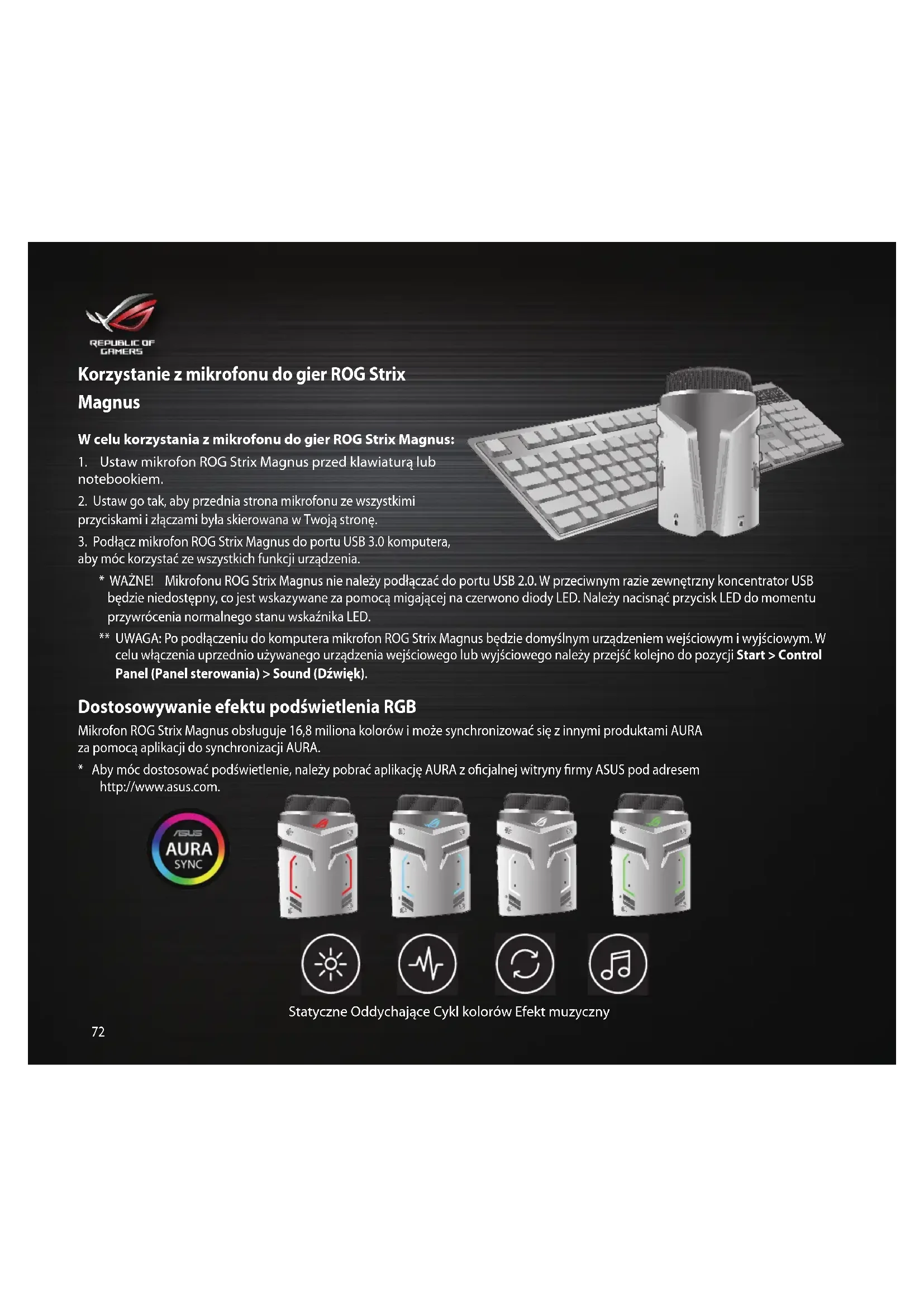 - WAŻNE! Mikrofonu ROG Strix Magnus nie należy podłączać do portu USB 2.0. W przeciwnym razie zewnętrzny koncentrator USB będzie niedostępny, co jest wskazywane za pomocą migającej na czerwono diody LED. Należy nacisnąć przycisk LED do momentu przywrócenia normalnego stanu wskaźnika LED. ** UWAGA: Po podłączeniu do komputera mikrofon ROG Strix Magnus będzie domyślnym urządzeniem wejściowym i wyjściowym. W celu włączenia uprzednio używanego urządzenia wejściowego lub wyjściowego należy przejść kolejno do pozycji Start > Control Panel (Panel sterowania) > Sound (Dźwięk). Dostosowywanie efektu podświetlenia RGB Mikrofon ROG Strix Magnus obsługuje 16,8 miliona kolorów i może synchronizować się z innymi produktami AURA za pomocą aplikacji do synchronizacji AURA.