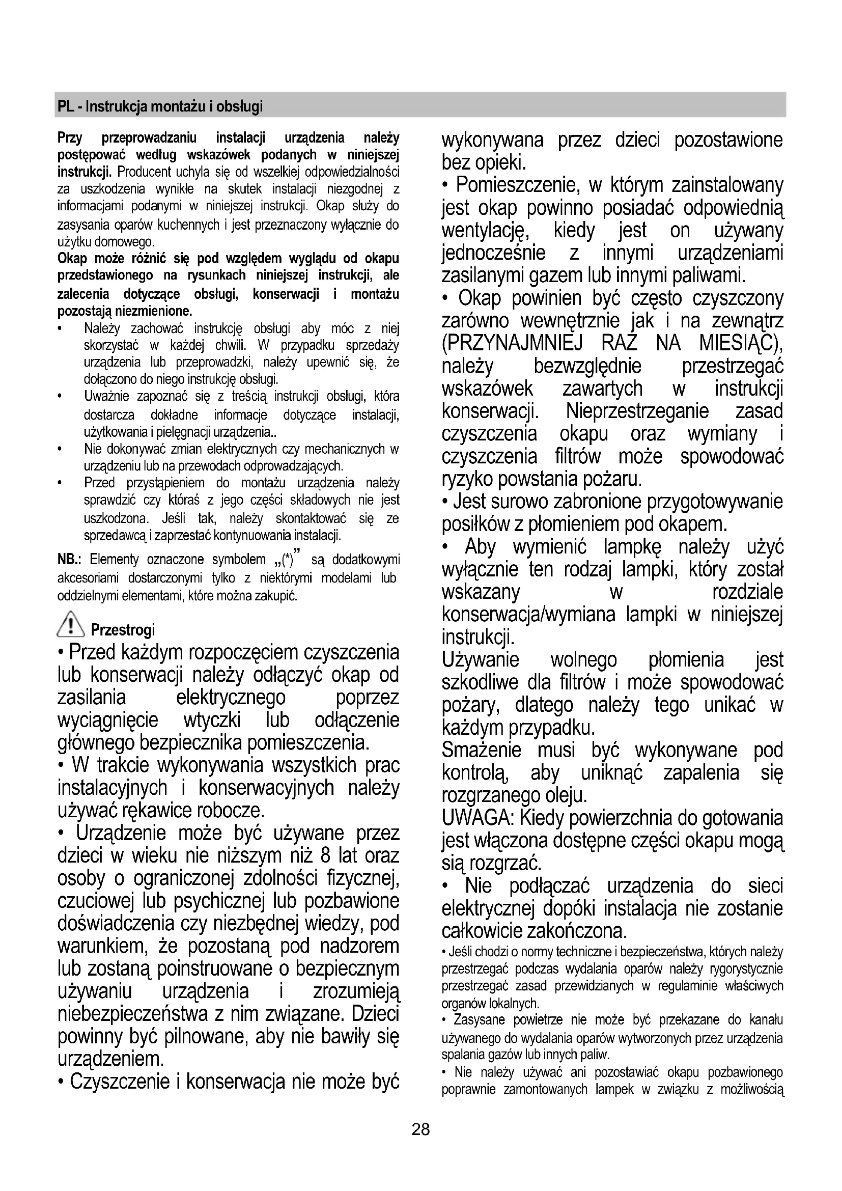 - Okap powinien być często czyszczony zarówno wewnętrznie jak i na zewnątrz (PRZYNAJMNIEJ RAZ NA MIESIĄC), należy bezwzględnie przestrzegać wskazówek zawartych w instrukcji konserwacji. Nieprzestrzeganie zasad czyszczenia okapu oraz wymiany i czyszczenia filtrów może spowodować ryzyko powstania pożaru.