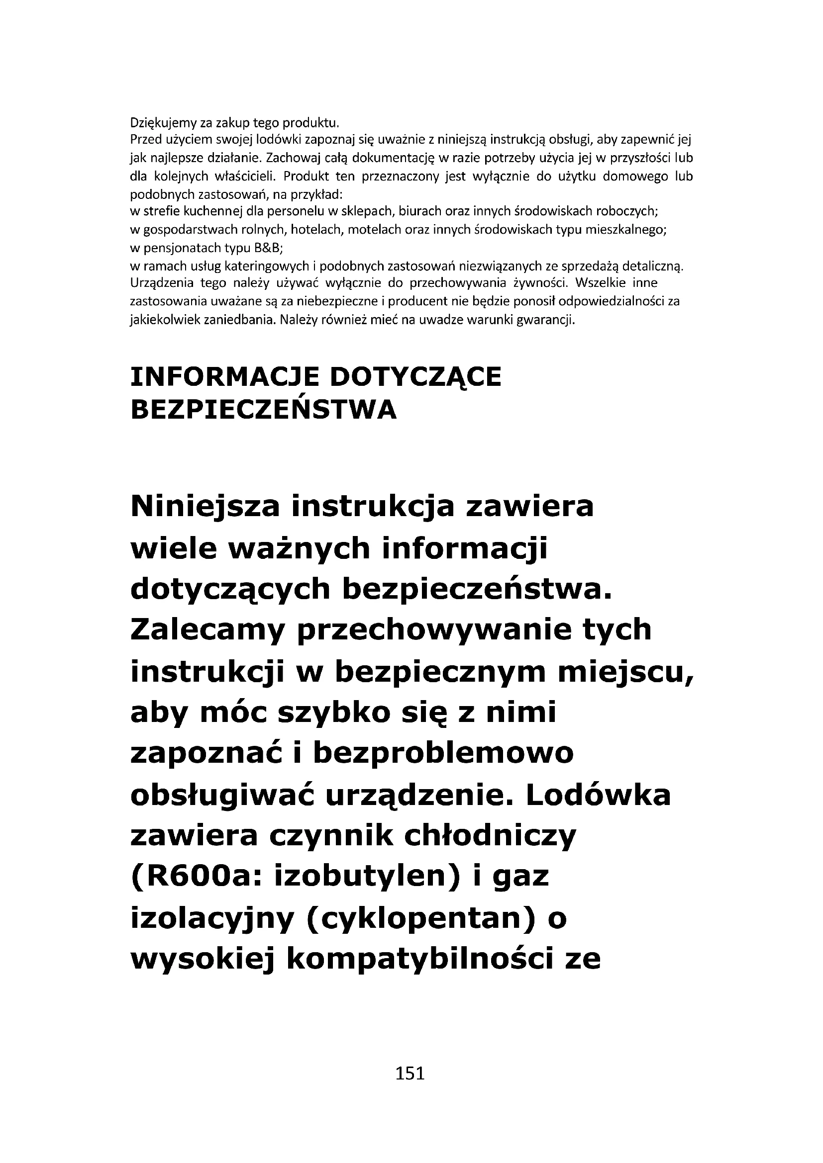 BEZPIECZEŃSTWA Niniejsza instrukcja zawiera wiele ważnych informacji dotyczących bezpieczeństwa. Zalecamy przechowywanie tych instrukcji w bezpiecznym miejscu, aby móc szybko się z nimi zapoznać i bezproblemowo obsługiwać urządzenie. Lodówka zawiera czynnik chłodniczy (R600a: izobutylen) i gaz izolacyjny (cyklopentan) o wysokiej kompatybilności ze152 środowiskiem, które jednak są łatwopalne.
