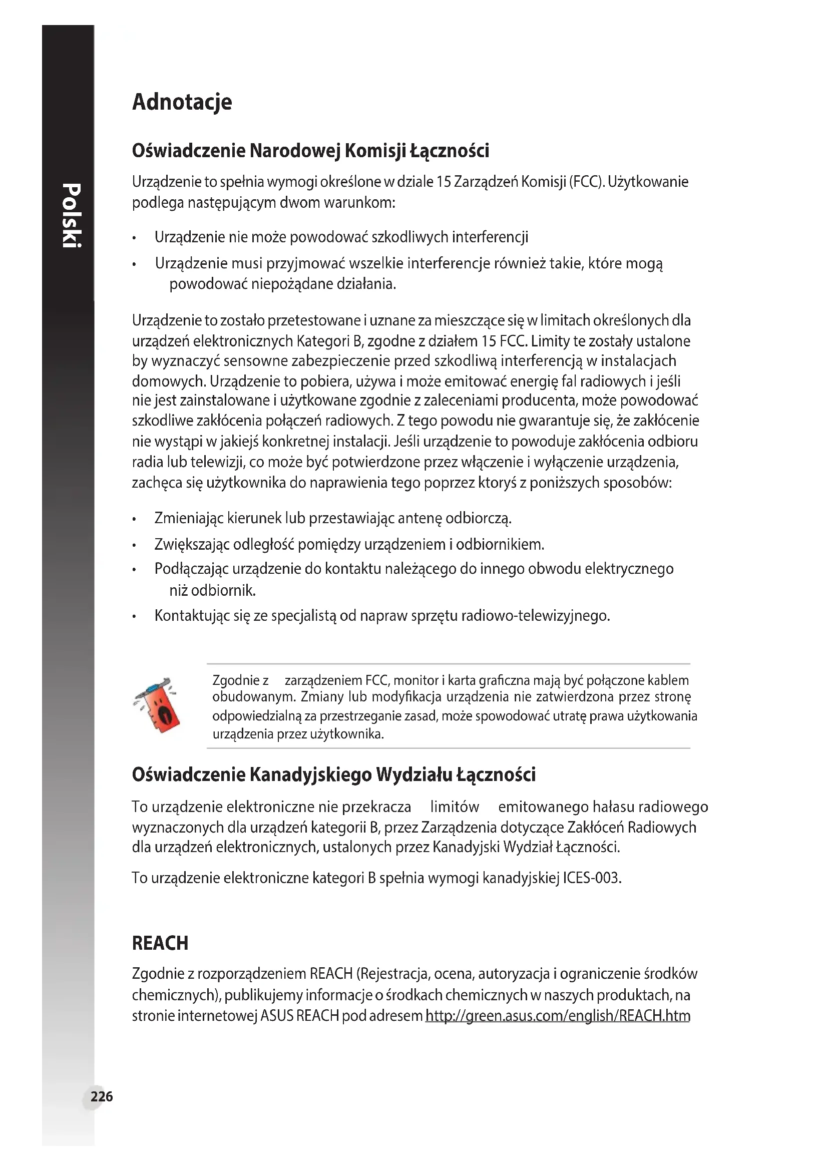 - Kontaktującsięzespecjalistąodnaprawsprzęturadiowo-telewizyjnego. Oświadczenie Kanadyjskiego Wydziału Łączności Tourządzenieelektronicznenieprzekracza limitów emitowanegohałasuradiowego wyznaczonychdlaurządzeńkategoriiB,przezZarządzeniadotycząceZakłóceńRadiowych dla urządzeń elektronicznych, ustalonych przez Kanadyjski Wydział Łączności. TourządzenieelektronicznekategoriBspełniawymogikanadyjskiejICES-003. Zgodniez zarządzeniemFCC,monitorikartagracznamająbyćpołączonekablem obudowanym. Zmiany lub modykacja urządzenia nie zatwierdzona przez stronę odpowiedzialnązaprzestrzeganiezasad,możespowodowaćutratęprawaużytkowania urządzenia przez użytkownika. REACH ZgodniezrozporządzeniemREACH(Rejestracja,ocena,autoryzacjaiograniczenieśrodków chemicznych), publikujemy informacje o środkach chemicznych w naszych produktach, na stronie internetowej ASUS REACH pod adresem http://green.asus.com/english/REACH.htm227 Polski Bezpieczeństwo Bezpieczna elektryka