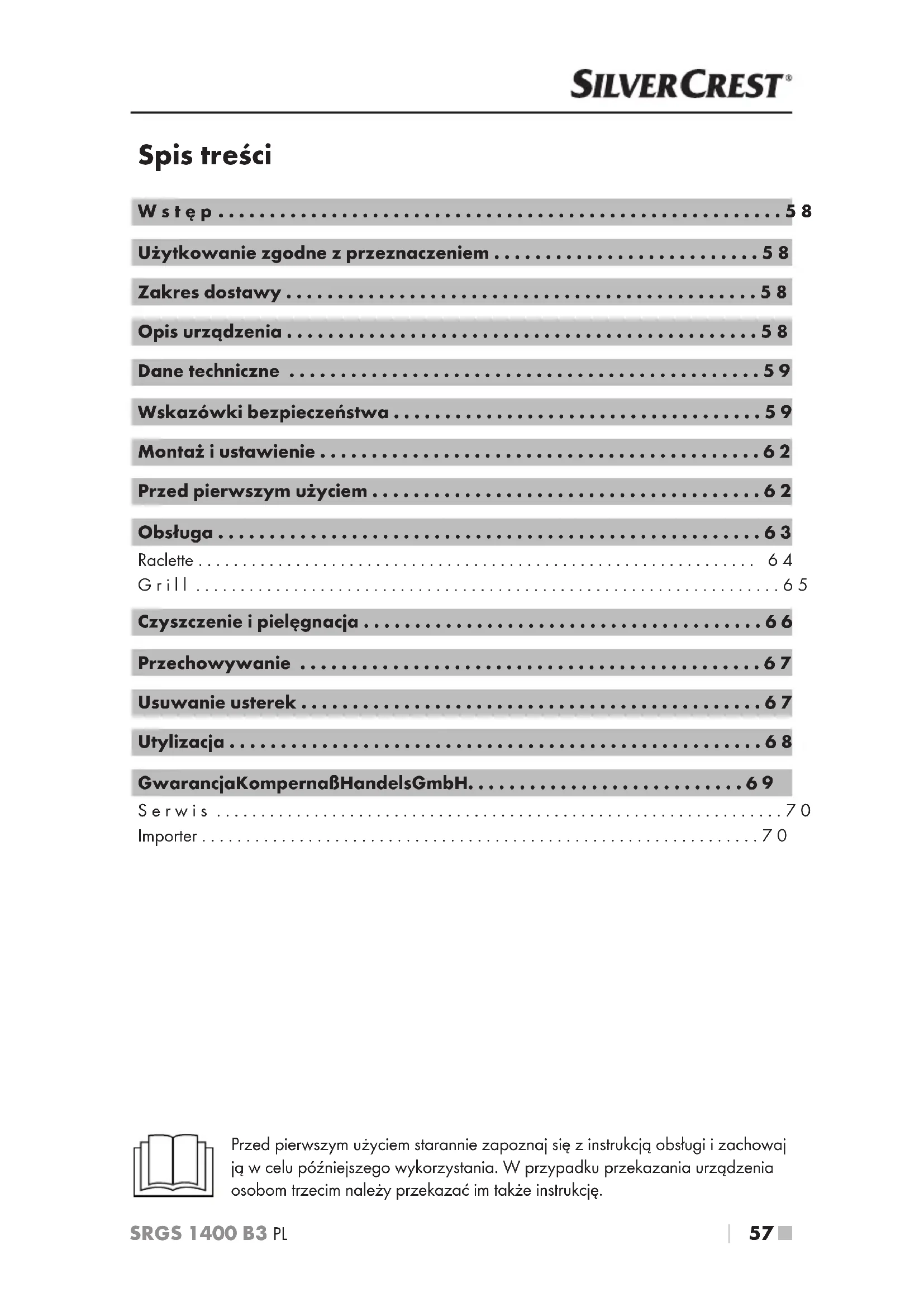 - Importer Przed pierwszym użyciem starannie zapoznaj się z instrukcją obsługi i zachowaj ją w celu późniejszego wykorzystania. Wprzypadku przekazania urządzenia osobom trzecim należy przekazać im także instrukcję.SRGS 1400 B3■ 58 p. 70