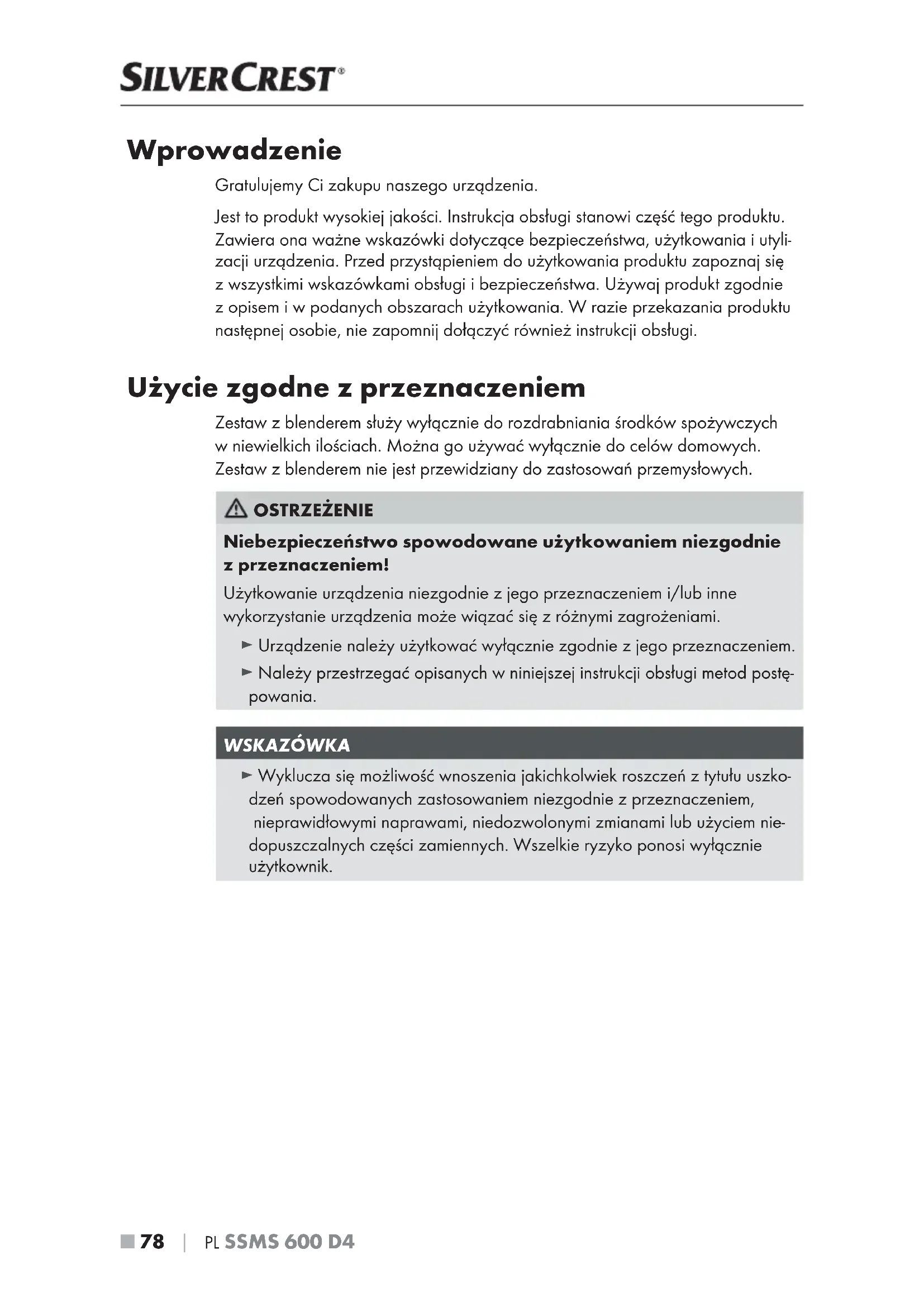 Wprowadzenie Gratulujemy Ci zakupu naszego urządzenia. Jest to produkt wysokiej jakości. Instrukcja obsługi stanowi część tego produktu. Zawiera ona ważne wskazówki dotyczące bezpieczeństwa, użytkowania i utyli- zacji urządzenia. Przed przystąpieniem do użytkowania produktu zapoznaj się zwszystkimi wskazówkami obsługi i bezpieczeństwa. Używaj produkt zgodnie zopisem i w podanych obszarach użytkowania. W razie przekazania produktu następnej osobie, nie zapomnij dołączyć również instrukcji obsługi. Użycie zgodne z przeznaczeniem Zestaw z blenderem służy wyłącznie do rozdrabniania środków spożywczych w niewielkich ilościach. Można go używać wyłącznie do celów domowych. Zestaw z blenderem nie jest przewidziany do zastosowań przemysłowych. OSTRZEŻENIE Niebezpieczeństwo spowodowane użytkowaniem niezgodnie zprzeznaczeniem! Użytkowanie urządzenia niezgodnie z jego przeznaczeniem i/lub inne wykorzystanie urządzenia może wiązać się z różnymi zagrożeniami. ► Urządzenie należy użytkować wyłącznie zgodnie z jego przeznaczeniem. ► Należy przestrzegać opisanych w niniejszej instrukcji obsługi metod postę- powania. WSKAZÓWKA ► Wyklucza się możliwość wnoszenia jakichkolwiek roszczeń ztytułu uszko- dzeń spowodowanych zastosowaniem niezgodnie zprzeznaczeniem, nieprawidłowymi naprawami, niedozwolonymi zmianami lub użyciem nie- dopuszczalnych części zamiennych. Wszelkie ryzyko ponosi wyłącznie użytkownik.PL
