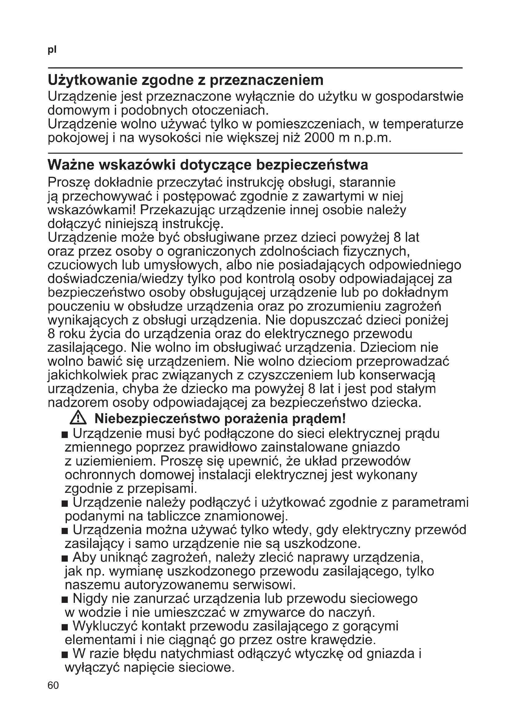 Użytkowanie zgodne z przeznaczeniem Urządzenie jest przeznaczone wyłącznie do użytku w gospodarstwie domowym i podobnych otoczeniach. Urządzenie wolno używać tylko w pomieszczeniach, w temperaturze pokojowej i na wysokości nie większej niż 2000 m n.p.m. Ważne wskazówki dotyczące bezpieczeństwa Proszę dokładnie przeczytać instrukcję obsługi, starannie ją przechowywać i postępować zgodnie z zawartymi w niej wskazówkami! Przekazując urządzenie innej osobie należy dołączyć niniejszą instrukcję. Urządzenie może być obsługiwane przez dzieci powyżej 8 lat oraz przez osoby o ograniczonych zdolnościach fizycznych, czuciowych lub umysłowych, albo nie posiadających odpowiedniego doświadczenia/wiedzy tylko pod kontrolą osoby odpowiadającej za bezpieczeństwo osoby obsługującej urządzenie lub po dokładnym pouczeniu w obsłudze urządzenia oraz po zrozumieniu zagrożeń wynikających z obsługi urządzenia. Nie dopuszczać dzieci poniżej 8 roku życia do urządzenia oraz do elektrycznego przewodu zasilającego. Nie wolno im obsługiwać urządzenia. Dzieciom nie wolno bawić się urządzeniem. Nie wolno dzieciom przeprowadzać jakichkolwiek prac związanych z czyszczeniem lub konserwacją urządzenia, chyba że dziecko ma powyżej 8 lat i jest pod stałym nadzorem osoby odpowiadającej za bezpieczeństwo dziecka. W Niebezpieczeństwo porażenia prądem! ■ Urządzenie musi być podłączone do sieci elektrycznej prądu zmiennego poprzez prawidłowo zainstalowane gniazdo z uziemieniem. Proszę się upewnić, że układ przewodów ochronnych domowej instalacji elektrycznej jest wykonany zgodnie z przepisami. ■ Urządzenie należy podłączyć i użytkować zgodnie z parametrami podanymi na tabliczce znamionowej. ■ Urządzenia można używać tylko wtedy, gdy elektryczny przewód zasilający i samo urządzenie nie są uszkodzone. ■ Aby uniknąć zagrożeń, należy zlecić naprawy urządzenia, jak np. wymianę uszkodzonego przewodu zasilającego, tylko naszemu autoryzowanemu serwisowi. ■ Nigdy nie zanurzać urządzenia lub przewodu sieciowego w wodzie i nie umieszczać w zmywarce do naczyń. ■ Wykluczyć kontakt przewodu zasilającego z gorącymi elementami i nie ciągnąć go przez ostre krawędzie. ■ W razie błędu natychmiast odłączyć wtyczkę od gniazda i wyłączyć napięcie sieciowe.61