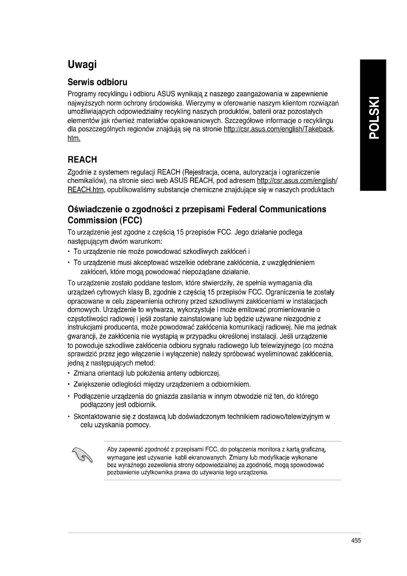 - Skontaktowanie się z dostawcą lub doświadczonym technikiem radiowo/telewizyjnym w celu uzyskania pomocy. Aby zapewnić zgodność z przepisami FCC, do połączenia monitora z kartą graczną, wymagane jest używanie kabli ekranowanych. Zmiany lub modykacje wykonane bez wyraźnego zezwolenia strony odpowiedzialnej za zgodność, mogą spowodować pozbawienie użytkownika prawa do używania tego urządzenia.456 POLSKI POLSKI POLSKI POLSKI