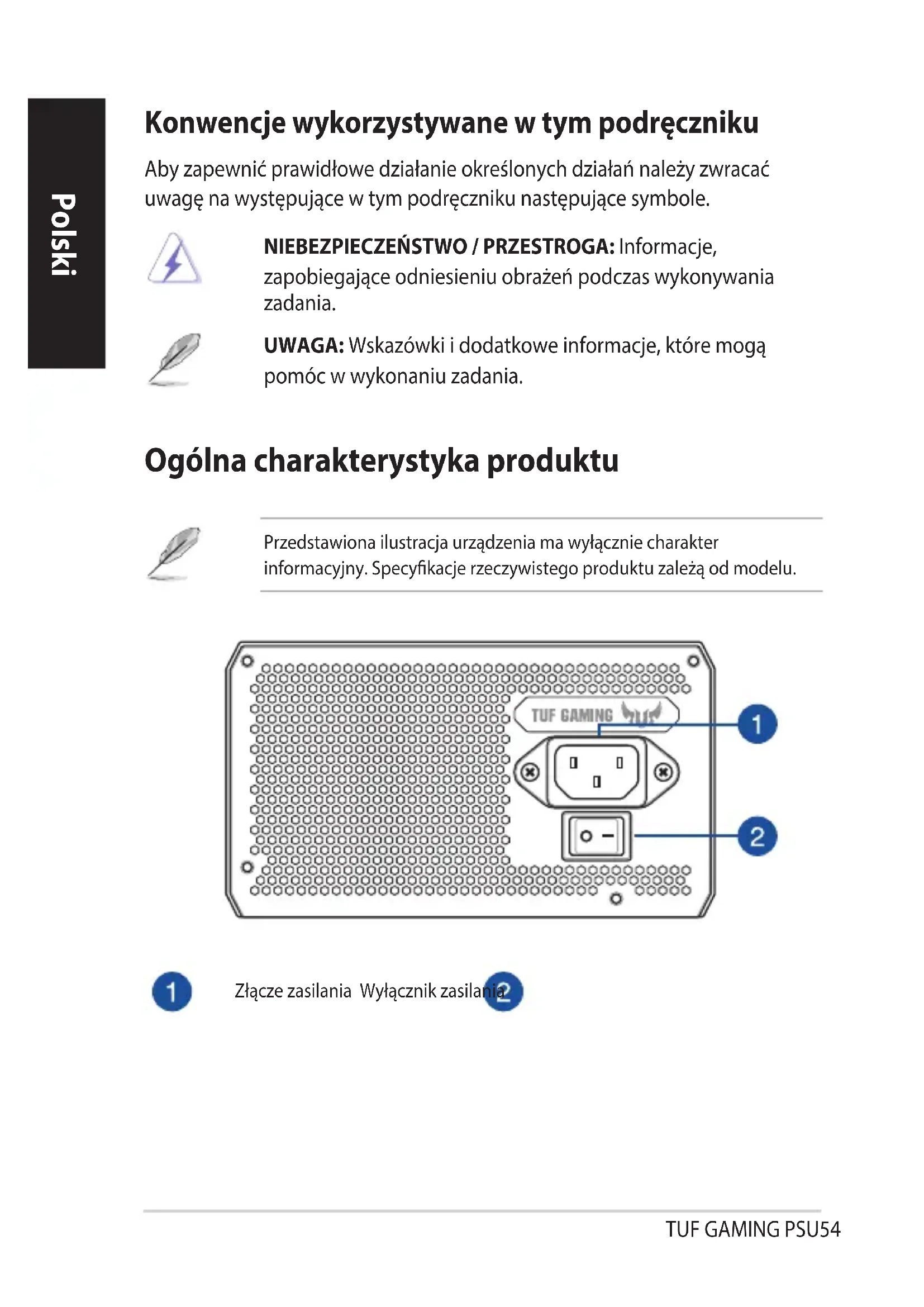 - 제조업체의 사용 지침과 기타 안전 지침을 준수하지 않을 경우 모든 보증 및 보장이 즉시 무효화됩니다. R45625 RoHSTUF GAMING PSU54 Polski Polski Konwencje wykorzystywane w tym podręczniku Aby zapewnić prawidłowe działanie określonych działań należy zwracać uwagę na występujące w tym podręczniku następujące symbole. NIEBEZPIECZEŃSTWO / PRZESTROGA: Informacje, zapobiegające odniesieniu obrażeń podczas wykonywania zadania. UWAGA: Wskazówki i dodatkowe informacje, które mogą pomóc w wykonaniu zadania. Ogólna charakterystyka produktu Przedstawiona ilustracja urządzenia ma wyłącznie charakter informacyjny. Specykacje rzeczywistego produktu zależą od modelu. Złącze zasilania Wyłącznik zasilaniaTUF GAMING PSU 55 Polski Przed podłączeniem lub odłączeniem kabli upewnij się, czy system jest wyłączony oraz wszystkie przewody zasilania systemu oraz wszystkie podłączone urządzenia są odłączone od zasilania.