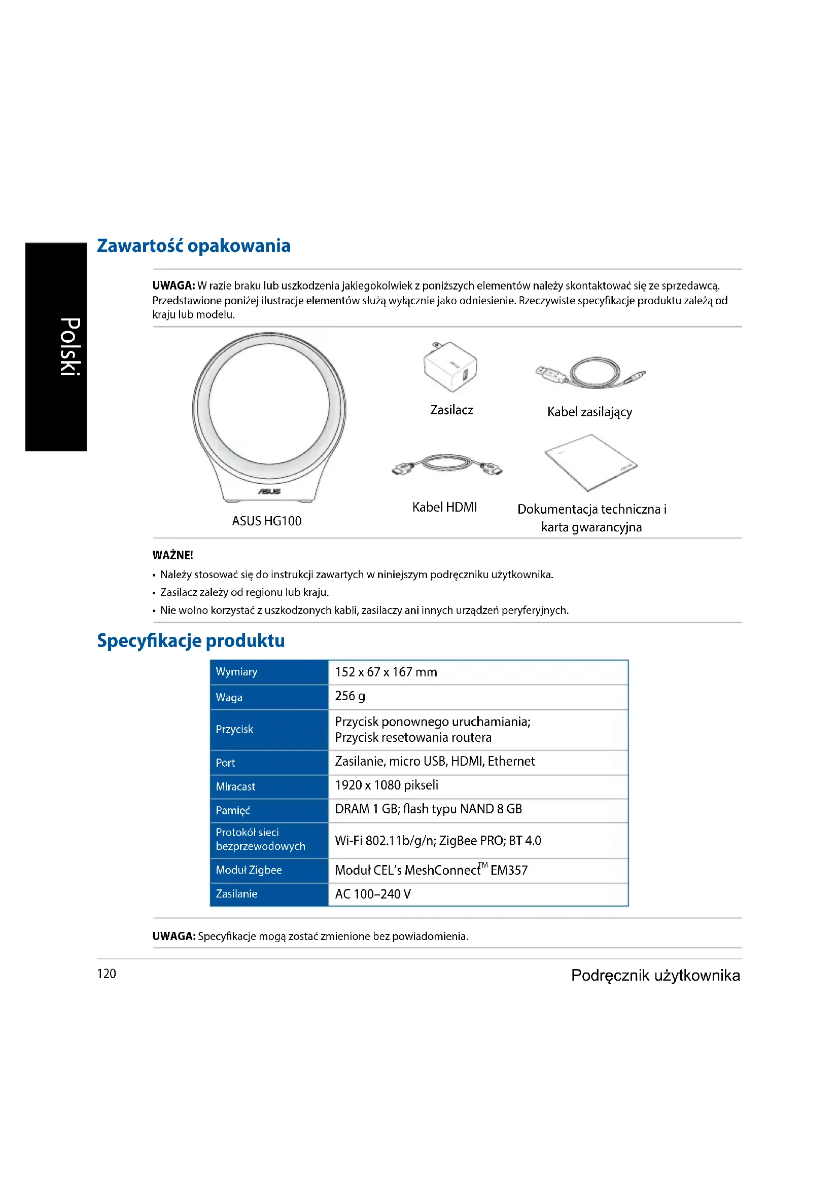 - Nie wolno korzystać z uszkodzonych kabli, zasilaczy ani innych urządzeń peryferyjnych. Zawartość opakowania UWAGA: W razie braku lub uszkodzenia jakiegokolwiek z poniższych elementów należy skontaktować się ze sprzedawcą. Przedstawione poniżej ilustracje elementów służą wyłącznie jako odniesienie. Rzeczywiste specykacje produktu zależą od kraju lub modelu. Specykacje produktu Wymiary 152 x 67 x 167 mm Waga 256g Przycisk Przycisk ponownego uruchamiania; Przycisk resetowania routera Port Zasilanie, micro USB, HDMI, Ethernet Miracast 1920 x 1080 pikseli Pamięć DRAM 1 GB; ash typu NAND 8 GB Protokół sieci bezprzewodowych Wi-Fi 802.11b/g/n; ZigBee PRO; BT 4.0 Moduł Zigbee Moduł CEL’s MeshConnect