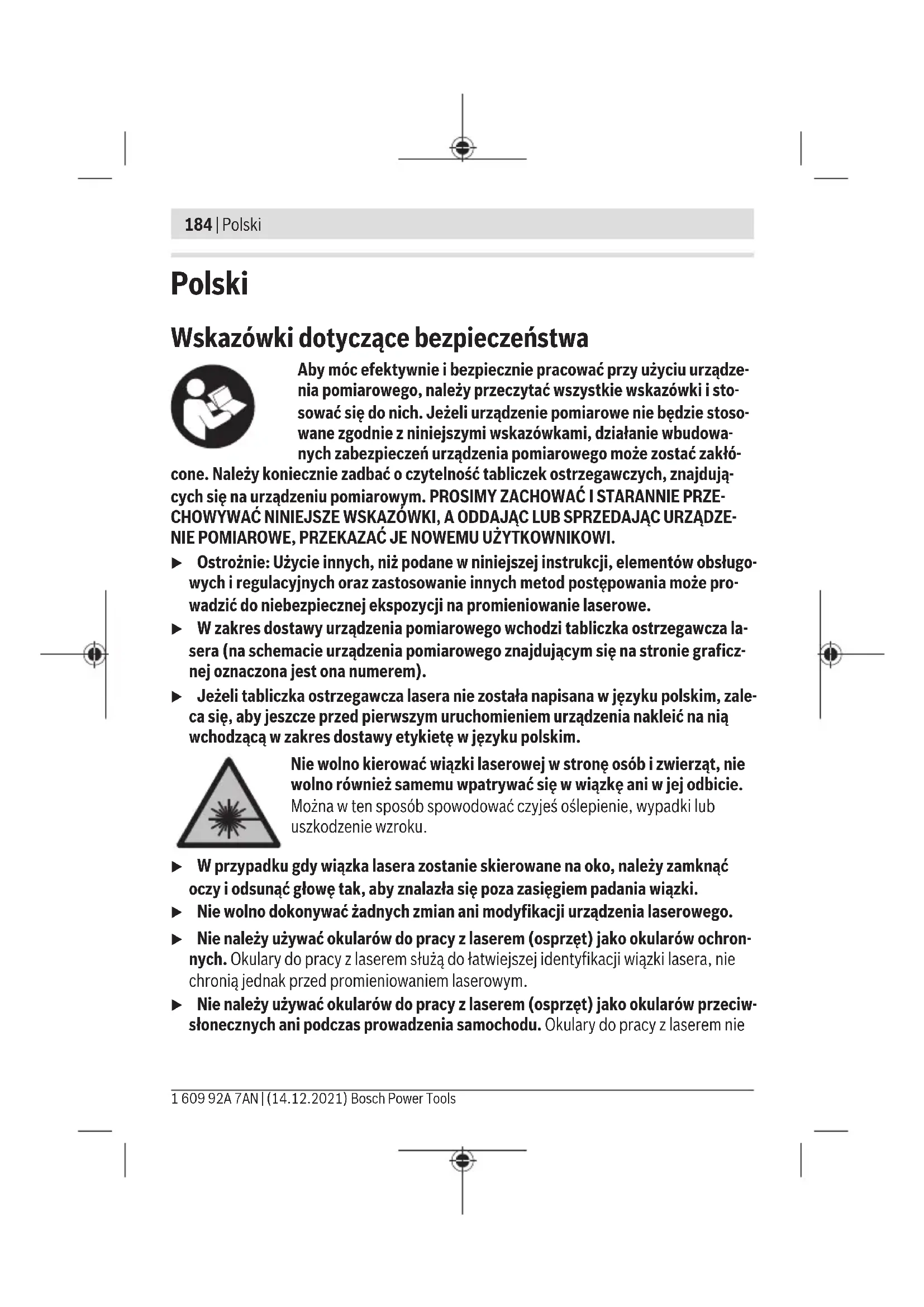 Karasoku Mahallesi 28028. Sokak No:20/A Merkez / ADANA Tel.: +903223599710 -3521379 Fax: +903223591323 E-mail: isiklar@isiklarelektrik.com Diğer servis adreslerini şurada bulabilirsiniz: www.bosch-pt.com/serviceaddresses Tasfiye Ölçme cihazları, aksesuar ve ambalaj malzemesi çevre dostu tasfiye amacıyla bir geri dönüşüm merkezine yollanmalıdır. Ölçme cihazını ve bataryaları evsel çöplerin içine atmayın! Sadece AB ülkeleri için: 2012/19/EU yönetmeliği uyarınca kullanım ömrünü tamamlamış ölçme cihazları ve 2006/66/EC yönetmeliği uyarınca arızalı veya kullanım ömrünü tamamlamış aküler/ bataryalar ayrı ayrı toplanmak ve çevre dostu tasfiye için bir geri dönüşüm merkezine yollanmak zorundadır. Bosch Power Tools 1 609 92A 7AN | (14.12.2021)184 | Polski Polski Wskazówki dotyczące bezpieczeństwa Aby móc efektywnie i bezpiecznie pracować przy użyciu urządze- nia pomiarowego, należy przeczytać wszystkie wskazówki i sto- sować się do nich. Jeżeli urządzenie pomiarowe nie będzie stoso- wane zgodnie z niniejszymi wskazówkami, działanie wbudowa- nych zabezpieczeń urządzenia pomiarowego może zostać zakłó- cone. Należy koniecznie zadbać o czytelność tabliczek ostrzegawczych, znajdują- cych się na urządzeniu pomiarowym. PROSIMY ZACHOWAĆ I STARANNIE PRZE- CHOWYWAĆ NINIEJSZE WSKAZÓWKI, A ODDAJĄC LUB SPRZEDAJĄC URZĄDZE- NIE POMIAROWE, PRZEKAZAĆ JE NOWEMU UŻYTKOWNIKOWI. u Ostrożnie: Użycie innych, niż podane w niniejszej instrukcji, elementów obsługo- wych iregulacyjnych oraz zastosowanie innych metod postępowania może pro- wadzić do niebezpiecznej ekspozycji na promieniowanie laserowe. u W zakres dostawy urządzenia pomiarowego wchodzi tabliczka ostrzegawcza la- sera (na schemacie urządzenia pomiarowego znajdującym się na stronie graficz- nej oznaczona jest ona numerem). u Jeżeli tabliczka ostrzegawcza lasera nie została napisana w języku polskim, zale- ca się, aby jeszcze przed pierwszym uruchomieniem urządzenia nakleić na nią wchodzącą w zakres dostawy etykietę w języku polskim. Nie wolno kierować wiązki laserowej wstronę osób i zwierząt, nie wolno również samemu wpatrywać się w wiązkę ani w jej odbicie. Można w ten sposób spowodować czyjeś oślepienie, wypadki lub uszkodzenie wzroku. u W przypadku gdy wiązka lasera zostanie skierowane na oko, należy zamknąć oczy i odsunąć głowę tak, aby znalazła się poza zasięgiem padania wiązki. u Nie wolno dokonywać żadnych zmian ani modyfikacji urządzenia laserowego. u Nie należy używać okularów do pracy z laserem (osprzęt) jako okularów ochron- nych. Okulary do pracy z laserem służą do łatwiejszej identyfikacji wiązki lasera, nie chronią jednak przed promieniowaniem laserowym. u Nie należy używać okularów do pracy z laserem (osprzęt) jako okularów przeciw- słonecznych ani podczas prowadzenia samochodu. Okulary do pracy z laserem nie 1 609 92A 7AN | (14.12.2021) Bosch Power ToolsPolski | 185 zapewniają całkowitej ochrony przed promieniowaniem UV i utrudniają rozróżnianie kolorów. u Naprawę urządzenia pomiarowego należy zlecać wyłącznie wykwalifikowanym fachowcom i wykonać ją tylko przy użyciu oryginalnych części zamiennych. Tylko w ten sposób zagwarantowane zostanie zachowanie bezpieczeństwa urządzenia. u Nie wolno udostępniać laserowego urządzenia pomiarowego do użytkowania dzieciom pozostawionym bez nadzoru. Mogą one nieumyślnie oślepić inne osoby lub same siebie. u Nie należy stosować tego urządzenia pomiarowego w otoczeniu zagrożonym wy- buchem, wktórym znajdują się łatwopalne ciecze, gazy lub pyły. W urządzeniu po- miarowym może dojść do utworzenia iskier, które mogą spowodować zapłon pyłów lub oparów. Nie należy umieszczać urządzenia pomiarowego i akcesoriów ma- gnetycznych w pobliżu implantów oraz innych urządzeń medycz- nych, np. rozrusznika serca lub pompy insulinowej. Magnesy urzą- dzenia pomiarowego i akcesoriów wytwarzają pole, które może zakłó- cić działanie implantów i urządzeń medycznych. u Urządzenie pomiarowe i akcesoria magnetyczne należy przechowywać z dala od magnetycznych nośników danych oraz urządzeń wrażliwych magnetycznie. Pod wpływem działania magnesów urządzenia pomiarowego i akcesoriów może dojść do nieodwracalnej utraty danych. Opis urządzenia i jego zastosowania Proszę zwrócić uwagę na rysunki zamieszczone na początku instrukcji obsługi. Użycie zgodne z przeznaczeniem Urządzenie pomiarowe przeznaczone jest do wyznaczania i wskazywania linii poziomych i pionowych. Urządzenie pomiarowe dostosowane jest do pracy w pomieszczeniach i na zewnątrz. Przedstawione graficznie komponenty Numeracja przedstawionych komponentów odnosi się do schematu urządzenia pomiaro- wego, znajdującego się na stronie graficznej. (1) Otwór wyjściowy wiązki lasera (2) Włącznik/wyłącznik (3) Przyłącze statywu 5/8" Bosch Power Tools 1 609 92A 7AN | (14.12.2021)186 | Polski (4) Przyłącze statywu 1/4" (5) Przycisk trybu pionowego (6) Przycisk trybu poziomego (7) Wskaźnik stanu (8) Wskaźnik blokady mechanizmu wahadła (9) Tabliczka ostrzegawcza lasera (10) Numer seryjny (11) Pokrywka wnęki na baterie (12) Blokada pokrywki wnęki na baterie (13) Uchwyt obrotowy (RM1)