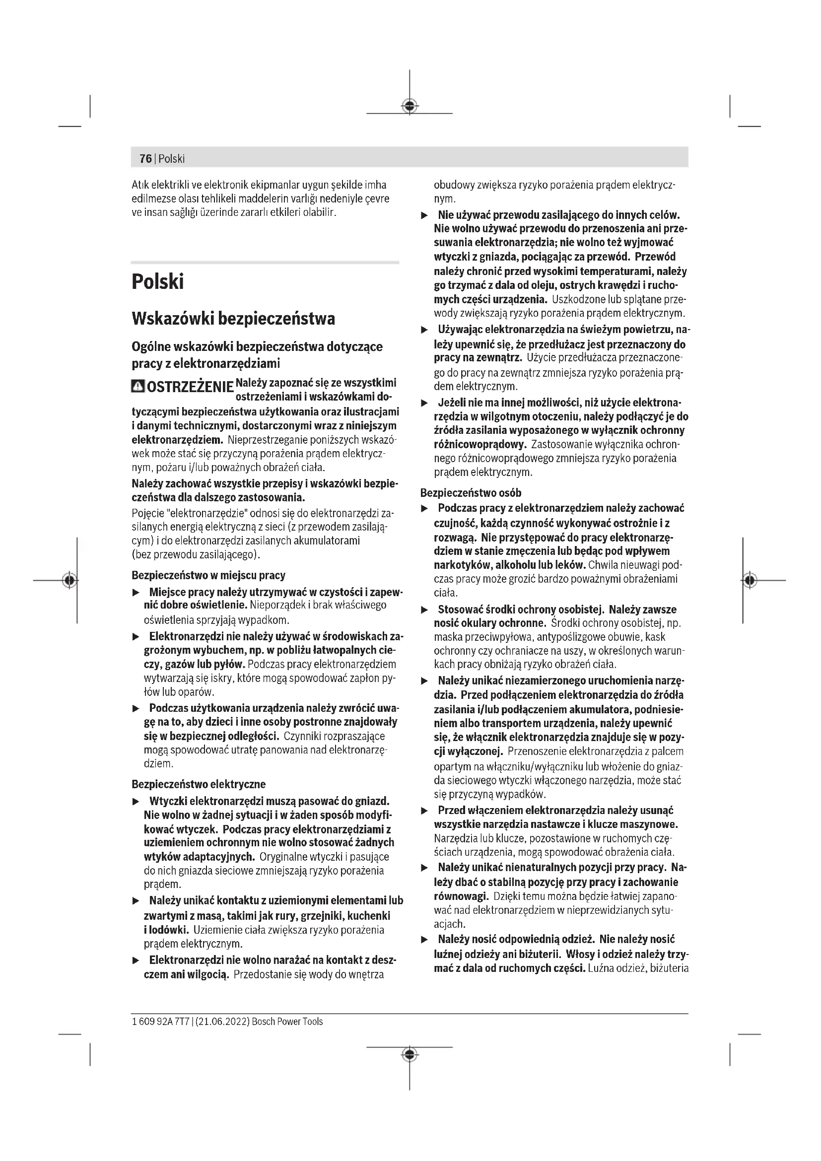 Karasoku Mahallesi 28028. Sokak No:20/A Merkez / ADANA Tel.: +903223599710 -3521379 Fax: +903223591323 E-mail: isiklar@isiklarelektrik.com Diğer servis adreslerini şurada bulabilirsiniz: www.bosch-pt.com/serviceaddresses Tasfiye Elektrikli el aleti, aksesuar ve ambalaj malzemesi çevre dostu bir yöntemle tasfiye edilmek üzere tekrar kazanım merkezine gönderilmelidir. Elektrikli el aletlerini evsel çöplerin içine atmayın! Sadece AB ülkeleri için: Eski elektrikli el aletleri ve elektronik aletlere ilişkin 2012/19/EU sayılı Avrupa Birliği yönetmeliği ve bunların tek tek ülkelerin hukuklarına uyarlanması uyarınca, kullanım ömrünü tamamlamış elektrikli el aletleri ayrı ayrı toplanmak ve çevre dostu bir yöntemle tasfiye edilmek üzere yeniden kazanım merkezlerine gönderilmek zorundadır. Bosch Power Tools 1 609 92A 7T7 | (21.06.2022)76 | Polski Atık elektrikli ve elektronik ekipmanlar uygun şekilde imha edilmezse olası tehlikeli maddelerin varlığı nedeniyle çevre ve insan sağlığı üzerinde zararlı etkileri olabilir. Polski Wskazówki bezpieczeństwa Ogólne wskazówki bezpieczeństwa dotyczące pracy z elektronarzędziami OSTRZEŻENIE Należy zapoznać się ze wszystkimi ostrzeżeniami i wskazówkami do- tyczącymi bezpieczeństwa użytkowania oraz ilustracjami i danymi technicznymi, dostarczonymi wraz z niniejszym elektronarzędziem. Nieprzestrzeganie poniższych wskazó- wek może stać się przyczyną porażenia prądem elektrycz- nym, pożaru i/lub poważnych obrażeń ciała. Należy zachować wszystkie przepisy i wskazówki bezpie- czeństwa dla dalszego zastosowania. Pojęcie "elektronarzędzie" odnosi się do elektronarzędzi za- silanych energią elektryczną z sieci (z przewodem zasilają- cym) i do elektronarzędzi zasilanych akumulatorami (bezprzewodu zasilającego). Bezpieczeństwo w miejscu pracy u Miejsce pracy należy utrzymywać w czystości i zapew- nić dobre oświetlenie. Nieporządek i brak właściwego oświetlenia sprzyjają wypadkom. u Elektronarzędzi nie należy używać w środowiskach za- grożonym wybuchem, np. w pobliżu łatwopalnych cie- czy, gazów lub pyłów. Podczas pracy elektronarzędziem wytwarzają się iskry, które mogą spowodować zapłon py- łów lub oparów. u Podczas użytkowania urządzenia należy zwrócić uwa- gę na to, aby dzieci i inne osoby postronne znajdowały się w bezpiecznej odległości. Czynniki rozpraszające mogą spowodować utratę panowania nad elektronarzę- dziem. Bezpieczeństwo elektryczne u Wtyczki elektronarzędzi muszą pasować do gniazd. Nie wolno w żadnej sytuacji i w żaden sposób modyfi- kować wtyczek. Podczas pracy elektronarzędziami z uziemieniem ochronnym nie wolno stosować żadnych wtyków adaptacyjnych. Oryginalne wtyczki i pasujące do nich gniazda sieciowe zmniejszają ryzyko porażenia prądem. u Należy unikać kontaktu z uziemionymi elementami lub zwartymi z masą, takimi jak rury, grzejniki, kuchenki ilodówki. Uziemienie ciała zwiększa ryzyko porażenia prądem elektrycznym. u Elektronarzędzi nie wolno narażać na kontakt z desz- czem ani wilgocią. Przedostanie się wody do wnętrza obudowy zwiększa ryzyko porażenia prądem elektrycz- nym. u Nie używać przewodu zasilającego do innych celów. Nie wolno używać przewodu do przenoszenia ani prze- suwania elektronarzędzia; nie wolno też wyjmować wtyczki z gniazda, pociągając za przewód. Przewód należy chronić przed wysokimi temperaturami, należy go trzymać zdala od oleju, ostrych krawędzi i rucho- mych części urządzenia. Uszkodzone lub splątane prze- wody zwiększają ryzyko porażenia prądem elektrycznym. u Używając elektronarzędzia na świeżym powietrzu, na- leży upewnić się, że przedłużacz jest przeznaczony do pracy na zewnątrz. Użycie przedłużacza przeznaczone- go do pracy na zewnątrz zmniejsza ryzyko porażenia prą- dem elektrycznym. u Jeżeli nie ma innej możliwości, niż użycie elektrona- rzędzia w wilgotnym otoczeniu, należy podłączyć je do źródła zasilania wyposażonego w wyłącznik ochronny różnicowoprądowy. Zastosowanie wyłącznika ochron- nego różnicowoprądowego zmniejsza ryzyko porażenia prądem elektrycznym. Bezpieczeństwo osób u Podczas pracy z elektronarzędziem należy zachować czujność, każdą czynność wykonywać ostrożnie i z rozwagą. Nie przystępować do pracy elektronarzę- dziem w stanie zmęczenia lub będąc pod wpływem narkotyków, alkoholu lub leków. Chwila nieuwagi pod- czas pracy może grozić bardzo poważnymi obrażeniami ciała. u Stosować środki ochrony osobistej. Należy zawsze nosić okulary ochronne. Środki ochrony osobistej, np. maska przeciwpyłowa, antypoślizgowe obuwie, kask ochronny czy ochraniacze na uszy, w określonych warun- kach pracy obniżają ryzyko obrażeń ciała. u Należy unikać niezamierzonego uruchomienia narzę- dzia. Przed podłączeniem elektronarzędzia do źródła zasilania i/lub podłączeniem akumulatora, podniesie- niem albo transportem urządzenia, należy upewnić się, że włącznik elektronarzędzia znajduje się w pozy- cji wyłączonej. Przenoszenie elektronarzędzia z palcem opartym na włączniku/wyłączniku lub włożenie do gniaz- da sieciowego wtyczki włączonego narzędzia, może stać się przyczyną wypadków. u Przed włączeniem elektronarzędzia należy usunąć wszystkie narzędzia nastawcze i klucze maszynowe. Narzędzia lub klucze, pozostawione wruchomych czę- ściach urządzenia, mogą spowodować obrażenia ciała. u Należy unikać nienaturalnych pozycji przy pracy. Na- leży dbać o stabilną pozycję przy pracy i zachowanie równowagi. Dzięki temu można będzie łatwiej zapano- wać nad elektronarzędziem w nieprzewidzianych sytu- acjach. u Należy nosić odpowiednią odzież. Nie należy nosić luźnej odzieży ani biżuterii. Włosy i odzież należy trzy- mać z dala od ruchomych części. Luźna odzież, biżuteria 1 609 92A 7T