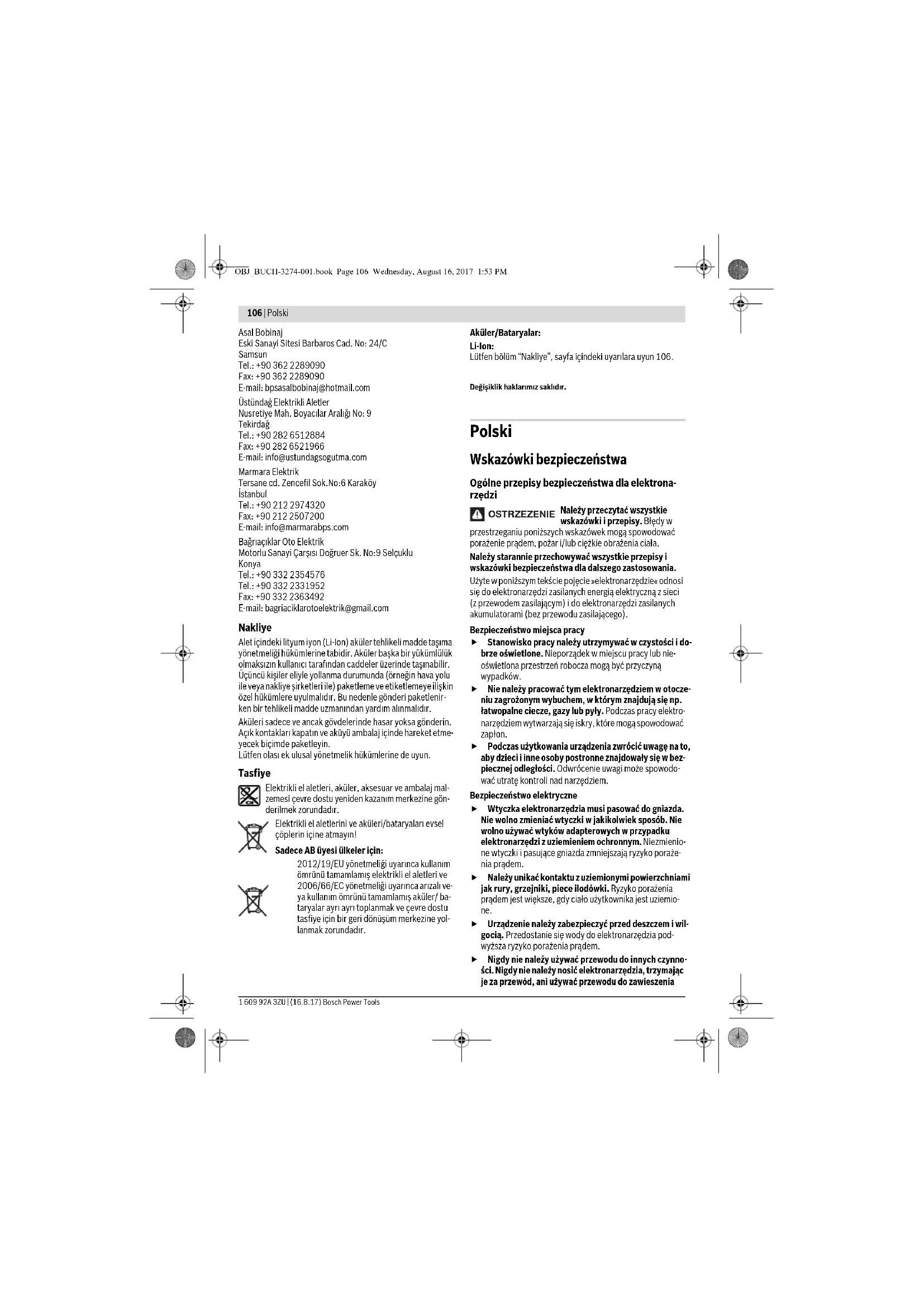 0...+45 –20...+50 Zalecane akumulatory GBA 36V Zalecane ładowarki AL 36.. GAL 36.. Ręczna pilarka tarczowa GKS 36 V-LI *w zależności od zastosowanego akumulatora** ograniczona wydajność przy temperaturze <0 °C OBJ_BUCH-3274-001.book Page 110 Wednesday, August 16, 2017 1:53 PMPolski | 111 Bosch Power Tools 1 609 92A 3ZU | (16.8.17) szej wydajności akumulatora, należy przed pierwszym uży- ciem całkowicie naładować akumulator w ładowarce. Akumulator litowo-jonowy można doładować w dowolnej chwili, nie powodując tym skrócenia jego żywotności. Prze- rwanie procesu ładowania nie niesie za sobą ryzyka uszkodze- nia ogniw akumulatora. Dzięki systemowi elektronicznej ochrony ogniw – »Electronic Cell Protection (ECP)« – akumulator litowo-jonowy jest za- bezpieczony przed głębokim rozładowaniem. Przy rozłado- wanym akumulatorze elektronarzędzie zostaje wyłączone przez układ ochronny – narzędzie robocze nie porusza się. Po automatycznym wyłączeniu elektronarzędzia nie naciskać ponownie włącznika. Może to doprowadzić do uszkodzenia akumulatora. Przestrzegać wskazówek dotyczących usuwania odpadów. Wyjmowanie akumulatora Akumulator 6 posiada dwa stopnie blokady, zapobiegające je- go wypadnięciu w przypadku niezamierzonego naciśnięcia przycisku odblokowującego 5. Akumulator umieszczony w obudowie elektronarzędzia, przytrzymywany jest na miejscu za pomocą sprężyny. Aby wyjąć akumulator 6: – Docisnąć akumulator do stopki elektronarzędzia (1.), przyciskając jednocześnie przycisk zwalniania blokady akumulatora 5 (2.). – Wysunąć akumulator z elektronarzędzia na tyle, aby ukazał się czerwony pasek (3.). – Ponownie nacisnąć przycisk zwalniania blokady 5 i całko- wicie wyjąć akumulator. Wskaźnik stanu naładowania akumulatora (zob. rys. B) Stan naładowania akumulatora 6 pokazywany jest przez trzy zielone diody LED wskaźnika naładowania akumulatora 27. Sprawdzanie stanu naładowania akumulatora możliwe jest – ze względów bezpieczeństwa – jedynie przy wyłączonym elektronarzędziu. Nacisnąć przycisk 26, aby ukazać stan naładowania akumula- tora (operacja możliwa jest też po wyjęciu akumulatora z elek- tronarzędzia). Po ok. 5 sekundach wskaźnik naładowania akumulatora wygasa samoczynnie. Jeżeli po naciśnięciu przycisku 26 nie zapali się żadna dioda LED oznacza to, że akumulator jest uszkodzony i należy go wy- mienić. Podczas procesu ładowania akumulatora trzy zielone diody LED zapalają się jedna po drugiej i gasną na krótki okres cza- su. Akumulator jest naładowany całkowicie, gdy wszystkie trzy diody LED palą się światłem ciągłym. Ponowne wygaśnię- cie wszystkich trzech zielonych diod LED nastąpi około 5 minut po całkowitym naładowaniu akumulatora. Mocowanie/wymiana tarczy tnącej Przed wszystkimi pracami przy elektronarzędziu nale- ży wyjąć akumulator. Podczas montażu tarczy pilarskiej używać rękawic ochronnych. Przy kontakcie z tarczą pilarską istnieje nie- bezpieczeństwo zranienia. Stosować należy wyłącznie tarcze pilarskie, których parametry są zgodne z danymi znamionowymi podany- mi w niniejszej instrukcji obsługi. W żadnym wypadku nie wolno używać tarcz szlifier- skich jako narzędzi roboczych. Wybór tarczy tnącej Lista zalecanych tarcz tnących znajduje się na końcu niniej- szej instrukcji. Demontaż tarczy tnącej (zob. rys. A) W celu wymiany narzędzia roboczego najlepiej jest położyć elektronarzędzie na przedniej części obudowy silnika. – Nacisnąć przycisk blokady wrzeciona 17 iprzytrzymać w tej pozycji. Przycisk blokady wrzeciona 17 wolno naciskać tylko przy nieruchomym wrzecionie. W przeciwnym wypadku można uszkodzić elektronarzędzie. – Wykręcić za pomocą klucza sześciokątnego 19 nakrętkę mocującą 24, obracając ją w kierunku . –Odchylić osłonę 10 do tyłu i przytrzymać. – Zdjąć podkładkę mocującą 23 i tarczę tnącą 22 z wrzecio- na 20. Mocowanie tarczy tnącej (zob. rys. A) W celu wymiany narzędzia roboczego najlepiej jest położyć elektronarzędzie na przedniej części obudowy silnika. – Oczyścić tarczę 22 i wszystkie elementy mocujące. –Odchylić osłonę 10 do tyłu i przytrzymać. –Nałożyć tarczę 22 na kołnierz mocujący 21. Kierunek cię- cia tarczy (strzałka na tarczy) musi być zgodny z kierun- kiem obrotów wrzeciona (strzałka na osłonie wahliwej 10). – Nałożyć podkładkę mocującą 23, po czym nakręcić śrubę mocującą 24, obracając nią w kierunku . Należy przy tym zwrócić uwagę na właściwe położenie podkładki mocują- cej 21 i tulei mocującej 23. – Nacisnąć przycisk blokady wrzeciona 17 iprzytrzymać w tej pozycji. – Mocno przekręcić za pomocą klucza imbusowego 19 śrubę 24 w kierunku . Moment dokręcania powinien wynosić 6–9 Nm, co odpowiada ręcznej sile nacisku plus ¼ obro- ty/-ów lub 3 kreski podziałki 25 na kołpaku ochronnym 7. Wskaźnik LED Pojemność Światło ciągłe 3 x zielone ≥ 2/3 Światło ciągłe 2 x zielone ≥ 1/3 Światło ciągłe 1 x zielone <1/3 Światło migające 1 x zielone Rezerwa OBJ_BUCH-3274-001.book Page 111 Wednesday, August 16, 2017 1:53 PM112 | Polski 1 609 92A 3ZU | (16.8.17) Bosch Power Tools Odsysanie pyłów/wiórów Przed wszystkimi pracami przy elektronarzędziu nale- ży wyjąć akumulator. Pyły niektórych materiałów, na przykład powłok malar- skich z zawartością ołowiu, niektórych gatunków drewna, minerałów lub niektórych rodzajów metalu, mogą stano- wić zagrożenie dla zdrowia. Bezpośredni kontakt fizyczny z pyłami lub przedostanie się ich do płuc może wywołać re- akcje alergiczne i/lub choroby układu oddechowego ope- ratora lub osób znajdujących się w pobliżu. Niektóre rodzaje pyłów, np. dębiny lub buczyny uważane są za rakotwórcze, szczególnie w połączeniu z substancja- mi do obróbki drewna (chromiany, impregnaty do drew- na). Materiały, zawi