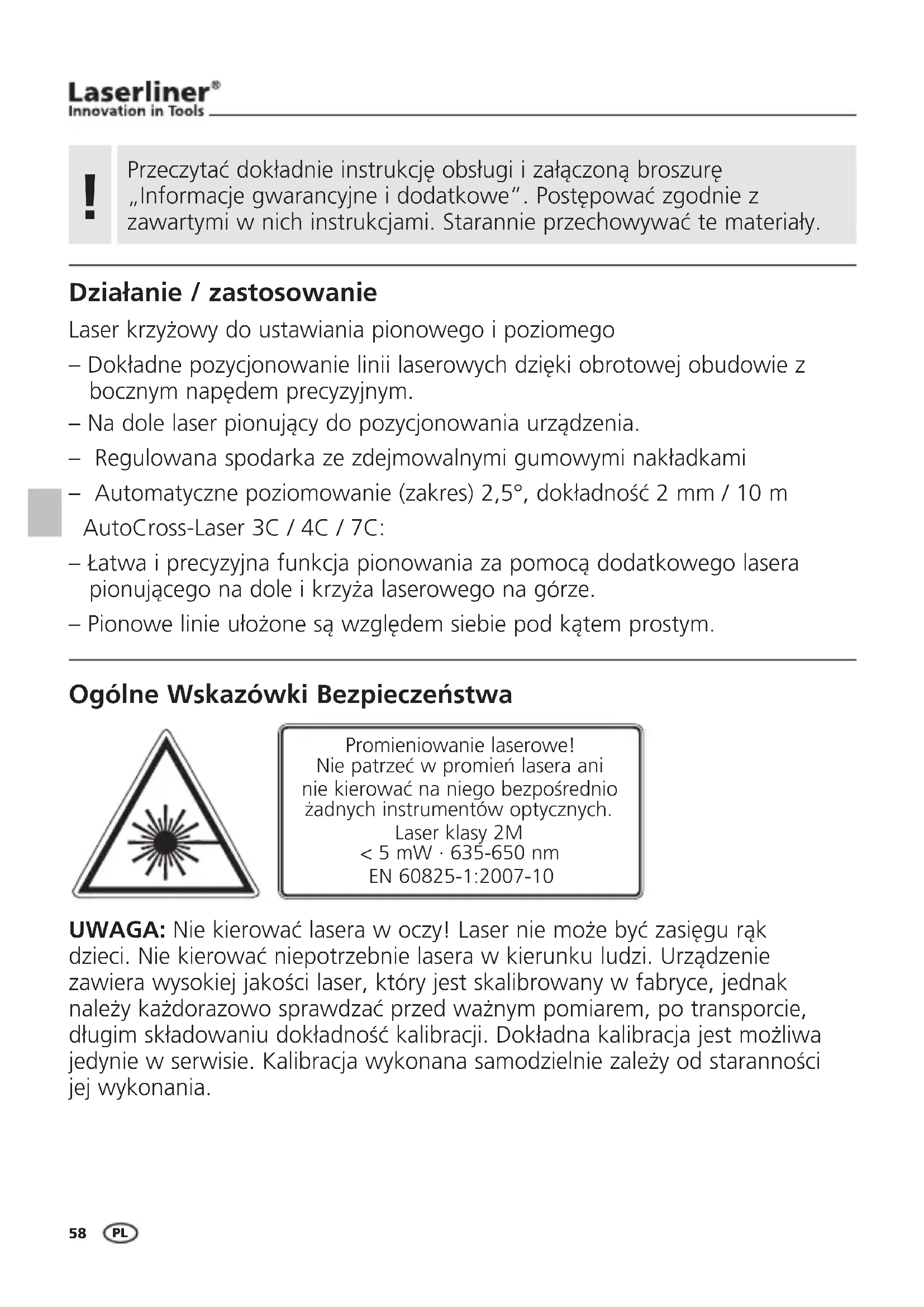 Manual_ACL-2C,3C,4C,7C_Rev.0512_DE-SE.indd 57 31.05.12 14:4858 DziaĜanie / zastosowanie Laser krzyżowy do ustawiania pionowego i poziomego – DokÙadne pozycjonowanie linii laserowych dziŐki obrotowej obudowie z bocznym napŐdem precyzyjnym. – Na dole laser pionujŅcy do pozycjonowania urzŅdzenia. – Regulowana spodarka ze zdejmowalnymi gumowymi nakÙadkami – Automatyczne poziomowanie (zakres) 2,5°, dokÙadnoūņ 2 mm / 10 m AutoCross-Laser 3C / 4C / 7C: – Øatwa i precyzyjna funkcja pionowania za pomocŅ dodatkowego lasera pionujŅcego na dole i krzyża laserowego na górze. – Pionowe linie uÙożone sŅ wzglŐdem siebie pod kŅtem prostym. Ogólne Wskazówki BezpieczeĞstwa UWAGA: Nie kierowaņ lasera w oczy! Laser nie może byņ zasiŐgu rŅk dzieci. Nie kierowaņ niepotrzebnie lasera w kierunku ludzi. UrzŅdzenie zawiera wysokiej jakoūci laser, który jest skalibrowany w fabryce, jednak należy każdorazowo sprawdzaņ przed ważnym pomiarem, po transporcie, dÙugim skÙadowaniu dokÙadnoūņ kalibracji. DokÙadna kalibracja jest możliwa jedynie w serwisie. Kalibracja wykonana samodzielnie zależy od starannoūci jej wykonania. Promieniowanie laserowe! Nie patrzeņ w promieš lasera ani nie kierowaņ na niego bezpoūrednio żadnych instrumentów optycznych. Laser klasy 2M < 5 mW · 635-650 nm EN 60825-1:2007-10 Przeczytaņ dokÙadnie instrukcjŐ obsÙugi i zaÙŅczonŅ broszurŐ „Informacje gwarancyjne i dodatkowe”. PostŐpowaņ zgodnie z zawartymi w nich instrukcjami. Starannie przechowywaņ te materiaÙy.