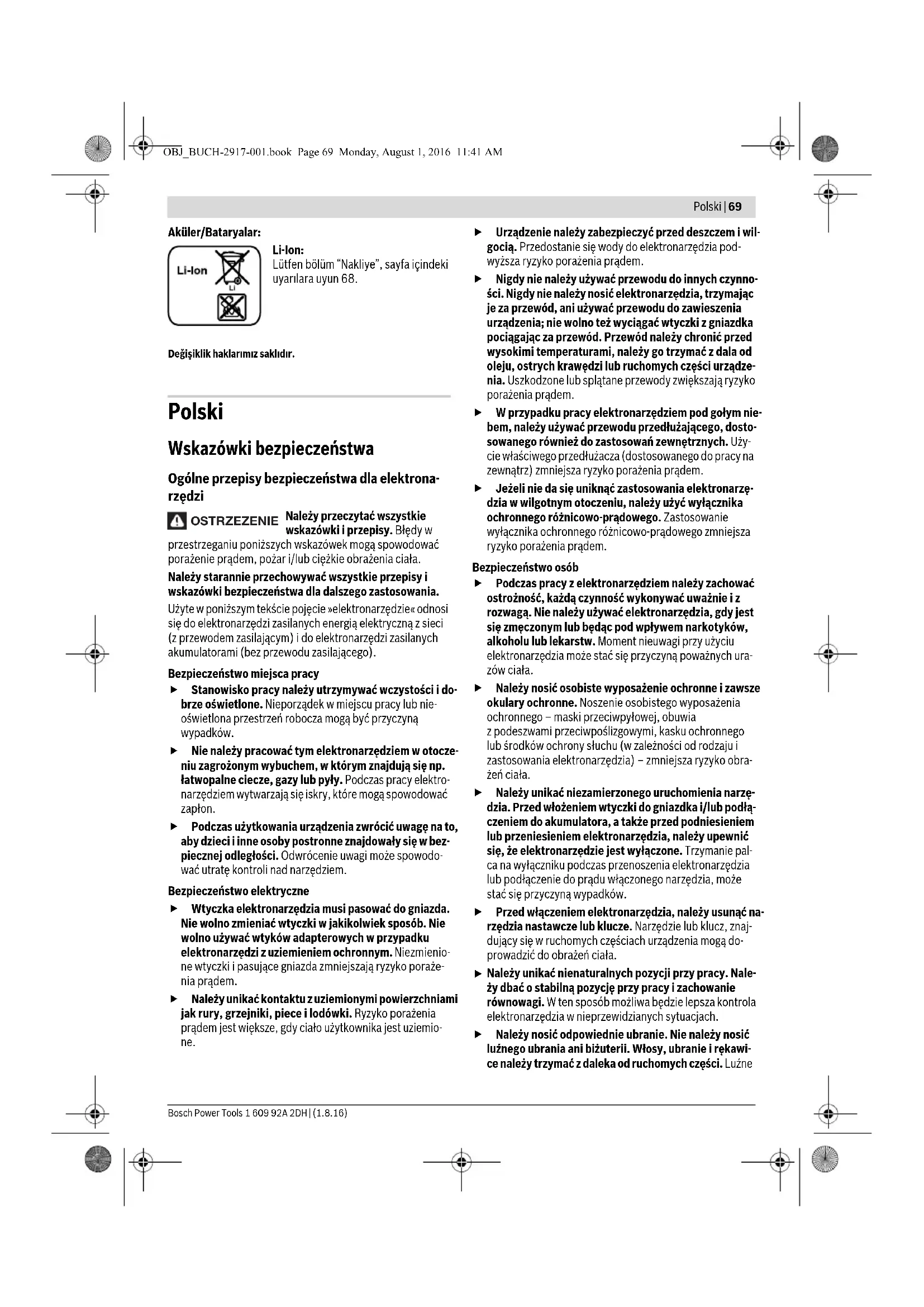 Denizli Tel.: 0258 2620666 Bulut Elektrik İstasyon Cad. No: 52/B Devlet Tiyatrosu Karşısı Elazığ Tel.: 0424 2183559 Körfez Elektrik Sanayi Çarşısı 770 Sok. No: 71 Erzincan Tel.: 0446 2230959 Ege Elektrik İnönü Bulvaro No: 135 Muğla Makasarası Fethiye Fethiye Tel.: 0252 6145701 Değer İş Bobinaj İsmetpaşa Mah. İlk Belediye Başkan Cad. 5/C Şahinbey Gaziantep Tel.: 0342 2316432 Çözüm Bobinaj İsmetpaşa Mah. Eski Şahinbey Belediyesi altı Cad. No: 3/C Gaziantep Tel.: 0342 2319500 Onarım Bobinaj Raifpaşa Cad. No: 67 İskenderun Hatay Tel.: 0326 6137546 Günşah Otomotiv Beylikdüzü Sanayi Sit. No: 210 Beylikdüzü İstanbul Tel.: 0212 8720066 Aygem 10021 Sok. No: 11 AOSB Çiğli İzmir Tel.: 0232 3768074 Sezmen Bobinaj Ege İş Merkezi 1201/4 Sok. No: 4/B Yenişehir İzmir Tel.: 0232 4571465 Ankaralı Elektrik Eski Sanayi Bölgesi 3. Cad. No: 43 Kayseri Tel.: 0352 3364216 Asal Bobinaj Eski Sanayi Sitesi Barbaros Cad. No: 24 Samsun Tel.: 0362 2289090 Üstündağ Elektrikli Aletler Nusretiye Mah. Boyacılar Aralığı No: 9 Tekirdağ Tel.: 0282 6512884 Nakliye Alet içindeki lityum iyon (Li-Ion) aküler tehlikeli madde taşıma yönetmeliği hükümlerine tabidir. Aküler başka bir yükümlülük olmaksızın kullanıcı tarafından caddeler üzerinde taşınabilir. Üçüncü kişiler eliyle yollanma durumunda (örneğin hava yolu ile veya nakliye şirketleri ile) paketleme ve etiketlemeye ilişkin özel hükümlere uyulmalıdır. Bu nedenle gönderi paketlenir- ken bir tehlikeli madde uzmanından yardım alınmalıdır. Aküleri sadece ve ancak gövdelerinde hasar yoksa gönderin. Açık kontakları kapatın ve aküyü ambalaj içinde hareket etme- yecek biçimde paketleyin. Lütfen olası ek ulusal yönetmelik hükümlerine de uyun. Tasfiye Elektrikli el aletleri, aküler, aksesuar ve ambalaj mal- zemesi çevre dostu yeniden kazanım merkezine gön- derilmek zorundadır. Elektrikli el aletlerini ve aküleri/bataryaları evsel çöplerin içine atmayın! Sadece AB üyesi ülkeler için: 2012/19/EU yönetmeliği uyarınca kullanım ömrünü tamamlamış elektrikli el aletleri ve 2006/66/EC yönetmeliği uyarınca arızalı veya kullanım ömrünü tamamlamış aküler/ bataryalar ayrı ayrı toplanmak ve çevre dos- tu tasfiye için bir geri dönüşüm merkezine yollanmak zorundadır. OBJ_BUCH-2917-001.book Page 68 Monday, August 1, 2016 11:41 AMPolski | 69 Bosch Power Tools 1 609 92A 2DH | (1.8.16) Aküler/Bataryalar: Li-Ion: Lütfen bölüm “Nakliye”, sayfa içindeki uyarılara uyun 68. Değişiklik haklarımız saklıdır. Polski Wskazówki bezpieczeństwa Ogólne przepisy bezpieczeństwa dla elektrona- rzędzi Należy przeczytać wszystkie wskazówki i przepisy. Błędy w przestrzeganiu poniższych wskazówek mogą spowodować porażenie prądem, pożar i/lub ciężkie obrażenia ciała. Należy starannie przechowywać wszystkie przepisy i wskazówki bezpieczeństwa dla dalszego zastosowania. Użyte w poniższym tekście pojęcie »elektronarzędzie« odnosi się do elektronarzędzi zasilanych energią elektryczną z sieci (z przewodem zasilającym) i do elektronarzędzi zasilanych akumulatorami (bez przewodu zasilającego). Bezpieczeństwo miejsca pracy Stanowisko pracy należy utrzymywać wczystości i do- brze oświetlone. Nieporządek w miejscu pracy lub nie- oświetlona przestrzeń robocza mogą być przyczyną wypadków. Nie należy pracować tym elektronarzędziem w otocze- niu zagrożonym wybuchem, w którym znajdują się np. łatwopalne ciecze, gazy lub pyły. Podczas pracy elektro- narzędziem wytwarzają się iskry, które mogą spowodować zapłon. Podczas użytkowania urządzenia zwrócić uwagę na to, aby dzieci i inne osoby postronne znajdowały się w bez- piecznej odległości. Odwrócenie uwagi może spowodo- wać utratę kontroli nad narzędziem. Bezpieczeństwo elektryczne Wtyczka elektronarzędzia musi pasować do gniazda. Nie wolno zmieniać wtyczki w jakikolwiek sposób. Nie wolno używać wtyków adapterowych w przypadku elektronarzędzi z uziemieniem ochronnym. Niezmienio- ne wtyczki i pasujące gniazda zmniejszają ryzyko poraże- nia prądem. Należy unikać kontaktu z uziemionymi powierzchniami jak rury, grzejniki, piece i lodówki. Ryzyko porażenia prądem jest większe, gdy ciało użytkownika jest uziemio- ne. Urządzenie należy zabezpieczyć przed deszczem i wil- gocią. Przedostanie się wody do elektronarzędzia pod- wyższa ryzyko porażenia prądem. Nigdy nie należy używać przewodu do innych czynno- ści. Nigdy nie należy nosić elektronarzędzia, trzymając je za przewód, ani używać przewodu do zawieszenia urządzenia; nie wolno też wyciągać wtyczki z gniazdka pociągając za przewód. Przewód należy chronić przed wysokimi temperaturami, należy go trzymać z dala od oleju, ostrych krawędzi lub ruchomych części urządze- nia. Uszkodzone lub splątane przewody zwiększają ryzyko porażenia prądem. W przypadku pracy elektronarzędziem pod gołym nie- bem, należy używać przewodu przedłużającego, dosto- sowanego również do zastosowań zewnętrznych. Uży- cie właściwego przedłużacza (dostosowanego do pracy na zewnątrz) zmniejsza ryzyko porażenia prądem. Jeżeli nie da się uniknąć zastosowania elektronarzę- dzia w wilgotnym otoczeniu, należy użyć wyłącznika ochronnego różnicowo-prądowego. Zastosowanie wyłącznika ochronnego różnicowo-prądowego zmniejsza ryzyko porażenia prądem. Bezpieczeństwo osób Podczas pracy z elektronarzędziem należy zachować ostrożność, każdą czynność wykonywać uważnie i z rozwagą. Nie należy używać elektronarzędzia, gdy jest się zmęczonym lub będąc pod wpływem narkotyków, alkoholu lub lekarstw. Moment nieuwagi przy użyciu elektronarzędzia może stać się przyczyną poważnych ura- zów ciała. Należy nosić osobiste wyposażenie ochronne i zawsze okulary ochronne. Noszenie osobistego wyposażenia ochronnego – mask
