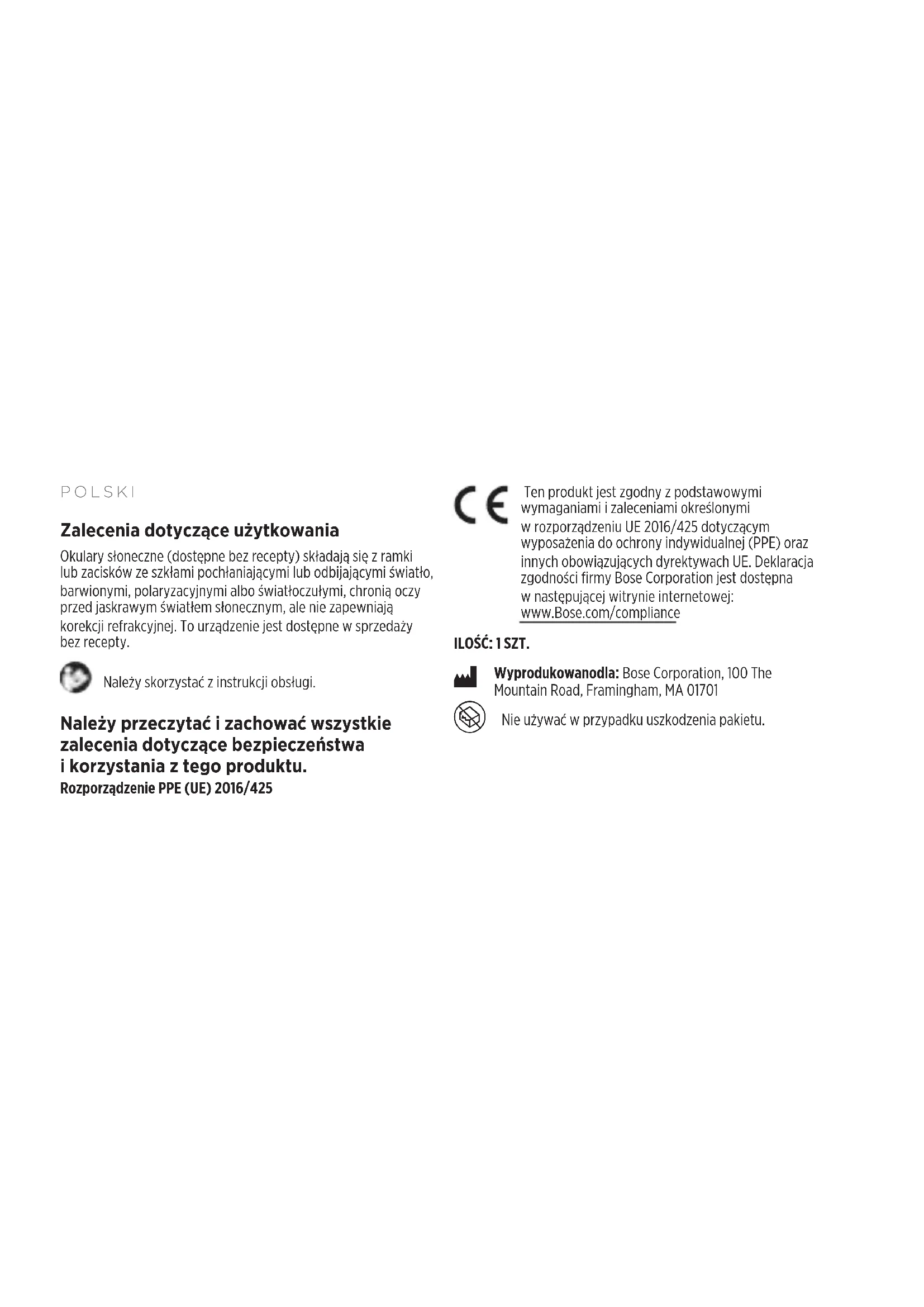 Videoer Advarsel/ forholdsregelPOLSKI Zalecenia dotyczące użytkowania Okulary słoneczne (dostępne bezrecepty) składają się zramki lubzacisków zeszkłami pochłaniającymi lubodbijającymi światło, barwionymi, polaryzacyjnymi albo światłoczułymi, chronią oczy przed jaskrawym światłem słonecznym, alenie zapewniają korekcji refrakcyjnej. Tourządzenie jest dostępne wsprzedaży bez recepty. Należy skorzystać zinstrukcji obsługi. Należy przeczytać izachować wszystkie zalecenia dotyczące bezpieczeństwa ikorzystania ztego produktu. Rozporządzenie PPE (UE) 2016/425 Ten produkt jest zgodny zpodstawowymi wymaganiami izaleceniami określonymi wrozporządzeniu UE 2016/425 dotyczącym wyposażenia doochrony indywidualnej (PPE) oraz innych obowiązujących dyrektywach UE. Deklaracja zgodności firmy Bose Corporation jest dostępna wnastępującej witrynie internetowej: www.Bose.com/compliance ILOŚĆ: 1SZT.