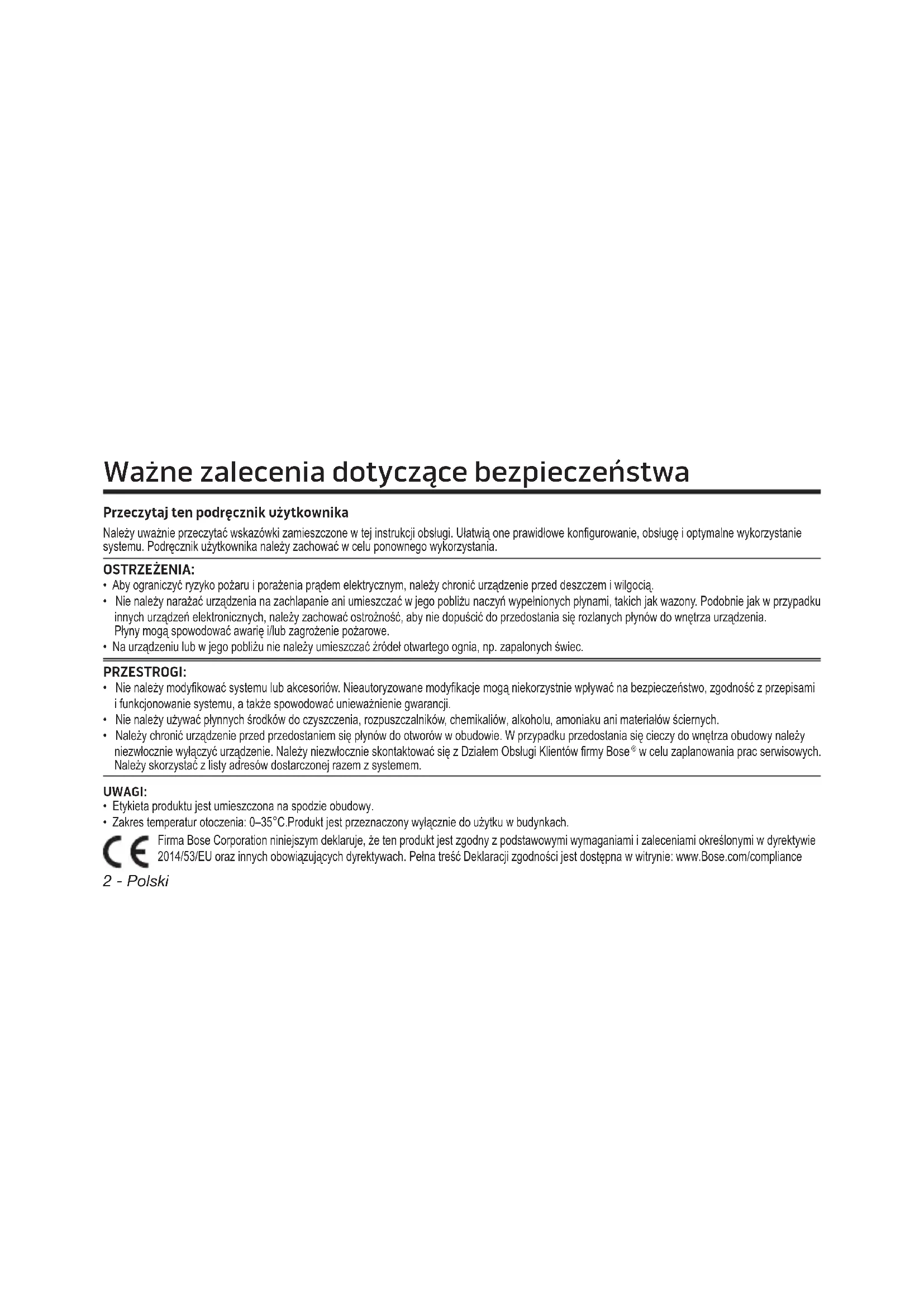 og logoene er registrerte varemerker som tilhører Bluetooth SIG, Inc. All Bose Corporations bruk av disse varemerkene er på lisens.2 - Polski Przeczytaj ten podręcznik użytkownika Należy uważnie przeczytać wskazówki zamieszczone w tej instrukcji obsługi. Ułatwią one prawidłowe konfigurowanie, obsługę i optymalne wykorzystanie systemu. Podręcznik użytkownika należy zachować w celu ponownego wykorzystania. OSTRZEŻENIA:
