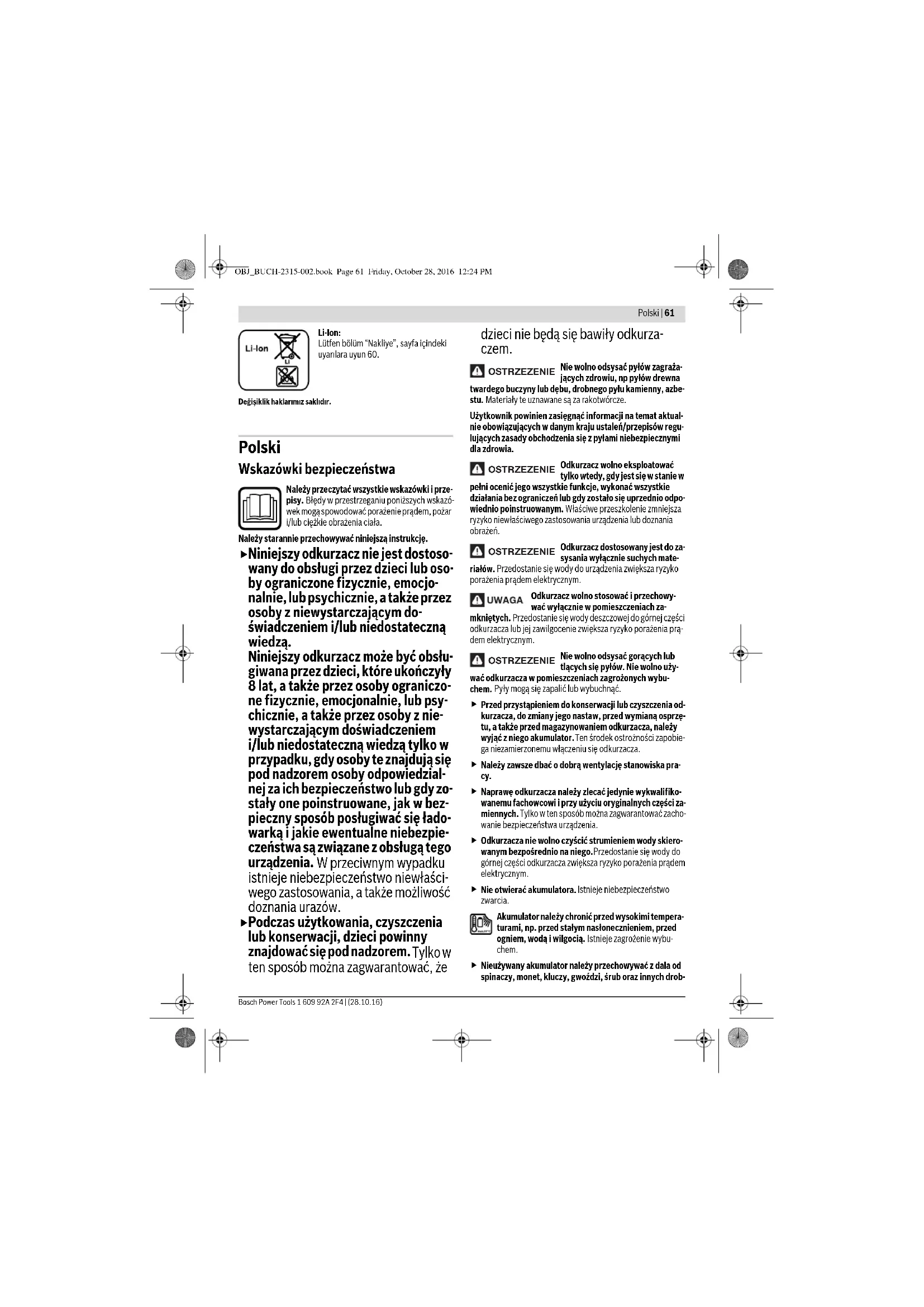 gwarantuje optymalnej wydajności odsysania. Jeżeli po przeprowadzeniu tych czynności, nie zwiększy się wy- dajność odsysania, odkurzacz należy oddać do specjalistyczne- go punktu serwisowego. Obsługa klienta oraz doradztwo dotyczące użytko- wania W punkcie obsługi klienta można uzyskać odpowiedzi na pytania dotyczące napraw i konserwacji nabytego produktu, a także do- tyczące części zamiennych. Rysunki rozłożeniowe oraz informa- cje dotyczące części zamiennych można znaleźć również pod adresem: www.bosch-pt.com Nasz zespół doradztwa dotyczącego użytkowania odpowie na wszystkie pytania związane z produktami firmy Bosch oraz ich osprzętem. Przy wszystkich zgłoszeniach oraz zamówieniach części zamien- nych konieczne jest podanie 10-cyfrowego numeru katalogowe- go, znajdującego się na tabliczce znamionowej produktu. Polska Robert Bosch Sp. z o.o. Serwis Elektronarzędzi Ul. Szyszkowa 35/37 OBJ_BUCH-2315-002.book Page 64 Friday, October 28, 2016 12:24 PMČesky | 65Bosch Power Tools 1 609 92A 2F4 | (28.10.16)02-285 WarszawaNa www.bosch-pt.pl znajdą Państwo wszystkie szczegóły do-tyczące usług serwisowych online.Tel.: 22 7154460Faks: 22 7154441E-Mail: bsc@pl.bosch.comInfolinia Działu Elektronarzędzi: 801 100900 (w cenie połączenia lokalnego)E-Mail: elektronarzedzia.info@pl.bosch.comwww.bosch.pl Transport Załączone w dostawie akumulatory litowo jonowe podlegają wy-maganiom przepisów dotyczących towarów niebezpiecznych. Akumulatory mogą być transportowane drogą lądową przez użytkownika bez konieczności spełnienia jakichkolwiek dal-szych warunków.W przypadku przesyłki przez osoby trzecie (np. transport drogą powietrzną lub za pośrednictwem firmy spedycyjnej) należy do-stosować się do szczególnych wymogów dotyczących opakowa-nia i znaczenia towaru. W takim wypadku podczas przygotowy-wania towaru do wysyłki należy skonsultować się z ekspertem d/s towarów niebezpiecznych.Akumulatory można wysyłać tylko wówczas, gdy ich obudowa nie jest uszkodzona. Odsłonięte styki należy zakleić, a akumula-tor zapakować w taki sposób, aby nie mógł on się poruszać (przesuwać) w opakowaniu.Należy wziąć też pod uwagę ewentualne przepisy prawa krajo-wego. Usuwanie odpadów Odkurzacz, akumulatory, osprzęt i opakowanie należy oddać do powtórnego przetworzenia zgodnego z obo-wiązującymi przepisami w zakresie ochrony środowi- ska. Nie wolno wyrzucać odkurzacza i akumulatorów/baterii razem z odpadami z gospodarstwa domowego!Tylko dla państw należących do UE:Zgodnie z europejską wytyczną 2012/19/WE, niezdatne do użytku odkurza-cze, a zgodnie z europejską wytyczną 2006/66/WE uszkodzone lub zużyte akumu-latory/baterie, należy zbierać osobno i dopro-wadzić do ponownego przetworzenia zgod-nego z zasadami ochrony środowiska.Akumulatory/Baterie:Li-Ion:Proszę stosować się do wskazówek, znajdujących się w rozdziale „Trans-port“, str. 65.Zastrzega się prawo dokonywania zmian. Česky Bezpečnostní upozornění Čtěte všechna varovná upozornění a pokyny. Zanedbání při dodržování varovných upozornění a pokynů mohou mít za následek úraz elektrickým proudem, požár a/nebo těžká poranění.Tyto pokyny dobře uschovejte.