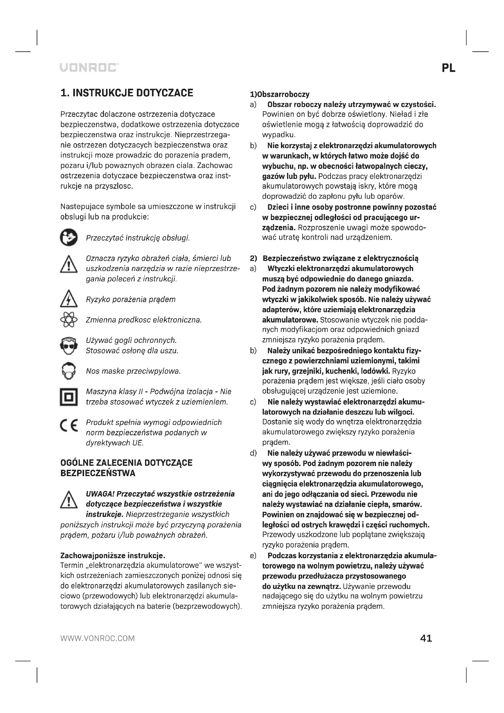 - Użyto części zamiennych innych niż oryginalne. Niniejsza gwarancja to wyłączna gwarancja pro- ducenta i nie obowiązują żadne inne wyrażone ani dorozumiane gwarancje. Nie obowiązują żadne inne wyrażone ani dorozumiane gwarancje o zakresie przekraczającym niniejszą gwarancję, co obejmuje dorozumiane gwarancje przydatności do sprzedaży i przydatności do określonego celu. W żadnym przy- padku firma VONROC nie ponosi odpowiedzialności za straty przypadkowe lub wynikowe. Zadośćuczy- nienie sprzedawcy jest ograniczone do naprawy lub wymiany niezgodnych urządzeń lub części. Produkt i instrukcja obsługi podlegają zmianom. Dane techniczne podlegają zmianom bez uprzed- zenia.46