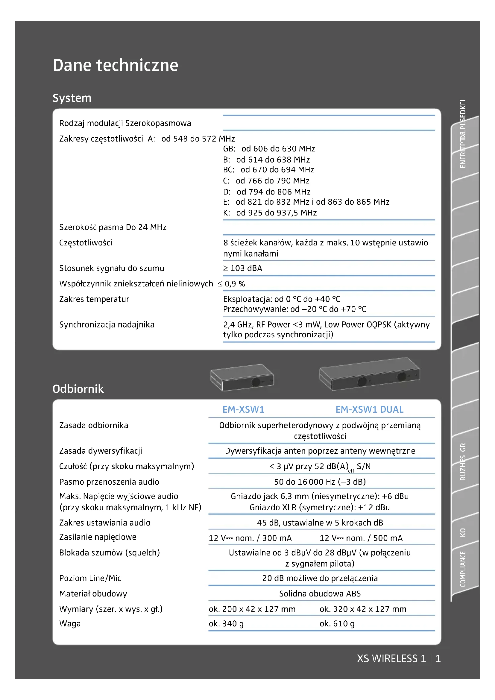 COMPLIANCE Dane techniczne Rodzaj modulacji Szerokopasmowa Zakresy częstotliwości A: od 548 do 572 MHz GB: od 606 do 630 MHz B: od 614 do 638 MHz BC: od 670 do 694 MHz C: od 766 do 790 MHz D: od 794 do 806 MHz E: od 821 do 832 MHz i od 863 do 865 MHz K: od 925 do 937,5 MHz Szerokość pasma Do 24 MHz Częstotliwości 8 ścieżek kanałów, każda z maks. 10 wstępnie ustawio- nymi kanałami Stosunek sygnału do szumu ≥ 103 dBA Współczynnik zniekształceń nieliniowych ≤ 0,9 % Zakres temperatur Eksploatacja: od 0 °C do +40 °C Przechowywanie: od –20 °C do +70 °C Synchronizacja nadajnika 2,4 GHz, RF Power <3 mW, Low Power OQPSK (aktywny tylko podczas synchronizacji) System