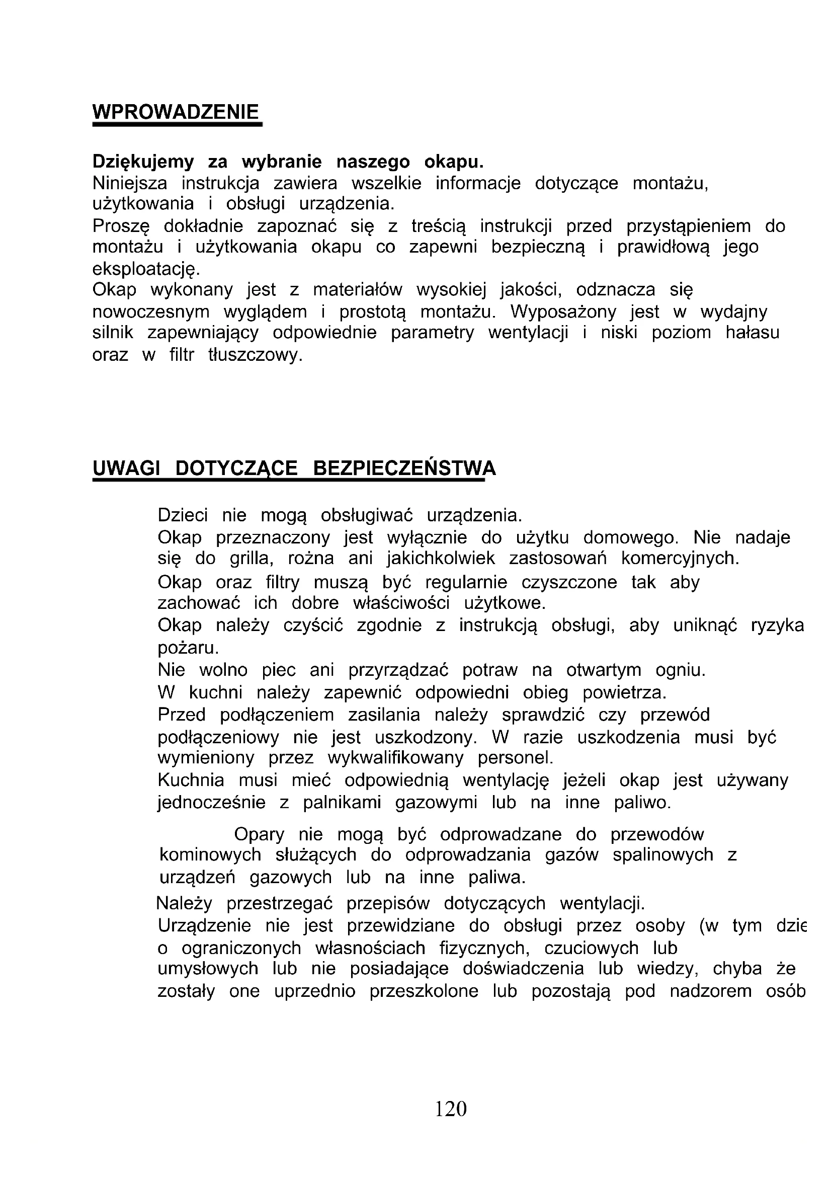 119WPROWADZENIE Dziękujemy za wybranie naszego okapu. Niniejsza instrukcja zawiera wszelkie informacje dotyczące montażu, użytkowania i obsługi urządzenia. Proszę dokładnie zapoznać się z treścią instrukcji przed przystąpieniem do montażu i użytkowania okapu co zapewni bezpieczną i prawidłową jego eksploatację. Okap wykonany jest z materiałów wysokiej jakości, odznacza się nowoczesnym wyglądem i prostotą montażu. Wyposażony jest w wydajny silnik zapewniający odpowiednie parametry wentylacji i niski poziom hałasu oraz w filtr tłuszczowy.