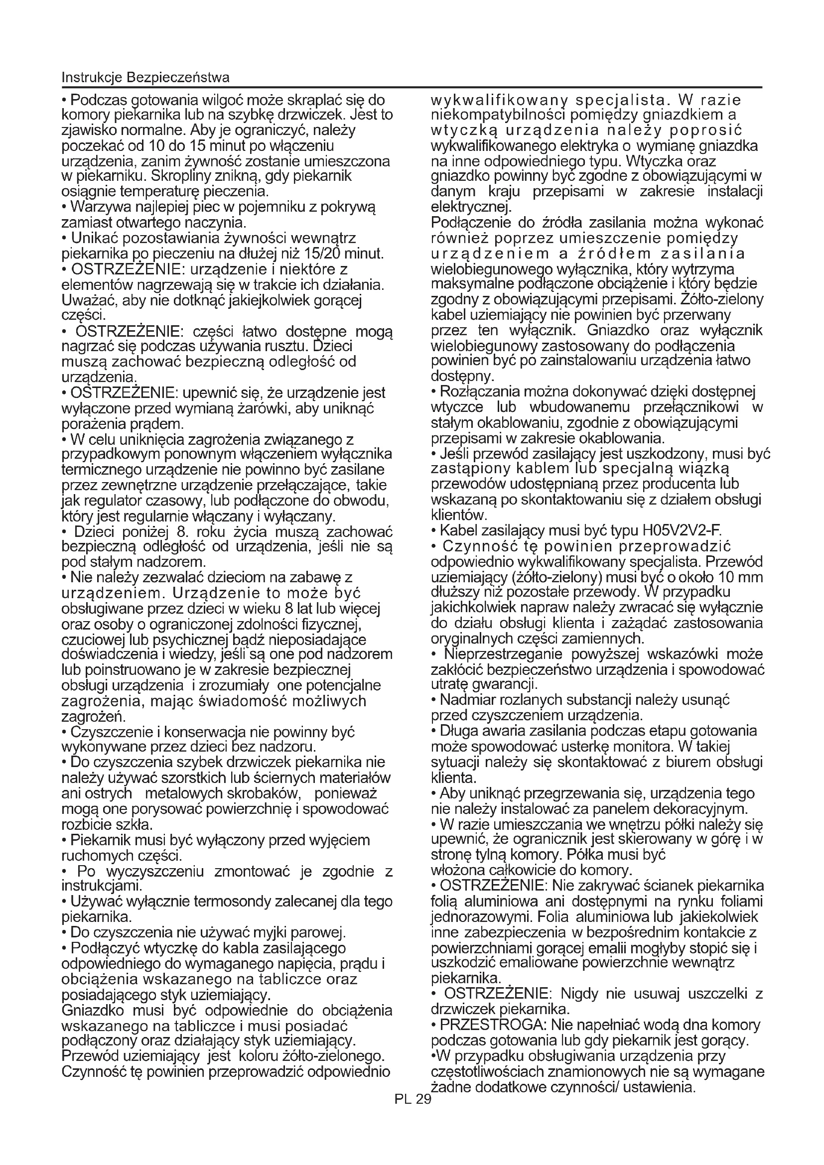 - OSTRZEŻENIE: urządzenie i niektóre z elementów nagrzewają się w trakcie ich działania. Uważać, aby nie dotknąć jakiejkolwiek gorącej części. Instrukcje Bezpieczeństwa PL 29