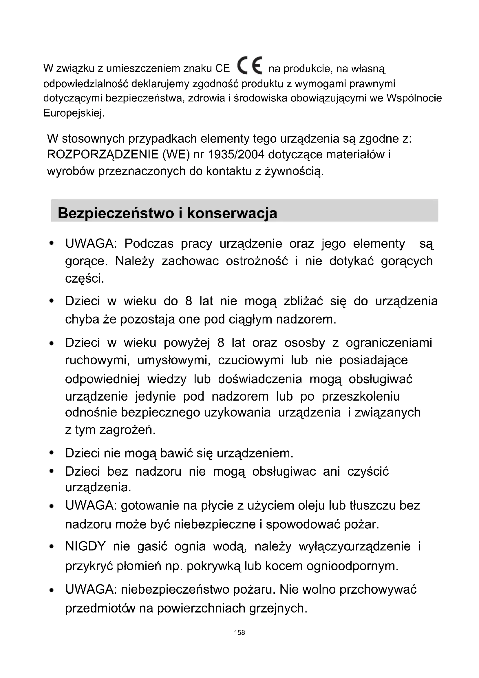 elazna garnek ze stali inox rondel patelnia żelazna 172Czyszczenie i konserwacja Powierzchnia páyty grzejnej moĪe byü czyszczona w nastĊpujący sposób: Rodzaj zabrudzenia Jak czyĞciü Materiaá do czyszczenia lekko brudna ciepáą wodą; nastĊpnie wysuszyü gąbka bardzo brudna ciepáą wodą ü specjalną Ğcieralną gąbką wirtoceramicznych powierzchniwitroceramicznychosady Nalaü na osad biaáy ocet i wyczyĞciü miĊkką szmatką Īyü specjalny Ğrodek myjący folia przylepna specjalna do witroceramikiStopiony cukier wraz z plastykiem lub aluminium Aby usunąü pozostaáoĞci naleĪy posáuĪyü siĊ specjalnym drapakiem z ostrzem do zabezpieczyü szkáo najlepiej jest uĪywaü produkt na bazie sylikonu) folia przylepna specjalna do witroceramiki Uwaga: przed rozpoczĊciem czyszczenia odáączyü urządzenie z zasilania. Sygalizacja usterek i czynnoĞci kontrolne W momencie pojawienia siĊ nieprawidáowoĞci indukcyjna páyta grzejna wprowadza automatycznie funkcjĊ zabezpieczenia a na wyĞwietlaczu pojawiają siĊ nastĊpujące kody: Problem MoĪliwe przyczyny Rozwiązanie F0/F1/F2 Usterka w wiatraku skontaktowaü siĊ z serwisem F3-F8 Usterka w czujniku temperatury skontaktowaü siĊ z serwisem E1/E2Nieprawidáowe napiĊcieelektryczne sprawdziü czy wáączone jest zasilanie elektryczne. Po sprawdzeniu ponownie wáączyü urządzenie E3/E4 Nieprawidáowa temperatura sprawdziü garnek E5/E6Niewystarczające emitowanie ciepáa po wczeĞniejszym oziĊbieniu ponownie wáączyü urządzenie Jest to tylko lista najczĊĞciej pojawiających siĊ usterek. Zabrania siĊ rozmontowywania indukcyjnej páyty grzejnej we wáasnym zakresie co mogáoby doprowadziü do wyrządzenia wiĊkszych szkód. SERWIS TECHNICZNY Przed wezwaniem serwisu . W przypadku nie dziaáania produktu zalecamy: — sprawdziü czy wtyczka zostaáa prawidáowo wprowadzona do gniazdka sieciowego; — sprawdziü powyĪej przedstawioną tabelĊ usterek. W przypadku gdy nie zostanie wykryta przyczyna nieprawidáowego funkcjonowania naleĪy odáączyü urządzenie bez rozmontowywania go i nastĊpnie skontaktowaü siĊ z Serwisem Technicznym . specjalna g bka do i wysuszy do powierzchni , lub upowierzchni witroceramicznych (aby POLAND POLISH 173Deklaracja specjalna Caáa treĞü niniejszej instrukcji obsáugi zostaáa uwaĪnie sprawdzona. Producent nie bierze na siebie odpowiedzialnoĞci za báedy lub ominiĊcia w fazie wydruku. Producent zastrzega sobie prawo do wprowadzania zmian natury technicznej bez koniecznoĞci wczeĞniejszego powiadomienia. ZdjĊcie produktu odnosi siĊ do jego aktualnej wersji. UWAGA: zabrania siĊ traktowania tego produktu jako odpadów normalnych. Musi on zostaü usuniĊty oddzielnie. Niniejsze urządzenie gospodarstwa domowego wyprodukowane zostaáo zgodnie z dyrektywą europejską 20 12/19/KE dotyczącą zuĪytego sprzĊtu elektrycznego i elektronicznego. Zapewniając wáaĞciwy sposób realizacji niniejszego sprzĊtu w poszanowaniu obowiązujących dyrektyw, uĪytkownik zapobiega jego potencjalnemu niegatywnemu wpáywowi na Ğrodowisko naturalne i zdrowie ludzi, który mógáby byü efektem niewáaĞciwego obchodzenia siĊ z produktem. Symbol ten wskazuje, Īe produkt nie moĪe byü traktowany jako odpady domowe lecz powinien byü przekazany do odpowiedniego punktu zbierającego odpady elektryczne i elektroniczne. Szczegóáowe informacje dotyczące postĊpowania, odzyskiwania i recyklingu niniejszego produktu moĪna uĪyskaü od lokanych sáuĪb odpowiedzialnych za odpady lub w sklepie, w którym zakupiono produkt. 174ɉɪɚɜɢɥɚ ɬɟɯɧɢɤɢ ɛɟɡɨɩɚɫɧɨɫɬɢ ɢ ɬɟɯɨɛɫɥɭɠɢɜɚɧɢɟ ɂɫɩɨɥɶɡɨɜɚɬɶ ɨɬɞɟɥɶɧɵɣ ɩɪɟɞɨɯɪɚɧɢɬɟɥɶɧɵɣ