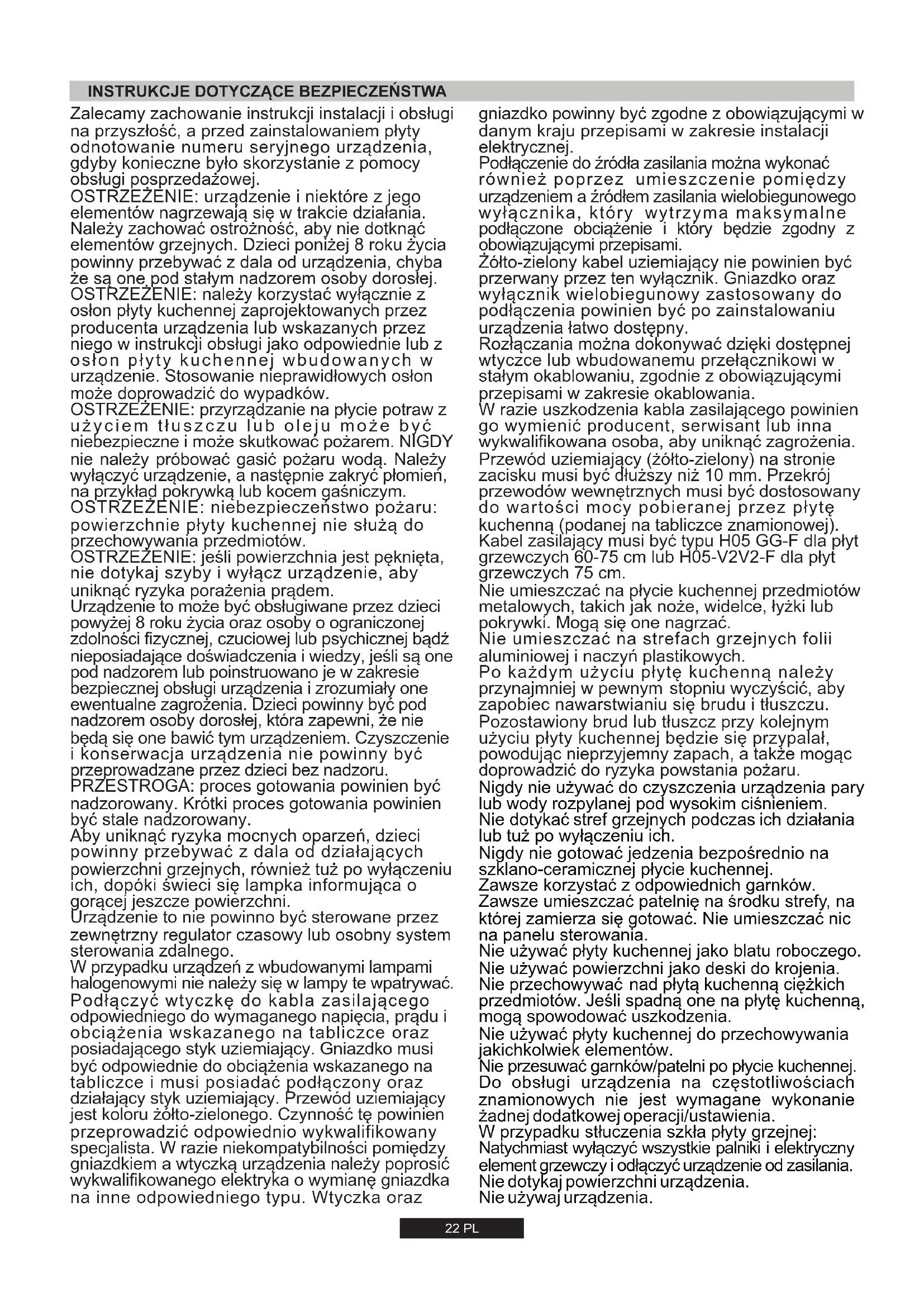814 g/h 220-240V 50/60Hz -22 PL PRZESTROGA: proces gotowania powinien być nadzorowany. Krótki proces gotowania powinien być stale nadzorowany. Urządzenie to nie powinno być sterowane przez zewnętrzny regulator czasowy lub osobny system sterowania zdalnego. Urządzenie to może być obsługiwane przez dzieci powyżej 8 roku życia oraz osoby o ograniczonej zdolności fizycznej, czuciowej lub psychicznej bądź nieposiadające doświadczenia i wiedzy, jeśli są one pod nadzorem lub poinstruowano je w zakresie bezpiecznej obsługi urządzenia i zrozumiały one ewentualne zagrożenia. Dzieci powinny być pod nadzorem osoby dorosłej, która zapewni, że nie będą się one bawić tym urządzeniem. Czyszczenie i konserwacja urządzenia nie powinny być przeprowadzane przez dzieci bez nadzoru. W przypadku urządzeń z wbudowanymi lampami halogenowymi nie należy się w lampy te wpatrywać. Zalecamy zachowanie instrukcji instalacji i obsługi na przyszłość, a przed zainstalowaniem płyty odnotowanie numeru seryjnego urządzenia, gdyby konieczne było skorzystanie z pomocy obsługi posprzedażowej. OSTRZEŻENIE: urządzenie i niektóre z jego elementów nagrzewają się w trakcie działania. Należy zachować ostrożność, aby nie dotknąć elementów grzejnych. Dzieci poniżej 8 roku życia powinny przebywać z dala od urządzenia, chyba że są one pod stałym nadzorem osoby dorosłej. OSTRZEŻENIE: należy korzystać wyłącznie z osłon płyty kuchennej zaprojektowanych przez producenta urządzenia lub wskazanych przez niego w instrukcji obsługi jako odpowiednie lub z osłon płyty kuchennej wbudowanych w urządzenie. Stosowanie nieprawidłowych osłon może doprowadzić do wypadków. OSTRZEŻENIE: niebezpieczeństwo pożaru: powierzchnie płyty kuchennej nie służą do przechowywania przedmiotów. OSTRZEŻENIE: przyrządzanie na płycie potraw z użyciem tłuszczu lub oleju może być niebezpieczne i może skutkować pożarem. NIGDY nie należy próbować gasić pożaru wodą. Należy wyłączyć urządzenie, a następnie zakryć płomień, na przykład pokrywką lub kocem gaśniczym. OSTRZEŻENIE: jeśli powierzchnia jest pęknięta, nie dotykaj szyby i wyłącz urządzenie, aby uniknąć ryzyka porażenia prądem. Aby uniknąć ryzyka mocnych oparzeń, dzieci powinny przebywać z dala od działających powierzchni grzejnych, również tuż po wyłączeniu ich, dopóki świeci się lampka informująca o gorącej jeszcze powierzchni. Podłączyć wtyczkę do kabla zasilającego odpowiedniego do wymaganego napięcia, prądu i obciążenia wskazanego na tabliczce oraz posiadającego styk uziemiający. Gniazdko musi być odpowiednie do obciążenia wskazanego na tabliczce i musi posiadać podłączony oraz działający styk uziemiający. Przewód uziemiający jest koloru żółto-zielonego. Czynność tę powinien przeprowadzić odpowiednio wykwalifikowany specjalista. W razie niekompatybilności pomiędzy gniazdkiem a wtyczką urządzenia należy poprosić wykwalifikowanego elektryka o wymianę gniazdka na inne odpowiedniego typu. Wtyczka oraz