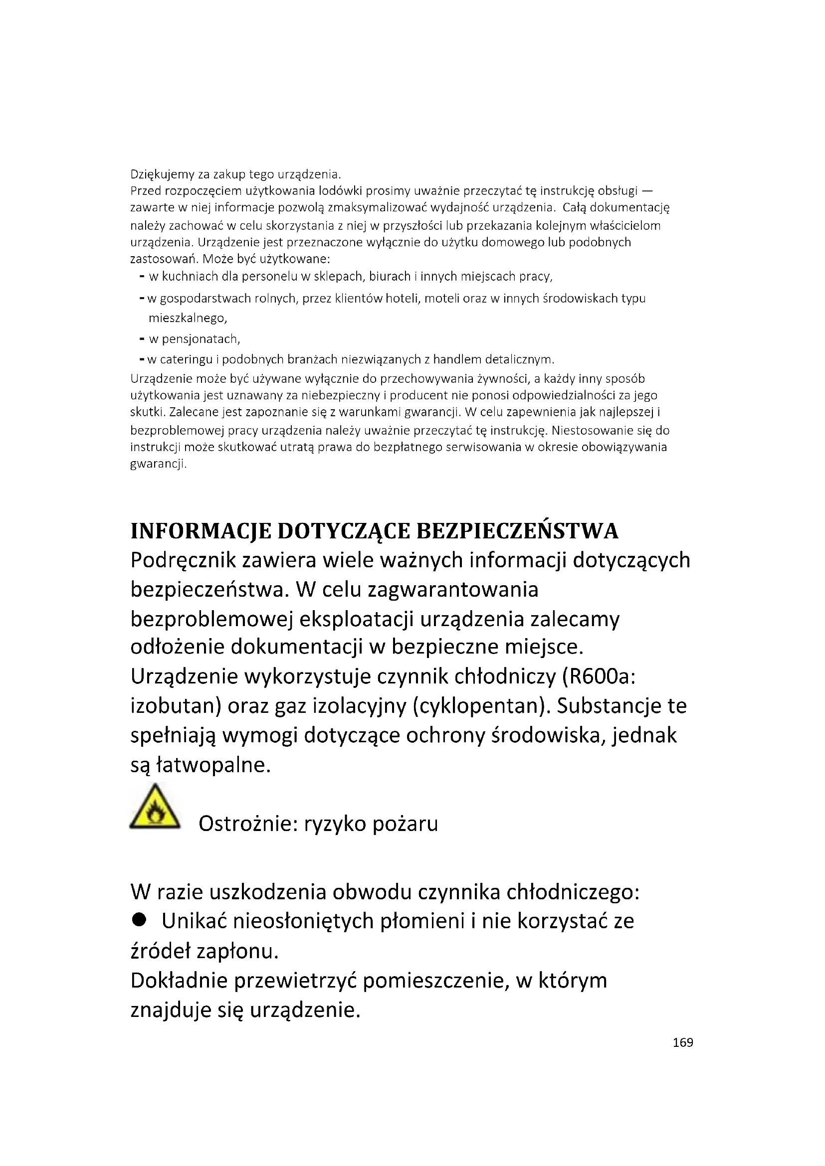 Podręcznik zawiera wiele ważnych informacji dotyczących bezpieczeństwa. W celu zagwarantowania bezproblemowej eksploatacji urządzenia zalecamy odłożenie dokumentacji w bezpieczne miejsce. Urządzenie wykorzystuje czynnik chłodniczy (R600a: izobutan) oraz gaz izolacyjny (cyklopentan). Substancje te spełniają wymogi dotyczące ochrony środowiska, jednak są łatwopalne. Ostrożnie: ryzyko pożaru W razie uszkodzenia obwodu czynnika chłodniczego: Unikać nieosłoniętych płomieni i nie korzystać ze źródeł zapłonu. Dokładnie przewietrzyć pomieszczenie, w którym znajduje się urządzenie.170 OSTRZEŻENIE! Podczas czyszczenia/przenoszenia zamrażarki należy zachować ostrożność, tak aby nie dotknąć znajdujących się z tyłu metalowych przewodów sprężarki, ponieważ grozi to obrażeniami palców lub dłoni albo uszkodzeniem produktu. Urządzenie nie jest przystosowane do ustawiania jedno na drugim razem z innymi urządzeniami. Nie należy siadać ani stawać na urządzeniu, ponieważ nie jest ono zaprojektowane do takich zastosowań. Grozi to odniesieniem urazów lub uszkodzeniem urządzenia. Podczas podnoszenia/przenoszenia zamrażarki należy uważać, żeby nie przygnieść kabla zasilającego, ponieważ grozi to jego przerwaniem lub uszkodzeniem. W trakcie ustawiania urządzenia należy uważać, żeby nie uszkodzić podłoża, rur, ścian itp. Nie przesuwać urządzenia przez ciągnięcie za pokrywę lub uchwyt. Nie pozwalać dzieciom na bawienie się urządzeniem ani na manipulowanie przy jego przełącznikach. Nieprzestrzeganie instrukcji będzie skutkowało zwolnieniem naszej firmy z jakiejkolwiek odpowiedzialności. Nie montować urządzenia w miejscach wilgotnych, zaolejonych, zapylonych ani nie wystawiać go na bezpośrednie działanie światła słonecznego ani wody.171 Nie montować urządzenia w pobliżu urządzeń grzewczych lub materiałów łatwopalnych. W razie awarii zasilania nie należy otwierać pokrywy. Awarie trwające krócej niż 20 godzin nie powinny wpływać na zamrożoną żywność. W przypadku dłuższych awarii żywność należy sprawdzić i niezwłocznie spożyć lub ugotować i ponownie zamrozić. Utrudnione otwieranie pokrywy zamrażarki skrzyniowej zaraz po jej zamknięciu nie świadczy o awarii. Przyczyną jest różnica ciśnień, która po kilku minutach powinna się wyrównać, umożliwiając normalne otwarcie urządzenia. Nie należy podłączać urządzenia do zasilania, dopóki wszystkie opakowania oraz elementy zabezpieczające podczas transportu nie zostaną usunięte. Jeśli zamrażarka była transportowana w pozycji poziomej, przed podłączeniem należy odczekać co najmniej 4 godziny, żeby umożliwić ścieknięcie oleju sprężarkowego. Zamrażarka może być wykorzystywana wyłącznie zgodnie z jej przeznaczeniem (tzn. do przechowywania i zamrażania żywności). Nie przechowywać leków ani materiałów badawczych w chłodziarce do wina. Jeżeli przechowywane mają być materiały wymagające ścisłej kontroli temperatury przechowywania, mogą ulec one zepsuciu lub może wystąpić172 niekontrolowana reakcja powodująca ryzyko. Przed wykonaniem jakichkolwiek prac przy urządzeniu należy wyjąć wtyczkę zasilania z gniazdka. Przy odbiorze należy sprawdzić, czy produkt nie jest uszkodzony i czy wszystkie części oraz akcesoria są w idealnym stanie. W przypadku stwierdzenia nieszczelności układu chłodzącego nie dotykać gniazdka ściennego i nie używać nieosłoniętych płomieni. Otworzyć okno i wpuścić powietrze do pomieszczenia. Skontaktować się z serwisem w celu przeprowadzenia naprawy. Nie używać przedłużaczy ani dodatkowych połączeń. Nie naciągać nadmiernie i nie zaginać kabla zasilającego ani nie dotykać wtyczki mokrymi rękami. Nie uszkadzać wtyczki ani przewodu zasilającego, ponieważ może to spowodować porażenie elektryczne lub pożar. Nie umieszczać ani nie przechowywać w urządzeniu substancji łatwopalnych i wysoce lotnych takich jak eter, benzyna, gaz LPG, gaz propanowy, aerozole, kleje, czysty alkohol itp. Materiały te mogą spowodować wybuch. Nie używać ani nie przechowywać w pobliżu chłodziarki do wina łatwopalnych aerozoli takich jak farba w sprayu. Może to doprowadzić do173 wybuchu lub pożaru. Nie stawiać na urządzeniu przedmiotów lub pojemników napełnionych wodą. Odradzamy korzystanie z przedłużaczy i rozgałęźników. Nie należy utylizować urządzenia przez spalenie. Należy uważać, żeby nie uszkodzić obwodu chłodniczego/rur urządzenia podczas transportu i użytkowania. W przypadku stwierdzenia uszkodzeń nie narażać urządzenia na kontakt z ogniem lub potencjalnymi źródłami zapłonu. Przewietrzyć pomieszczenie, w którym znajduje się urządzenie. Układ chłodzący znajdujący się z tyłu i wewnątrz chłodziarki do wina zawiera czynnik chłodniczy. W związku z tym należy unikać uszkadzania rurek. Nie używać urządzeń elektrycznych wewnątrz komór do przechowywania żywności, chyba że są to urządzenia typu zalecanego przez producenta. Nie uszkadzać obwodu chłodniczego. Nie używać urządzeń mechanicznych ani żadnych innych środków przyspieszania procesu rozmrażania, chyba że są one zalecane przez producenta. Nie używać urządzeń elektrycznych wewnątrz komór do przechowywania żywności, chyba że są to urządzenia typu zalecanego przez producenta. Należy dbać o drożność otworów wentylacyjnych w obudowie urządzenia wolnostojącego lub w174 konstrukcji do zabudowy. Nie usuwać szronu przy pomocy spiczastych lub ostrych przedmiotów takich jak noże lub widelce. Nigdy nie używać do rozmrażania suszarek do włosów, grzejników elektrycznych ani podobnych urządzeń. Nie próbować zeskrobywać powstałego szronu ani lodu nożem ani innym ostrym przedmiotem. W ten sposób można doprowadzić do uszkodzenia obwodu chłodniczego i wycieku czynnika chłodniczego, który może spowodować po