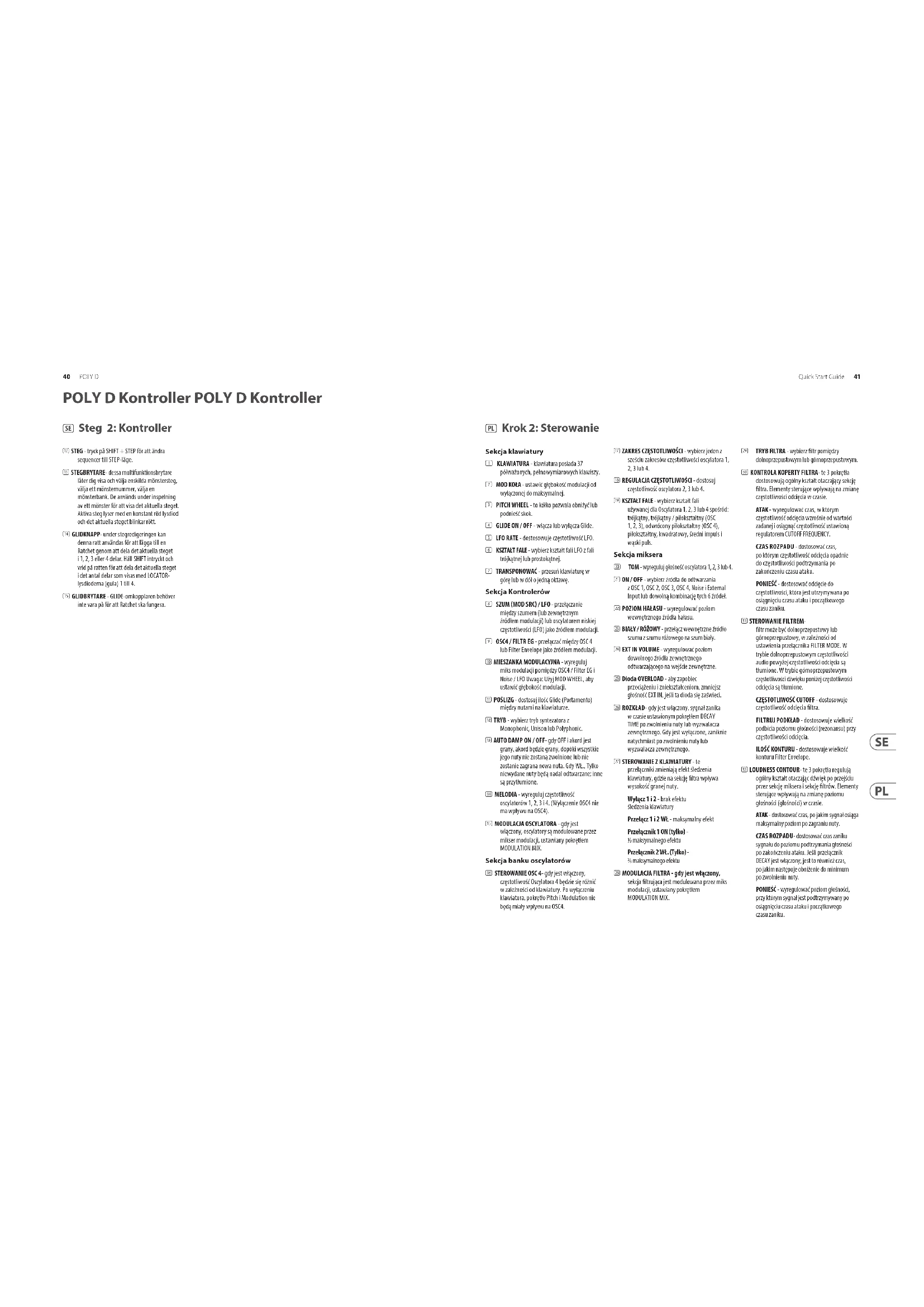 aby zwiększyć numer banku. (6) ZMIANA- Służy do uzyskania dostępu do drugorzędnych funkcji niektórych innych kontrolek sekwencera, takich jak SET END, BANK, SWING, KYDB i STEP. Przytrzymaj SHIFT i drugi przełącznik w tym samym czasie. Na przykład SHIFT + PATTERN (BANK) pokaże aktualny numer BANKU na diodach LOCATOR. (7) STRONA- każdy wzór może mieć do 32 kroków długości. Ten przełącznik umożliwia wyświetlenie każdej z 4 stron po 8 kroków. Diody LED LOKALIZACJI od 1 do 4 pokazują, na której stronie się znajdujesz. Jeśli odtwarzany jest wzór, diody STEP pokażą kroki używane na bieżącej stronie. (8) PLAY / STOP- uruchamia lub zatrzymuje odtwarzanie paternu. Jeśli w tym samym czasie przytrzymany jest SHIFT, rozpoczyna się procedura zapisywania wzoru, opisana poniżej. (9) REC- naciśnij, aby rozpocząć nagrywanie nowego wzoru. Jest to również używane z SHIFT podczas procedury zapisywania wzoru. (10) LOKALIZACJA - te wielokolorowe diody LED pokazują różne szczegóły, takie jak aktualny numer WZORU, aktualny numer BANKU, aktualna STRONA i DŁUGOŚĆ BRAMY. (11) KYBD - naciśnij SHIFT + KYBD, aby zmienić sekwencer w tryb klawiatury. (12) KROK - wciśnij SHIFT + STEP, aby zmienić sekwencer w tryb STEP. (13) PRZEŁĄCZNIKI KROKOWE- te wielofunkcyjne przełączniki umożliwiają przeglądanie i wybieranie poszczególnych kroków paternu, wybieranie numeru paternu, wybieranie banku paternów. Są używane podczas nagrywania wzorca, aby pokazać aktualny krok. Aktywne stopnie są podświetlone ciągłą czerwoną diodą LED, a aktualny stopień miga na czerwono. (14) POKRĘTŁO GLIDE- podczas edycji kroku, to pokrętło może być użyte do dodania Ratchet poprzez podzielenie bieżącego kroku na 1, 2, 3 lub 4 części. Przytrzymaj SHIFT i obróć pokrętło, aby podzielić bieżący krok na liczbę części pokazaną przez diody LOCATOR (żółte) od 1 do 4. (15) PRZEŁĄCZNIK SCHODÓW - przełącznik GLIDE nie musi być włączony, aby Ratchet działał.44 POLY D Quick Start Guide 45 (EN) Step 3: Getting started POLY D Getting started OVERVIEW This ‘getting started’ guide will help you set up the POLY D analog synthesizer and briey introduce its capabilities. CONNECTION To connect the POLY D to your system, please consult the connection guide earlier in this document. SOFTWARE SETUP The POLY D is a USB Class Compliant MIDI device, and so no driver installation is required. The POLY D does not require any additional drivers to work with Windows and MacOS. The "Synthtool.exe" application allows you to select the MIDI channel number and to set and adjust various parameters of the POLY D to suit your preferences. SysEx commands can also be used. Please see the information later in this manual. HARDWARE SETUP Make all the connections in your system. Apply power to the POLY D using the supplied power adapter only. Ensure your sound system is turned down. Turn on the POLY D power switch.