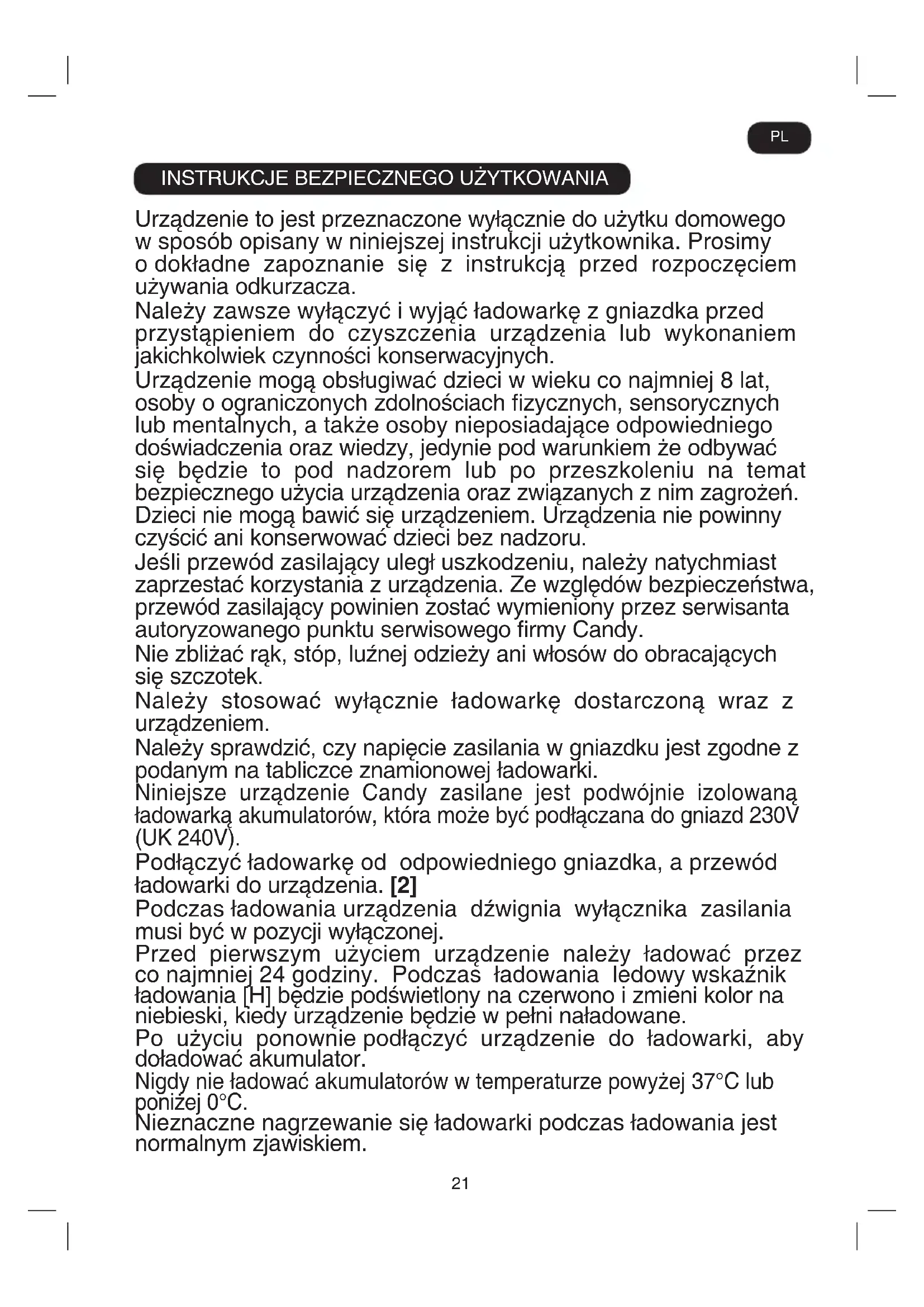 Urządzenie to jest przeznaczone wyłącznie do użytku domowego w sposób opisany w niniejszej instrukcji użytkownika. Prosimy o dokładne zapoznanie się z instrukcją przed rozpoczęciem używania odkurzacza. Należy zawsze wyłączyć i wyjąć ładowarkę z gniazdka przed przystąpieniem do czyszczenia urządzenia lub wykonaniem jakichkolwiek czynności konserwacyjnych. Urządzenie mogą obsługiwać dzieci w wieku co najmniej 8 lat, osoby o ograniczonych zdolnościach zycznych, sensorycznych lub mentalnych, a także osoby nieposiadające odpowiedniego doświadczenia oraz wiedzy, jedynie pod warunkiem że odbywać się będzie to pod nadzorem lub po przeszkoleniu na temat bezpiecznego użycia urządzenia oraz związanych z nim zagrożeń. Dzieci nie mogą bawić się urządzeniem. Urządzenia nie powinny czyścić ani konserwować dzieci bez nadzoru. Jeśli przewód zasilający uległ uszkodzeniu, należy natychmiast zaprzestać korzystania z urządzenia. Ze względów bezpieczeństwa, przewód zasilający powinien zostać wymieniony przez serwisanta autoryzowanego punktu serwisowego rmy Candy. Nie zbliżać rąk, stóp, luźnej odzieży ani włosów do obracających się szczotek. Należy stosować wyłącznie ładowarkę dostarczoną wraz z urządzeniem. Należy sprawdzić, czy napięcie zasilania w gniazdku jest zgodne z podanym na tabliczce znamionowej ładowarki. Niniejsze urządzenie Candy zasilane jest podwójnie izolowaną ładowarką akumulatorów, która może być podłączana do gniazd 230V (UK 240V). Podłączyć ładowarkę od odpowiedniego gniazdka, a przewód ładowarki do urządzenia. [2] Podczas ładowania urządzenia dźwignia wyłącznika zasilania musi być w pozycji wyłączonej. Przed pierwszym użyciem urządzenie należy ładować przez co najmniej 24 godziny. Podczas ładowania ledowy wskaźnik ładowania [H] będzie podświetlony na czerwono i zmieni kolor na niebieski, kiedy urządzenie będzie w pełni naładowane. Po użyciu ponownie podłączyć urządzenie do ładowarki, aby doładować akumulator. Nigdy nie ładować akumulatorów w temperaturze powyżej 37°C lub poniżej 0°C. Nieznaczne nagrzewanie się ładowarki podczas ładowania jest normalnym zjawiskiem. PL22 NIE wyjmować wtyczki ładowarki z gniazdka, ciągnąc za przewód zasilający. W razie dłuższej nieobecności (urlop itp.) odłączyć ładowarkę od zasilania. Po dłuższej przerwie w eksploatacji urządzenie należy doładować przed użyciem, ponieważ bezczynność powoduje rozładowanie akumulatorów. Jeżeli urządzenie ma być złomowane, należy z niego najpierw usunąć akumulatory. Podczas wyjmowania akumulatora urządzenie musi być odłączone od zasilania. Akumulatory należy utylizować w sposób bezpieczny dla środowiska. Włączyć urządzenie i pozwolić, aby pracowało aż do całkowitego wyczerpania akumulatorów. Zużyte akumulatory należy przekazać do recyklingu. Nie należy ich wyrzucać ze śmieciami domowymi. W celu wyjęcia akumulatorów należy skontaktować się z Centrum Serwisowym Candy lub postępować zgodnie z następującymi instrukcjami. WAŻNE: Przed usunięciem należy całkowicie rozładować akumulatory. Włączyć odkurzacz i pozwolić, aby pracował aż do pełnego wyczerpania akumulatorów. Wyjąć wtyczkę przewodu ładowarki z urządzenia. Przesunąć do tyłu przycisk zwalniający zestaw akumulatorów, a zestaw automatycznie nieco się wysunie. [14a] Powoli wysunąć zestaw akumulatorów ze szczeliny. [14b] Uwaga: W razie napotkania jakichkolwiek problemów z demontażem jednostki lub w razie konieczności uzyskania dodatkowych informacji na temat sposobu utylizacji, złomowania i recyklingu urządzenia należy skontaktować się z lokalnym urzędem gminy lub komunalnym zakładem utylizacji odpadów. Należy korzystać wyłącznie z końcówek, materiałów eksploatacyjnych oraz części zamiennych zalecanych lub dostarczonych przez rmę Candy. Ładunki elektrostatyczne: Odkurzanie niektórych dywanów może powodować niewielkie naelektryzowanie się urządzenia. Tego rodzaju ładunki elektrostatyczne nie stanowią zagrożenia dla zdrowia. Nie używać urządzenia na zewnątrz domu, do odkurzania mokrych powierzchni ani do zbierania wody. Nie wolno wciągać twardych lub ostrych przedmiotów, zapałek, gorącego popiołu, niedopałków papierosów ani innych podobnych przedmiotów. Nie spryskiwać łatwopalnymi cieczami, środkami czyszczącymi w aerozolu ani parą. Nie stąpać po przewodzie zasilającym podczas korzystania z urządzenia i nie wyjmować wtyczki, ciągnąc za przewód zasilający. Nie wolno kontynuować eksploatacji uszkodzonego urządzenia lub ładowarki.